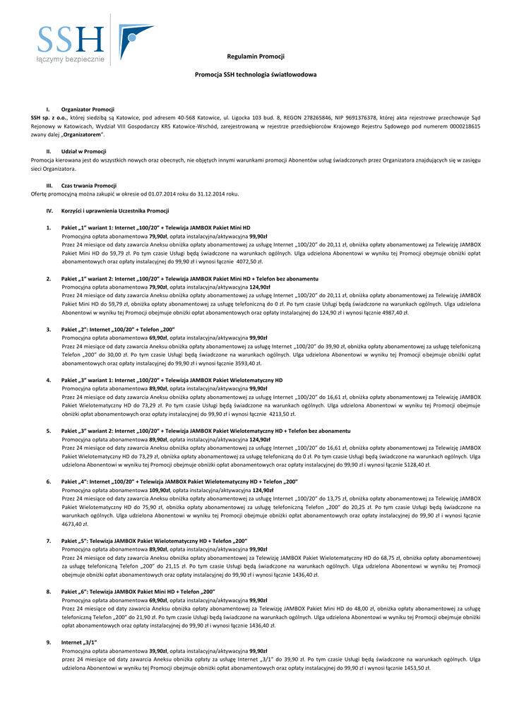 Regulamin Promocji Promocja SSH technologia światłowodowa I. Organizator Promocji SSH sp. z o.o., której siedzibą są Katowice, pod adresem 40-568 Katowice, ul. Ligocka 103 bud. 8, REGON 278265846, NIP 9691376378, której akta rejestrowe przechowuje Sąd Rejonowy w Katowicach, Wydział VIII Gospodarczy KRS Katowice-Wschód, zarejestrowaną w rejestrze przedsiębiorców Krajowego Rejestru Sądowego pod numerem 0000218615 zwany dalej „Organizatorem”. II. Udział w Promocji Promocja kierowana jest do wszystkich nowych oraz obecnych, nie objętych innymi warunkami promocji Abonentów usług świadczonych przez Organizatora znajdujących się w zasięgu sieci Organizatora. III. Czas trwania Promocji Ofertę promocyjną można zakupić w okresie od 01.07.2014 roku do 31.12.2014 roku. IV. Korzyści i uprawnienia Uczestnika Promocji 1. Pakiet „1” wariant 1: Internet „100/20” + Telewizja JAMBOX Pakiet Mini HD Promocyjna opłata abonamentowa 79,90zł, opłata instalacyjna/aktywacyjna 99,90zł Przez 24 miesiące od daty zawarcia Aneksu obniżka opłaty abonamentowej za usługę Internet „100/20” do 20,11 zł, obniżka opłaty abonamentowej za Telewizję JAMBOX Pakiet Mini HD do 59,79 zł. Po tym czasie Usługi będą świadczone na warunkach ogólnych. Ulga udzielona Abonentowi w wyniku tej Promocji obejmuje obniżki opłat abonamentowych oraz opłaty instalacyjnej do 99,90 zł i wynosi łącznie 4072,50 zł. 2. Pakiet „1” wariant 2: Internet „100/20” + Telewizja JAMBOX Pakiet Mini HD + Telefon bez abonamentu Promocyjna opłata abonamentowa 79,90zł, opłata instalacyjna/aktywacyjna 124,90zł Przez 24 miesiące od daty zawarcia Aneksu obniżka opłaty abonamentowej za usługę Internet „100/20” do 20,11 zł, obniżka opłaty abonamentowej za Telewizję JAMBOX Pakiet Mini HD do 59,79 zł, obniżka opłaty abonamentowej za usługę telefoniczną do 0 zł. Po tym czasie Usługi będą świadczone na warunkach ogólnych. Ulga udzielona Abonentowi w wyniku tej Promocji obejmuje obniżki opłat abonamentowych oraz opłaty instalacyjnej do 124,90 zł i wynosi łącznie 4987,40 zł. 3. Pakiet „2”: Internet „100/20” + Telefon „200” Promocyjna opłata abonamentowa 69,90zł, opłata instalacyjna/aktywacyjna 99,90zł Przez 24 miesiące od daty zawarcia Aneksu obniżka opłaty abonamentowej za usługę Internet „100/20” do 39,90 zł, obniżka opłaty abonamentowej za usługę telefoniczną Telefon „200” do 30,00 zł. Po tym czasie Usługi będą świadczone na warunkach ogólnych. Ulga udzielona Abonentowi w wyniku tej Promocji o bejmuje obniżki opłat abonamentowych oraz opłaty instalacyjnej do 99,90 zł i wynosi łącznie 3593,40 zł. 4. Pakiet „3” wariant 1: Internet „100/20” + Telewizja JAMBOX Pakiet Wielotematyczny HD Promocyjna opłata abonamentowa 89,90zł, opłata instalacyjna/aktywacyjna 99,90zł Przez 24 miesiące od daty zawarcia Aneksu obniżka opłaty abonamentowej za usługę Internet „100/20” do 16,61 zł, obniżka opłaty abonamentowej za Telewizję JAMBOX Pakiet Wielotematyczny HD do 73,29 zł. Po tym czasie Usługi będą świadczone na warunkach ogólnych. Ulga udzielona Abonentowi w wyniku tej Promocji obejmuje obniżki opłat abonamentowych oraz opłaty instalacyjnej do 99,90 zł i wynosi łącznie 4213,50 zł. 5. Pakiet „3” wariant 2: Internet „100/20” + Telewizja JAMBOX Pakiet Wielotematyczny HD + Telefon bez abonamentu Promocyjna opłata abonamentowa 89,90zł, opłata instalacyjna/aktywacyjna 124,90zł Przez 24 miesiące od daty zawarcia Aneksu obniżka opłaty abonamentowej za usługę Internet „100/20” do 16,61 zł, obniżka opłaty abonamentowej za Telewizję JAMBOX Pakiet Wielotematyczny HD do 73,29 zł, obniżka opłaty abonamentowej za usługę telefoniczną do 0 zł. Po tym czasie Usługi będą świadczone na warunkach ogólnych. Ulga udzielona Abonentowi w wyniku tej Promocji obejmuje obniżki opłat abonamentowych oraz opłaty instalacyjnej do 99,90 zł i wynosi łącznie 5128,40 zł. 6. Pakiet „4”: Internet „100/20” + Telewizja JAMBOX Pakiet Wielotematyczny HD + Telefon „200” Promocyjna opłata abonamentowa 109,90zł, opłata instalacyjna/aktywacyjna 124,90zł Przez 24 miesiące od daty zawarcia Aneksu obniżka opłaty abonamentowej za usługę Internet „100/20” do 13,75 zł, obniżka opłaty abonamentowej za Telewizję JAMBOX Pakiet Wielotematyczny HD do 75,90 zł, obniżka opłaty abonamentowej za usługę telefoniczną Telefon „200” do 20,25 zł. Po tym czasie Usługi będą świadczone na warunkach ogólnych. Ulga udzielona Abonentowi w wyniku tej Promocji obejmuje obniżki opłat abonamentowych oraz opłaty instalacyjnej do 99,90 zł i wynosi łącznie 4673,40 zł. 7. Pakiet „5”: Telewizja JAMBOX Pakiet Wielotematyczny HD + Telefon „200” Promocyjna opłata abonamentowa 89,90zł, opłata instalacyjna/aktywacyjna 99,90zł Przez 24 miesiące od daty zawarcia Aneksu obniżka opłaty abonamentowej za Telewizję JAMBOX Pakiet Wielotematyczny HD do 68,75 zł, obniżka opłaty abonamentowej za usługę telefoniczną Telefon „200” do 21,15 zł. Po tym czasie Usługi będą świadczone na warunkach ogólnych. Ulga udzielona Abonentowi w wyniku tej Promocji obejmuje obniżki opłat abonamentowych oraz opłaty instalacyjnej do 99,90 zł i wynosi łącznie 1436,40 zł. 8. Pakiet „6”: Telewizja JAMBOX Pakiet Mini HD + Telefon „200” Promocyjna opłata abonamentowa 69,90zł, opłata instalacyjna/aktywacyjna 99,90zł Przez 24 miesiące od daty zawarcia Aneksu obniżka opłaty abonamentowej za Telewizję JAMBOX Pakiet Mini HD do 48,00 zł, obniżka opłaty abonamentowej za usługę telefoniczną Telefon „200” do 21,90 zł. Po tym czasie Usługi będą świadczone na warunkach ogólnych. Ulga udzielona Abonentowi w wyniku tej Promocji obejmuje obniżki opłat abonamentowych oraz opłaty instalacyjnej do 99,90 zł i wynosi łącznie 1436,40 zł. 9. Internet „3/1” Prom