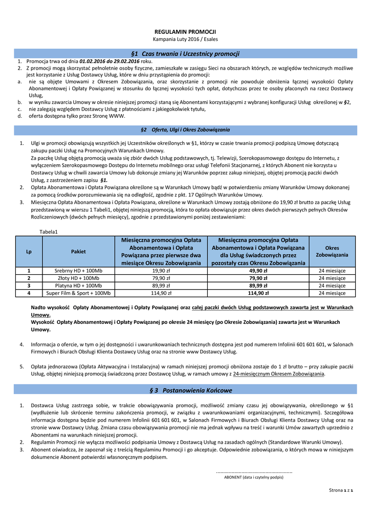 REGULAMIN PROMOCJI Kampania Luty 2016 / Esales §1 Czas trwania i Uczestnicy promocji 1. Promocja trwa od dnia 01.02.2016 do 29.02.2016 roku. 2. Z promocji mogą skorzystać pełnoletnie osoby fizyczne, zamieszkałe w zasięgu Sieci na obszarach których, ze względów technicznych możliwe jest korzystanie z Usług Dostawcy Usług, które w dniu przystąpienia do promocji: a. nie są objęte Umowami z Okresem Zobowiązania, oraz skorzystanie z promocji nie powoduje obniżenia łącznej wysokości Opłaty Abonamentowej i Opłaty Powiązanej w stosunku do łącznej wysokości tych opłat, dotychczas przez te osoby płaconych na rzecz Dostawcy Usług, b. w wyniku zawarcia Umowy w okresie niniejszej promocji staną się Abonentami korzystającymi z wybranej konfiguracji Usług określonej w §2, c. nie zalegają względem Dostawcy Usług z płatnościami z jakiegokolwiek tytułu, d. oferta dostępna tylko przez Stronę WWW. §2 Oferta, Ulgi i Okres Zobowiązania 1. Ulgi w promocji obowiązują wszystkich jej Uczestników określonych w §1, którzy w czasie trwania promocji podpiszą Umowę dotyczącą zakupu paczki Usług na Promocyjnych Warunkach Umowy. Za paczkę Usług objętą promocją uważa się zbiór dwóch Usług podstawowych, tj. Telewizji, Szerokopasmowego dostępu do Internetu, z wyłączeniem Szerokopasmowego Dostępu do Internetu mobilnego oraz usługi Telefonii Stacjonarnej, z których Abonent nie korzysta u Dostawcy Usług w chwili zawarcia Umowy lub dokonuje zmiany jej Warunków poprzez zakup niniejszej, objętej promocją paczki dwóch Usług, z zastrzeżeniem zapisu §1. Opłata Abonamentowa i Opłata Powiązana określone są w Warunkach Umowy bądź w potwierdzeniu zmiany Warunków Umowy dokonanej za pomocą środków porozumiewania się na odległość, zgodnie z pkt. 17 Ogólnych Warunków Umowy. Miesięczna Opłata Abonamentowa i Opłata Powiązana, określone w Warunkach Umowy zostają obniżone do 19,90 zł brutto za paczkę Usług przedstawioną w wierszu 1 Tabeli1, objętej niniejszą promocją, która to opłata obowiązuje przez okres dwóch pierwszych pełnych Okresów Rozliczeniowych (dwóch pełnych miesięcy), zgodnie z przedstawionymi poniżej zestawieniami: 2. 3. Tabela1 Lp Pakiet Miesięczna promocyjna Opłata Abonamentowa i Opłata Powiązana przez pierwsze dwa miesiące Okresu Zobowiązania 1 2 3 4 Srebrny HD + 100Mb Złoty HD + 100Mb Platyna HD + 100Mb Super Film & Sport + 100Mb 19,90 zł 79,90 zł 89,99 zł 114,90 zł Miesięczna promocyjna Opłata Abonamentowa i Opłata Powiązana dla Usług świadczonych przez pozostały czas Okresu Zobowiązania Okres Zobowiązania 49,90 zł 79,90 zł 89,99 zł 114,90 zł 24 miesiące 24 miesiące 24 miesiące 24 miesiące Nadto wysokość Opłaty Abonamentowej i Opłaty Powiązanej oraz całej paczki dwóch Usług podstawowych zawarta jest w Warunkach Umowy. Wysokość Opłaty Abonamentowej i Opłaty Powiązanej po okresie 24 miesięcy (po Okresie Zobowiązania) zawarta jest w Warunkach Umowy. 4. Informacja o ofercie, w tym o jej dostępności i uwarunkowaniach technicznych dostępna jest pod numerem Infolinii 601 601 601, w Salonach Firmowych i Biurach Obsługi Klienta Dostawcy Usług oraz na stronie www Dostawcy Usług. 5. Opłata jednorazowa (Opłata Aktywacyjna i Instalacyjna) w ramach niniejszej promocji obniżona zostaje do 1 zł brutto – przy zakupie paczki Usług, objętej niniejszą promocją świadczoną przez Dostawcę Usług, w ramach umowy z 24-miesięcznym Okresem Zobowiązania. § 3 Postanowienia Końcowe 1. 2. 3. Dostawca Usług zastrzega sobie, w trakcie obowiązywania promocji, możliwość zmiany czasu jej obowiązywania, określonego w §1 (wydłużenie lub skrócenie terminu zakończenia promocji, w związku z uwarunkowaniami organizacyjnymi, technicznymi). Szczegółowa informacja dostępna będzie pod numerem Infolinii 601 601 601, w Salonach Firmowych i Biurach Obsługi Klienta Dostawcy Usług oraz na stronie www Dostawcy Usług. Zmiana czasu obowiązywania promocji nie ma jednak wpływu na treść i warunki Umów zawartych uprzednio z Abonentami na warunkach niniejszej promocji. Regulamin Promocji nie wyłącza możliwości podpisania Umowy z Dostawcą Usług na zasadach ogólnych (Standardowe Warunki Umowy). Abonent oświadcza, że zapoznał się z treścią Regulaminu Promocji i go akceptuje. Odpowiednie zobowiązania, o których mowa w niniejszym dokumencie Abonent potwierdzi własnoręcznym podpisem. ...................................................... ABONENT (data i czytelny podpis) Strona 1 z 1
