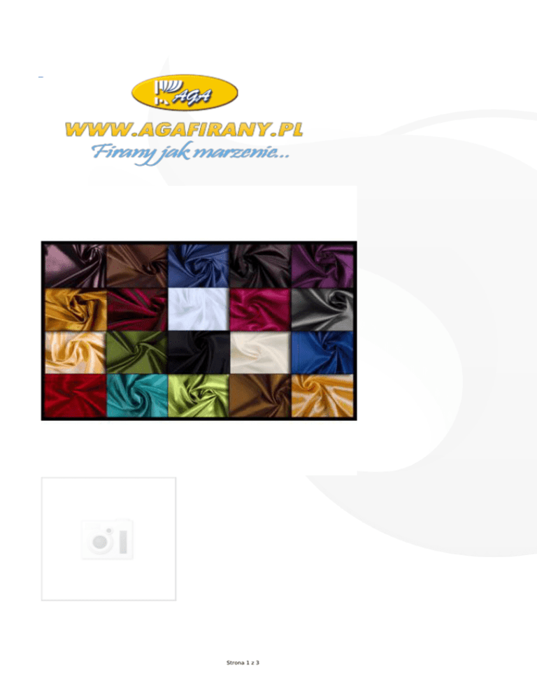 Strona 1 z 3 Przedstawiamy Państwu TAFTĘ gładką w pięknych żywych kolorach !!! 1 szt. tkaniny = 1 mb tkaniny DOSTĘPNE KOLORY (do wyboru z palety poniżej!!!) Tkanina jest bardzo ładna,delikatna nadająca się na: dekoracje okien zasłony sukienki dekoracje ślubne i wieczorowe suknie wieczorowe dekoracje stołów UWAGA !!!! KOLORY TAFTY MOGĄ SIĘ NIEZNACZNIE RÓŻNIĆ OD PRZEDSTAWIONYCH NA ZDJĘCIACH - EFEKT NAŚWIETLENIA LAMPĄ BŁYSKOWĄ !! PO ZAKUPIE PROSZĘ PODAĆ W E-MAILU WYBRANY KOLOR TKANINY !! WYMIARY : SZEROKOŚĆ : 150 +/- 5cm WYSOKOŚĆ : docinamy wg zamówienia, pamiętając że 1 szt.= 1 mb tkaniny. CENA : 1 szt. (1 mb) tkaniny - 9,40 zł Strona 2 z 3 Strona 3 z 3
