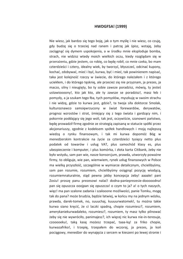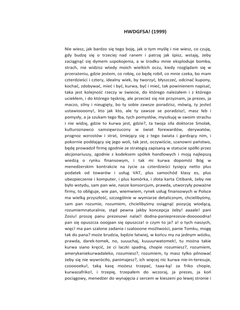 HWDGFSA! (1999) Nie wiesz, jak bardzo się tego boję, jak o tym myślę i nie wiesz, co czuję, gdy budzę się o trzeciej nad ranem i patrzę jak śpisz, wstaję, żeby zaciągnąć się dymem uspokojenia, a w środku mnie eksploduje bomba, strach, nie widzisz wtedy moich wielkich oczu, kiedy rozglądam się w przerażeniu, gdzie jestem, co robię, co będę robił, co mnie czeka, bo mam czterdzieści i cztery, idealny wiek, by tworzyć, błyszczeć, odcinać kupony, kochać, zdobywać, mieć i być, kurwa, być i mieć, tak powinienem napisać, taka jest kolejność rzeczy w świecie, do którego należałem i z którego uciekłem, i do którego tęsknię, ale przecież się nie przyznam, ja prezes, ja maczo, silny i nieugięty, bo ty sobie zawsze poradzisz, mówią, ty jesteś ustawioooony!, kto jak kto, ale ty zawsze se poradzisz!, masz łeb i pomysły, a ja szukam tego łba, tych pomysłów, myszkuję w swoim strachu i nie widzę, gdzie to kurwa jest, gdzie?, ta twoja siła doktorze Smolak, kulturoznawco samsięwrzucony w świat forewardów, derywatów, prognoz wzrostów i strat, śmiejący się z tego świata i gardzący nim, i pokornie poddający się jego woli, tak jest, oczywiście, szanowni państwo, będę prowadził firmę zgodnie ze strategią zapisaną w statucie spółki przez akcjonariuszy, zgodnie z kodeksem spółek handlowych i moją najlepszą wiedzą o rynku finansowym, i tak mi kurwa dopomóż Bóg w menedżerskim kontrakcie na życie za czterdzieści tysięcy netto plus podatek od towarów i usług VAT, plus samochód klasy es, plus ubezpieczenie i komputer, i plus komórka, i złota karta Citibank, żeby nie było wstydu, sam pan wie, nasze konsorcjum, prawda, utworzyły poważne firmy, to obliguje, wie pan, wiemwiem, rynek usług finansowych w Polsce ma wielką przyszłość, szczególnie w wymiarze detalicznym, chcielibyśmy, sam pan rozumie, rozumiem, chcielibyśmy osiągnąć pozycję wiodącą, rozumiemnaturalnie, stąd pewna jakby koncepcja żeby! aaaale! pani Zosiu! proszę panu prezesowi nalać! dodna-panieprezesie-dooooodna! pan się opuszcza ooojpan się opuszcza! o czym to ja? a! o tych naszych, więc! ma pan szalone zadania i szalooone możliwości, panie Tomku, mogę tak do pana? może brudzia, będzie łatwiej, w końcu my na jednym wózku, prawda, darek-tomek, no, suuuchaj, kuuuurwatomek!, tu można takie kurwa siano kręcić, że ci laczki spadną, chopie rozumiesz?, rozumiem, amerykaniekurwadaleko, rozumiesz?, rozumiem, ty masz tylko pilnować żeby się nie wywróciło, panimajesz?, ich więcej nic kurwa nie-in-teresuje, czooooeku!, taką kasę możesz trzepać, taaa-ką! za friko chopie, kurwazafriko!, i trzepię, trzepałem do wczoraj, ja prezes, ja koń pociągowy, menedżer do wynajęcia z sercem w kieszeni po lewej stronie i z wężem w kieszeni po prawej, skurwiel i filantrop, ja-Dzierżyński i Ochojska w jednym, mieszanka Leppera i Kieślowskiego, ja-rozdwojenie jaźni po lekturach Kierkegaarda i Druckera, po kursach w Zachodniopomorskiej Szkole Biznesu, filia w Pile, i osobistych fascynacjach Jerzym Kmitą, u którego mam doktorat, rządziłem, liczyłem, poganiałem, zwalniałem, sięwkurwiałem, ryzykowałem, wyprzedzałem, triumfowałem, spotykałem-i-unikałem, latałem, sprawozdawałem, przestrzegałem, standaryzowałem, promowałem, piłem, chlałem, żarłem, naprzódparłem, łysiałem, wrzodziałem, siwiałem, kapcaniałem, brzuchadostawałem i zapadałem się w tę nicość, w ten bezsens cyfr, kolumn i arkuszy excela, w ten taniec rad, narad, posiedzeń-popierdzeń, w to codzienne nasze dzieńdobrypanieprezesie, dzieńdobrypaninataliocomydzisiajmamy, dzwonił Lesiak, spławić, dzwonili z Omegi, spławić, dzwonili z ministerstwa, łączyć, kawadlapanaprezesa, dziękuję, w tym tkwiłem, żyłem, pławiłem się i szukałem nadziei, że fajnie jest i będzie jeszcze fajniej, że okres przejściowy, dorobię się, dom-samochód-i-spadam, to kurwa nie dla mnie jest, ten kapitalizm, ta wolna amerykanka, to rżnięcie głupa, zabawa w pieniądze dla dużych misiów i ich dziewczyn, których nie brakowało, Lena, Helena, Marlena, Milena, Ola, Jola, Pola, Nikola, imiona, które się mylą, piersi, które się mylą i twarze, które się plączą, i obietnice, które też, wiesz, tkwiłem w tym po uszy, sześć lat, siedemdziesiąt dwa miesiące, dwie kadencje, sam pan rozumie panie prezesie płodozmian świeża krew, w sumie rada nadzorcza nie formułuje przeciwko panu żadnych zarzutów, żaaaadnych! tu nie chodzi o jakieś tego, darekcośty?byliśmynaty!, tak ja rozumiem pańskie rozgoryczenie ale został wprowadzony taki punkt pod obrady zmiana w składzie zarządu spółki i!!! sam pan rozumie co ja mogłem ja już, darek-kuuurwa! jak ty do mnie mówisz?, panie prezesie ja już wiele nie mogę niestety tak więc, kurwarozumiem!, jestem do odstrzału, och! zaraz do odstrzału!, panietomku, z pańskim doświadczeniem! paaanietomku! pannatychmiastcośznajdzie!, jasne, cześć, do widzenia, więc tego się boję, tego PO, tego teraz, tego kiedy będę musiał na nowo, znów, dzień dobry, nazywam się Tomasz Smolak, jestem doktorem kulturoznawstwa, byłem prezesem Grupy Finansowej Spółka Akcyjna w Radomiu, miło nam, proszę zostawić swoje si-wi i list motywacyjny, a co ja kurwa mam za motywację, żeby zostać przedstawicielem handlowym w branży farmaceutycznej, skontaktujemy się z panem na pewno, dziękujędowidzeniapanu, sękju, kurwa, jak się mogą skontaktować, jeśli nie napisałem numeru telefonu?, lat czterdzieści i cztery, skazany na bezrobocie, kredyty, dom pod hipoteką, auto w leasingu, komórki, whisky, nawyki, jezumaryja, co ja mam teraz i do kogo? cześć Stefan, cześć, co u ciebie, akurwanicwyrzucilimniezroboty, to tak jak mnie, bywaj, jakbyś coś miał to wiesz, jasnetomek, będziemy w kontakcie, cześć Michał, suchampana, Tomeksmolak, a-witam, jesteś tam gdzie kiedyś? nie, rzucili mnie do centrali 