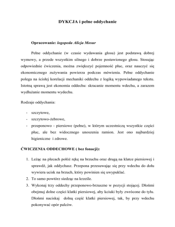 DYKCJA i pełne oddychanie Opracowanie: logopeda Alicja Mosur Pełne oddychanie (w czasie wydawania głosu) jest podstawą dobrej wymowy, a przede wszystkim silnego i dobrze postawionego głosu. Stosując odpowiednie ćwiczenia, można zwiększyć pojemność płuc, oraz nauczyć się ekonomicznego zużywania powierza podczas mówienia. Pełne oddychanie polega na ścisłej korelacji mechaniki oddechu z logiką wypowiadanego tekstu. Istotną sprawą jest ekonomia oddechu: skracanie momentu wdechu, a zarazem wydłużanie momentu wydechu. Rodzaje oddychania: - szczytowe, - szczytowo-żebrowe, - przeponowo - piersiowe (pełne), w którym uczestniczą wszystkie części płuc, ale bez widocznego unoszenia ramion. Jest ono najbardziej higieniczne i zdrowe. ĆWICZENIA ODDECHOWE ( bez fonacji): 1. Leżąc na plecach połóż rękę na brzuchu oraz drugą na klatce piersiowej i sprawdź, jak oddychasz. Przepona przesuwając się przy wdechu do dołu wywiera ucisk na brzuch, który powinien się uwypuklać. 2. To samo powtórz siedząc na krześle. 3. Wykonaj trzy oddechy przeponowo-brzuszne w pozycji stojącej. Dłońmi obejmuj dolne części klatki piersiowej, aby kciuki były zwrócone do tyłu. Dłońmi naciskaj dolną część klatki piersiowej, tak, by przy wdechu pokonywać opór palców. 4. Sprawdź dotykiem ruchy krtani przy połykaniu, mówieniu, śpiewie. 5. Wykonaj następnie ćwiczenia dwufazowe: Wdech: chwytanie powietrza cala przestrzenia jamy ustnej i nosowogardłowej i cała krtanią otwartą do głębi (jak gdyby łapanie wymyślonej, miękkiej piłki powietrznej), albo stopniowe wciąganie tego powietrza jakby przez słomkę. Wydech: wydmuchiwanie przez szczelinę niedomkniętych lub lekko rozwartych ust. Wargi powinny stawiać lekki opór. 6. Oddech całym ciałem. Stoimy w małym rozkroku, w postawie całkowicie rozluźnionej. Skłon swobodny (ręce i głowa zwisają swobodnie w dół ). Jest to pozycja na wydechu. Prostujemy tułów i unosimy ręce w górę nabierając nosem powietrze. W momencie pełnego wdechu znajdujemy się w pozycji wyprostowanej z rękami uniesionymi w górę. 7. Zdmuchiwanie pyłków - Siedzimy na krześle lub stoimy w dowolny sposób. Na określony sygnał zdmuchujemy pyłki z ubrania, rak, ramion, piersi i nóg. Dmuchnięcia są krótkie i niezbyt mocne. 8. Chłodzenie zupy- Ręce ułożone na kształt głębokiego talerza. Dmuchamy ciągłym, długim strumieniem. 9. Jesteśmy balonikiem, piłką, dętką. Wypuszczamy z siebie powietrze (długie sssss...). ZABURZENIA W ODDYCHANIU Częstym zaburzeniem jest oddech płytki, niepełny, z krótka fazą wydechową, co powoduje zwiększenie częstości oddechów. Nieprawidłowe jest także robienie pauz na wdech w połowie frazy. Zakłócenie rytmu oddychania, a także płynności mowy może być spowodowane przez zaburzenia napięcia mięśni. Zaburzenia w oddychaniu występują u jąkających się na skutek skurczów mięśni oddechowych, a przede wszystkim przepony. Nieprawidłowe oddychanie w czasie fonacji obserwuje się także u osób głuchych, zwłaszcza z głuchotą wrodzoną. Na skutek braku kontroli słuchowej mięśnie są zbytnio napięte. Duże nieprawidłowości w oddychaniu występują u dysartryków, tzn. osób mających niedowłady, porażenia i w związku z tym zazwyczaj zwiększone napięcie mięśniowe. Bardzo krotki wydech umożliwia im wypowiedzenie zaledwie paru wyrazów. W powyższych wypadkach ćwiczenia oddechowe powinny być prowadzone w taki sposób, aby ich celem było rozluźnienie mięśni, usuwanie ich napięcia. Celem niżej podanych ćwiczeń jest wyrobienie: a/ oddechu przeponowo-piersiowego. Tego oddychania nie uczy się małych dzieci. Starszym dzieciom można wytłumaczyć działanie przepony i fizjologię oddychania. Oddychania najłatwiej nauczyć się w pozycji leżącej. Ruchy brzucha i klatki piersiowej można kontrolować ręką - Ćwiczący kładzie jedną rękę na brzuchu (w dolnej części klatki piersiowej), a drugą na górnej części klatki piersiowej. Przepona przesuwając się przy wdechu do dołu wywiera nacisk na brzuch, który się uwypukla; przy wydechu przepona wraca do swego położenia poprzedniego, tzn. unosi się, a brzuch opada. - Ćwiczenie wykonujemy kilka razy, wydmuchując powietrze przez usta i wymawiając głoskę [ s ] lub [ f ] . Ręka na brzuchu powinna się unosić, a leżąca na piersiach - poruszać w znacznie mniejszym stopniu. - Należy wykonać kilka oddechów w pozycji stojącej. Ruchy dolnej części klatki piersiowej można kontrolować obejmując dłońmi jej boki tak, aby kciuki były zwrócone do tyłu. Dłonie naciskają dolną część klatki piersiowej; przy wdechu należy pokonać opór palców. - Powyższe ćwiczenia powtarzamy w pozycji siedzącej. Należy siedzieć prosto, ale wygodnie, trzymając ręce na kolanach lub na biodrach. Łączenie oddychania z ruchami rąk i tułowia: - Wdech z jednoczesnym szybkim wzniesieniem rąk do boku, wydech -z powolnym przesuwaniem rak do przodu, aż do zupełnego ich skrzyżowania. - Wdech z jednoczesnym wzniesieniem rak bokiem do góry, a następnie opuszczanie rąk, wydychając powoli powietrze. - Położyć dłonie na karku, przy wdechu przesunąć łokcie silnie do tyłu, przy wydechu łokcie powoli wracają do przodu, aż do ich zetknięcia się. - Ćwiczenia podparcia oddechowego ( nie prowadzimy ich u osób mających wadę wymowy), kiedy w czasie wydechu klatka piersiowa pozostaje w pozycji wdechowej około 6-8 sek., natomiast przepona traci swoje napięcie i powoli unosi się. W ten sposób uzyskujemy także przedłużenia fazy wydechowej. Ciśnienie powietrza znajdującego się poniżej wiązadeł głosowych zwiększa się, wiązadła są dobrze napięte, dzięki czemu glos staje się silniejszy, równiejszy i pełniejszy b/ długiej fazy wydechowej, Aby osiągnąć długą fazę wydechową, która to umiejętność umożliwia wypowiadanie dłuższych fraz, należy wyk