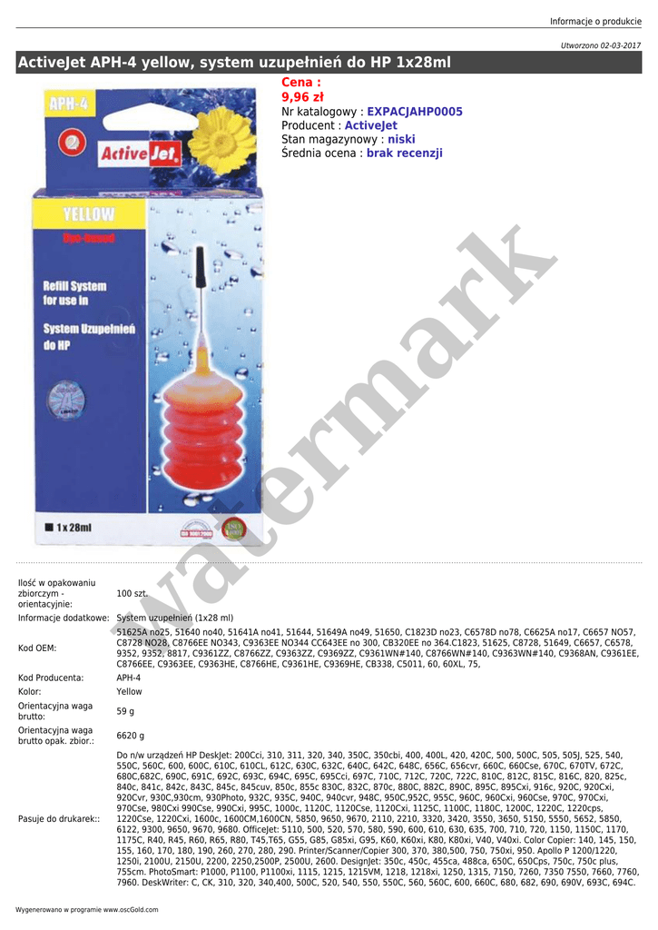 Informacje o produkcie Utworzono 02-03-2017 ActiveJet APH-4 yellow, system uzupełnień do HP 1x28ml Cena : 9,96 zł 100 szt. w Ilość w opakowaniu zbiorczym orientacyjnie: at er m ar k Nr katalogowy : EXPACJAHP0005 Producent : ActiveJet Stan magazynowy : niski Średnia ocena : brak recenzji Informacje dodatkowe: System uzupełnień (1x28 ml) Kod OEM: 51625A no25, 51640 no40, 51641A no41, 51644, 51649A no49, 51650, C1823D no23, C6578D no78, C6625A no17, C6657 NO57, C8728 NO28, C8766EE NO343, C9363EE NO344 CC643EE no 300, CB320EE no 364.C1823, 51625, C8728, 51649, C6657, C6578, 9352, 9352, 8817, C9361ZZ, C8766ZZ, C9363ZZ, C9369ZZ, C9361WN#140, C8766WN#140, C9363WN#140, C9368AN, C9361EE, C8766EE, C9363EE, C9363HE, C8766HE, C9361HE, C9369HE, CB338, C5011, 60, 60XL, 75, Kod Producenta: APH-4 Kolor: Yellow Orientacyjna waga brutto: 59 g Orientacyjna waga brutto opak. zbior.: 6620 g Pasuje do drukarek:: Do n/w urządzeń HP DeskJet: 200Cci, 310, 311, 320, 340, 350C, 350cbi, 400, 400L, 420, 420C, 500, 500C, 505, 505J, 525, 540, 550C, 560C, 600, 600C, 610C, 610CL, 612C, 630C, 632C, 640C, 642C, 648C, 656C, 656cvr, 660C, 660Cse, 670C, 670TV, 672C, 680C,682C, 690C, 691C, 692C, 693C, 694C, 695C, 695Cci, 697C, 710C, 712C, 720C, 722C, 810C, 812C, 815C, 816C, 820, 825c, 840c, 841c, 842c, 843C, 845c, 845cuv, 850c, 855c 830C, 832C, 870c, 880C, 882C, 890C, 895C, 895Cxi, 916c, 920C, 920Cxi, 920Cvr, 930C,930cm, 930Photo, 932C, 935C, 940C, 940cvr, 948C, 950C,952C, 955C, 960C, 960Cxi, 960Cse, 970C, 970Cxi, 970Cse, 980Cxi 990Cse, 990Cxi, 995C, 1000c, 1120C, 1120Cse, 1120Cxi, 1125C, 1100C, 1180C, 1200C, 1220C, 1220cps, 1220Cse, 1220Cxi, 1600c, 1600CM,1600CN, 5850, 9650, 9670, 2110, 2210, 3320, 3420, 3550, 3650, 5150, 5550, 5652, 5850, 6122, 9300, 9650, 9670, 9680. OfficeJet: 5110, 500, 520, 570, 580, 590, 600, 610, 630, 635, 700, 710, 720, 1150, 1150C, 1170, 1175C, R40, R45, R60, R65, R80, T45,T65, G55, G85, G85xi, G95, K60, K60xi, K80, K80xi, V40, V40xi. Color Copier: 140, 145, 150, 155, 160, 170, 180, 190, 260, 270, 280, 290. Printer/Scanner/Copier 300, 370, 380,500, 750, 750xi, 950. Apollo P 1200/1220, 1250i, 2100U, 2150U, 2200, 2250,2500P, 2500U, 2600. DesignJet: 350c, 450c, 455ca, 488ca, 650C, 650Cps, 750c, 750c plus, 755cm. PhotoSmart: P1000, P1100, P1100xi, 1115, 1215, 1215VM, 1218, 1218xi, 1250, 1315, 7150, 7260, 7350 7550, 7660, 7760, 7960. DeskWriter: C, CK, 310, 320, 340,400, 500C, 520, 540, 550, 550C, 560, 560C, 600, 660C, 680, 682, 690, 690V, 693C, 694C. Wygenerowano w programie www.oscGold.com Pojemność: 28 Strona w at er m ar k Ilość w opakowaniu zbiorczym - orientacyjnie: 100 Kod Producenta: APH-4 Orientacyjna waga brutto: 59 Orientacyjna waga brutto opak. zbior.: 6620 Kod OEM: 51625A no25, 51640 no40, 51641A no41, 51644, 51649A no49, 51650, C1823D no23, C6578D no78, C6625A no17, C6657 NO57, C8728 NO28, C8766EE NO343, C9363EE NO344 CC643EE no 300, CB320EE no 364.C1823, 51625, C8728, 51649, C6657, C6578, 9352, 9352, 8817, C9361ZZ, C8766ZZ, C9363ZZ, C9369ZZ, C9361WN#140, C8766WN#140, C9363WN#140, C9368AN, C9361EE, C8766EE, C9363EE, C9363HE, C8766HE, C9361HE, C9369HE, CB338, C5011, 60, 60XL, 75, Kolor: Yellow Pasuje do drukarek:: Do n/w urządzeń HP DeskJet: 200Cci, 310, 311, 320, 340, 350C, 350cbi, 400, 400L, 420, 420C, 500, 500C, 505, 505J, 525, 540, 550C, 560C, 600, 600C, 610C, 610CL, 612C, 630C, 632C, 640C, 642C, 648C, 656C, 656cvr, 660C, 660Cse, 670C, 670TV, 672C, 680C,682C, 690C, 691C, 692C, 693C, 694C, 695C, 695Cci, 697C, 710C, 712C, 720C, 722C, 810C, 812C, 815C, 816C, 820, 825c, 840c, 841c, 842c, 843C, 845c, 845cuv, 850c, 855c 830C, 832C, 870c, 880C, 882C, 890C, 895C, 895Cxi, 916c, 920C, 920Cxi, 920Cvr, 930C,930cm, 930Photo, 932C, 935C, 940C, 940cvr, 948C, 950C,952C, 955C, 960C, 960Cxi, 960Cse, 970C, 970Cxi, 970Cse, 980Cxi 990Cse, 990Cxi, 995C, 1000c, 1120C, 1120Cse, 1120Cxi, 1125C, 1100C, 1180C, 1200C, 1220C, 1220cps, 1220Cse, 1220Cxi, 1600c, 1600CM,1600CN, 5850, 9650, 9670, 2110, 2210, 3320, 3420, 3550, 3650, 5150, 5550, 5652, 5850, 6122, 9300, 9650, 9670, 9680. OfficeJet: 5110, 500, 520, 570, 580, 590, 600, 610, 630, 635, 700, 710, 720, 1150, 1150C, 1170, 1175C, R40, R45, R60, R65, R80, T45,T65, G55, G85, G85xi, G95, K60, K60xi, K80, K80xi, V40, V40xi. Color Copier: 140, 145, 150, 155, 160, 170, 180, 190, 260, 270, 280, 290. Printer/Scanner/Copier 300, 370, 380,500, 750, 750xi, 950. Apollo P 1200/1220, 1250i, 2100U, 2150U, 2200, 2250,2500P, 2500U, 2600. DesignJet: 350c, 450c, 455ca, 488ca, 650C, 650Cps, 750c, 750c plus, 755cm. PhotoSmart: P1000, P1100, P1100xi, 1115, 1215, 1215VM, 1218, 1218xi, 1250, 1315, 7150, 7260, 7350 7550, 7660, 7760, 7960. DeskWriter: C, CK, 310, 320, 340,400, 500C, 520, 540, 550, 550C, 560, 560C, 600, 660C, 680, 682, 690, 690V, 693C, 694C. Informacje dodatkowe: System uzupełnień (1x28 ml) Pojemność: 28