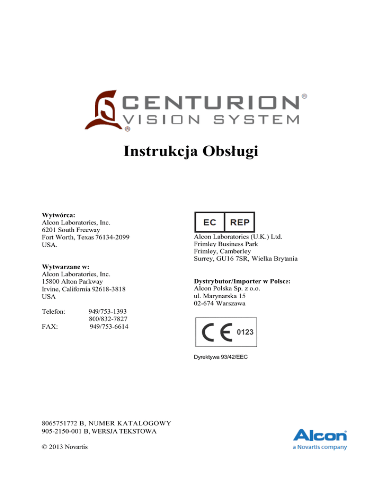 Instrukcja Obsługi Wytwórca: Alcon Laboratories, Inc. 6201 South Freeway Fort Worth, Texas 76134-2099 USA. Wytwarzane w: Alcon Laboratories, Inc. 15800 Alton Parkway Irvine, California 92618-3818 USA Telefon: FAX: Alcon Laboratories (U.K.) Ltd. Frimley Business Park Frimley, Camberley Surrey, GU16 7SR, Wielka Brytania Dystrybutor/Importer w Polsce: Alcon Polska Sp. z o.o. ul. Marynarska 15 02-674 Warszawa 949/753-1393 800/832-7827 949/753-6614 Dyrektywa 93/42/EEC 8065751772 B, NUMER KATALOGOWY 905-2150-001 B, WERSJA TEKSTOWA © 2013 Novartis Instrukcja Obsługi systemu Centurion® Vision 8065751772 REJESTR REWIZJI INSTRUKCJI DATA REWIZJA NUMER ECN I OPIS Lipiec 2013 A 20131470 – Wstępne wydanie instrukcji obsługi systemu Centurion® Vision z numerem katalogowym 8065751772 i numerem wersji tekstowej 905-2150- 001 (ma zastosowanie do konsol systemu Centurion® Vision z wersją oprogramowana REL_02.01). Sierpień 2013 B 20131619 - Szereg stron aktualizowanych nowymi ilustracjami ekranów dotykowych. Aktualizacja funkcji AutoSert® IOL spowodowała szereg zmian na wielu stronach. Ma zastosowanie do konsol systemu Centurion® Vision z wersją oprogramowana REL_02.01. Zmiany dotyczą bezpośrednio stron o następujących numerach przed wprowadzeniem zmian: i, ii, iii, viii, xi, 1.6, 1.8, 1.10, 1.16, 1.17, 1.24, 1.26, 2.5, 2.7, 2.11, 2.12, 2.14, 2.18, 2.22, 2.23, 2.25, 2.26, 2.28, 2.33, 2.44, 2.48, 2.50, 2.51, 2.53, 2.55, 2.56, 2.61, 2.63, 2.68, 2.69, 2.75, 2.83, 2.85, 2.86, 3.5, 3.10, 3.11, 3.12, 4.3, 4.6, 5.1, 5.11, 5.12, 5.15, 5.16, 5.17, 5.18, 6.2, 6.3, 6.4, 7.1, 7.2, 7.3, 7.4. UMOWA LICENCYJNA UŻYTKOWNIKA OSTATECZNEGO: Produkt ten zawiera oprogramowanie licencjonowane od Microsoft Corporation. Cycoloy i Lexan są zastrzeżonymi znakami handlowymi Sabic Innovative Plastics IP. ii 8065751772 SPIS TREŚCI ROZDZIAŁ 1 – INFORMACJE OGÓLNE Ogólne omówienie systemu Centurion® Vision Kluczowe cechy systemu Centurion® Vision Wskazania do stosowania Środowisko używania zgodnego z przeznaczeniem Uwaga dotycząca głowicy do fakoemulsyfikacji Uwaga dotycząca znaków handlowych Opis skrótów Wyposażenie dodatkowe Informacja dla użytkownika – Zagadnienia związane z ochroną środowiska Ogólne środki ostrożności Deklaracje EMC Wyposażenie zawierające nadajniki radiowe USA - Federal Communications Commission (FCC) Kanada - Industry of Canada (IC) Europa - Dyrektywa 99/5/EC R&TTE Japonia Ostrzeżenia i środki ostrożności Dbałość o głowicę do fakoemulsyfikacji Końcówki głowicy do fakoemulsyfikacji Głowica I/A Ultraflow™* II Zalecany zakres podciśnienia dla końcówek I/A Nóż do witrektomii Centurion® Indżektor soczewek wewnątrzgałkowych INTREPID® AutoSert® Regulacja aspiracji/podciśnienia Testy przed zabiegiem chirurgicznym Kolumna infuzyjna Przełącznik nożny Tony okluzji Ton podciśnienia Definicja kauteryzacji, diatermii, koagulacji Funkcja koagulacji System VideOverlay Pakiety jednorazowe Obsługa serwisowa produktu Gwarancja Dane techniczne Skróty używane w systemie Centurion® Vision Symbole używane w systemie Centurion® Vision Nalepki używane w systemie Centurion® Vision Moc wyjściowa koagulacji Podsumowanie ustawień domyślnych Alcon 8065751772 Numer strony 1.1 1.2 1.3 1.3 1.3 1.3 1.3 1.3 1.4 1.4 1.4 1.8 1.8 1.9 1.10 1.10 1.11 1.13 1.14 1.15 1.15 1.15 1.16 1.16 1.17 1.17 1.17 1.18 1.18 1.18 1.19 1.20 1.21 1.22 1.23 1.24 1.24 1.25 1.26 1.28 1.29 iii ROZDZIAŁ 2 – OPIS Opis systemu Centurion® Vision Opis Uwaga dotycząca znaków handlowych Konsola i akcesoria systemu Centurion® Vision Opis konsoli Moduł układu płynowego Przedni panel wyświetlacza z ekranem dotykowym Regulowana taca narzędziowa Złącza na płycie przedniej Przełącznik zasilania stanu oczekiwania Szuflada na akcesoria Głośniki Blokowane kółka samonastawne Uchwyt Złącze uziemienia ekwipotencjalnego Wieszak przewodu zasilania sieciowego Główny przełącznik zasilania sieciowego Wieszak przełącznika nożnego / Stacja ładowania Panel złączy wejścia/wyjścia (I/O) Obrotowa powierzchnia robocza Zarządzanie płynowe Napędzana kolumna infuzyjna i wieszak dla grawitacyjnego układu płynowego Wnęka na torebkę dla technologii Active Fluidics™ Opis przełącznika nożnego Sterowanie pedałem przełącznika nożnego Sterowanie przyciskami obsługiwanymi czubkiem stopy Diody LED stanu przełącznika nożnego Wymiana baterii przełącznika nożnego Parowanie przełącznika nożnego z systemem Centurion® Vision Bezpieczeństwo przełącznika nożnego na podłodze Złącza przełącznika nożnego z przewodem Opis pilota zdalnego sterowania Klawisze i przyciski pilota zdalnego sterowania Baterie pilota zdalnego sterowania Wybór kanału pilota zdalnego sterowania Głowice, końcówki i osłonki infuzyjne Głowice do fakoemulsyfikacji Rodzina końcówek TurboSonics® Osłonki infuzyjne Głowica I/A UltraFlow™* II Indżektor soczewek wewnątrzgałkowych INTREPID® AutoSert® Witrektom Centurion® UltraVit® Przyrząd do kapsulotomii INTREPID® Bipolarne akcesoria do koagulacji System zarządzania płynowego Opis iv Numer strony 2.1 2.1 2.1 2.2 2.2 2.2 2.3 2.3 2.3 2.4 2.4 2.4 2.5 2.5 2.5 2.5 2.5 2.5 2.5 2.6 2.7 2.7 2.7 2.8 2.9 2.11 2.13 2.13 2.13 2.14 2.14 2.15 2.15 2.17 2.18 2.19 2.19 2.21 2.22 2.23 2.24 2.26 2.27 2.27 2.28 2.28 8065751772 Konfiguracje pakietów jednorazowych Konfiguracje chirurgicznego pakietu zabiegowego Custom Pak™* Pakiety systemu zarządzania płynowego Centurion® System VideOverlay Omówienie ogólne Konfigurowanie standardowego systemu VideOverlay Interfejs operatora systemu Centurion® Vision Przedni panel wyświetlacza i ekran dotykowy Ekran konfiguracji i jego funkcje Panel stanu Przycisk nazwiska lekarza Zarządzanie listą lekarzy Przycisk rodzaju zabiegu Przycisk pilota zdalnego sterowania Przycisk panelu przedniego Przycisk przełącznika nożnego Skumulowana energia rozproszona (CDE) Wskaźnik sparowania SGS Okno stanu konfi