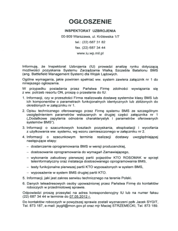 OGŁOSZENIE INSPEKTORAT UZBROJENIA OO-909 Warszawa, ul. Królewska 1/7 tel.: (22) 687 31 82 fax. (22) 687 34 44 www.iu.wp.mil.pl Informuję, że Inspektorat Uzbrojenia (IU) prowadzi analizę rynku dotyczącą możliwości pozyskania Systemu Zarządzania Walką Szczebla Batalionu BMS (ang. Battlefield Management System) dla Wojsk Lądowych. Ogólne wymagania, jakie powinien spełniać ww. system zawiera załącznik nr 1 do niniejszego ogłoszenia. W przypadku posiadania przez Państwa Firmę z ww. potrzeb resortu ON, proszę o przesłanie do IU: zdolności wywiązania się 1. Informacji, czy w przeszłości Firma realizowała dostawę systemów klasy BMS lub ich komponentów o parametrach funkcjonalnych identycznych lub zbliżonych do określonych w załączniku nr 1. 2. Opisu technicznego oferowanego przez Firmę systemu BMS ze szczególnym uwzględnieniem parametrów wskazanych w drugiej części załącznika nr 1 („Dodatkowe zapytania od nośnie charakterystyk i parametrów oferowanych systemów BMS”). 3. Informacji o szacunkowych kosztach pozyskania, eksploatacji i wycofania z użytkowania ww. systemu, wg wzoru zamieszczonego w załączniku nr 2. 4. Informacji o szacunkowym następujące etapy: — — — — — terminie realizacji dostawy uwzględniającej dostarczenie oprogramowania BMS w wersji producenckiej, dostosowanie oprogramowania do wymagań Zamawiającego, wykonanie zabudowy pierwszej partii pojazdów KTO ROSOMAK w sprzęt teleinformatyczny oraz instalacja dostosowanego oprogramowania BMS, testy funkcjonalne pierwszej partii KTO wyposażonych w system BMS, wyposażenie w system BMS drugiej partii KTO. 5. Informacji, jaki jest zakres serwisu technicznego na terenie Polski. 6. Danych teleadresowych osoby upoważnionej przez Państwa Firmę do kontaktów roboczych w przedmiotowej sprawie. Odpowiedzi proszę przesyłać na adres korespondencyjny lU lub na numer faksu (22) 687 34 44 w terminie do 07.05.2012 r. Do kontaktów roboczych w powyższej sprawie zostali wyznaczeni ppłk Jacek SYGIT, Tel. 873 187, e-mail: jsygitmon.goy.pl oraz mjr Maciej STRZEMECKI, Tel. 873 189. Jednocześnie informuję, że powyższego zapytania nie należy traktować jako oferty handlowej w rozumieniu prawa oraz, że niniejsze pismo nie jest zaproszeniem do negocjacji Z Wykonawcami prowadzonymi na podstawie 18 ust.6 decyzji nr 291 MON oraz nie stanowi oferty w rozumieniu art.66 k.c. Wyłącznym dysponentem praw autorskich do załączonych dokumentów jest Inspektorat Uzbrojenia. Kopiowanie, rozpowszechnianie, udostępnianie osobom trzecim wymaga zgody Inspektoratu Uzbrojenia. Załączniki 2 na 10 str. gen. dyw. DU KS Załącznik nr 1 Wymagania ogólne na System Zarządzania Walką Szczebla Batalionu BMS 1. System Zarządzania Walką Szczebla Batalionu BMS (SZWSB BMS) będzie przeznaczony dla jednostek szczebla taktycznego Wojsk Lądowych. Jedną z podstawowych funkcji przyszłego systemu powinno być zobrazowanie położenia sił i środków wojsk własnych oraz przeciwnika, a tym samym zwiększenie świadomości sytuacyjnej wojsk. Ponadto, system BMS powinien istotnie podwyższyć zdolność bojową batalionu w zakresie czynników niematerialnych, tzn. poziomu wyszkolenia, utrzymywania stopnia gotowości bojowej, sprawności systemu dowodzenia oraz zwiększyć umiejętność wyko rzystania specyficznych cech środowiska walki. 2. System powinien funkcjonować od poziomu dowódcy drużyny poprzez wozy bojowe szczebla drużyny, plutonu, kompanii, pododdziałów zabezpieczenia i wsparcia do batalionu (równorzędnego) włącznie, zasilając docelowo informacyjnie Połączony Obraz Sytuacji Operacyjnej (PaSO). Jednocześnie system powinien poprawić zdolność przetrwania żołnierza w warunkach działania czynników niebezpiecznych i n iesprzyjających, zwiększając zespołową skuteczność działania oraz pozyskiwać (przekazywać) informacje ze wszystkich elementów ugrupowania modułu bojowego. 3. Podczas działań bojowych System BMS powinien: a) usprawnić proces przygotowania działań, b) usprawnić proces dowodzenia, c) umożliwić efektywniejsze kierowanie pododdziałami, d) umożliwić monitorowanie położenia wojsk własnych, e) zapewnić efektywne wykorzystanie sensorów, f) zwiększyć efektywność wykorzystan ja środków bojowych, g) umożliwiać integrację z pozostałymi (rozpoznanie, OPL, WRiA, Opchem), systemami h) usprawnić proces zarządzania zabezpieczeniem logistyczne działań, uzupełnianie strat osobowych). 4. Docelowe elementy: ukompletowanie SZWSB BMS wsparcia działań działań (wsparcie powinno zawierać następujące a) system informatyczny zarządzania polem walki (BMS), b) system monitorowania położenia wojsk własnych (BFT), c) środki dowodzenia i łączności. Szczegółowe, przewidywane ukompletowanie w SZWSB BMS pojedynczego pojazdu KTO ROSOMAK zostało przedstawione w tabeli nr 1. Tab. nr 1. Ukompletowanie SZWSB BMS Lp. 1 . 2. Nazwa J.m. Ilość Uwagi Ukompletowanie podstawowe Oprogramowanie Systemu Zarządzania Polem Walki i kPI 1 Monitorowania Położenia Wojsk Własnych (BMS/BFT) Radiostacje wąskopasmowe VHF szt. 2 Strona 1 z 7 3. 4 . 5 • 6. 7. 8. . 10. 12 13 14. 15. 16. 17. 18. 1 20 21. 5. Radiostacje wąskopasmowe HF Pokładowe radiostacja szerokopasmowa lp Szerokopasmowe radiostacje osobiste lP Urządzenie kryptograficzne Terminal satelitarny Moduł WLAN Integrator pokładowy lp wraz infrastrukturą teleinformatyczną platformy mobilnej (KTO ROSOMAK) Telefon bezprzewodowy lP Zestawy komputerowe stanowiska pracy Zestawy komputerowe stanowiska pracy z możliwością wyniesienia Terminaipokładowydia dowódcy załogi Terminal pokładowy VolP Terminal komputerowy osobisty Wojskowy odbiornik GPS z modułem SAASM i nawigacja inercyjna Narzędzia i aparatura kontrolnopomiarowa (AKP) umożliwiające realizację przez personel techniczny Użytkownika czynności w ramach poziomu obsługowonaprawczego podstawowego oraz zaawansowanego. Komputer laptop z 