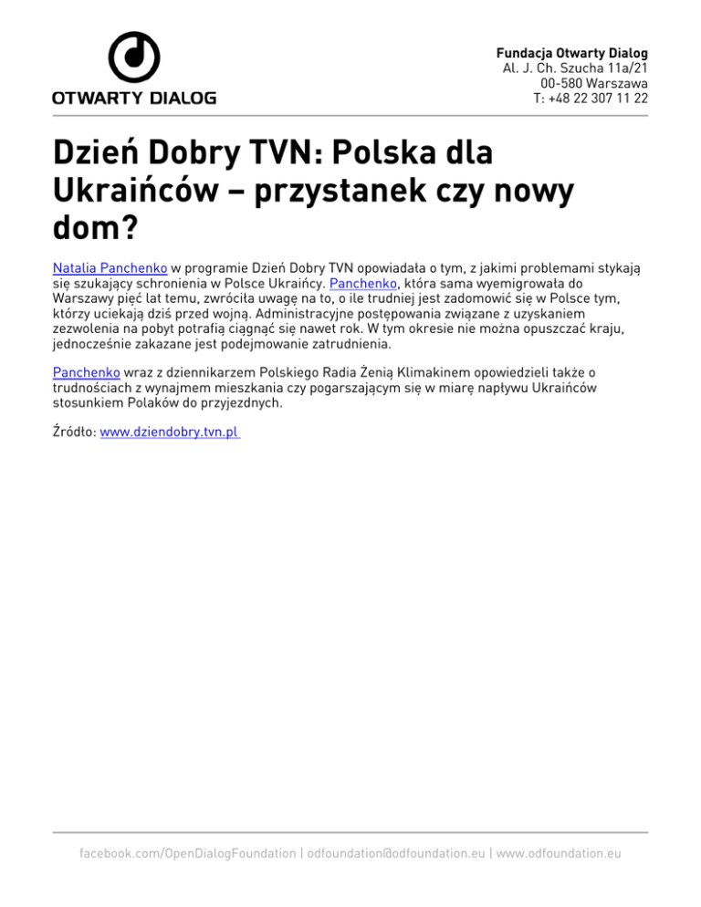 Fundacja Otwarty Dialog Al. J. Ch. Szucha 11a/21 00-580 Warszawa T: +48 22 307 11 22 Dzień Dobry TVN: Polska dla Ukraińców – przystanek czy nowy dom? Natalia Panchenko w programie Dzień Dobry TVN opowiadała o tym, z jakimi problemami stykają się szukający schronienia w Polsce Ukraińcy. Panchenko, która sama wyemigrowała do Warszawy pięć lat temu, zwróciła uwagę na to, o ile trudniej jest zadomowić się w Polsce tym, którzy uciekają dziś przed wojną. Administracyjne postępowania związane z uzyskaniem zezwolenia na pobyt potrafią ciągnąć się nawet rok. W tym okresie nie można opuszczać kraju, jednocześnie zakazane jest podejmowanie zatrudnienia. Panchenko wraz z dziennikarzem Polskiego Radia Żenią Klimakinem opowiedzieli także o trudnościach z wynajmem mieszkania czy pogarszającym się w miarę napływu Ukraińców stosunkiem Polaków do przyjezdnych. Źródło: www.dziendobry.tvn.pl facebook.com/OpenDialogFoundation | [email protected] | www.odfoundation.eu