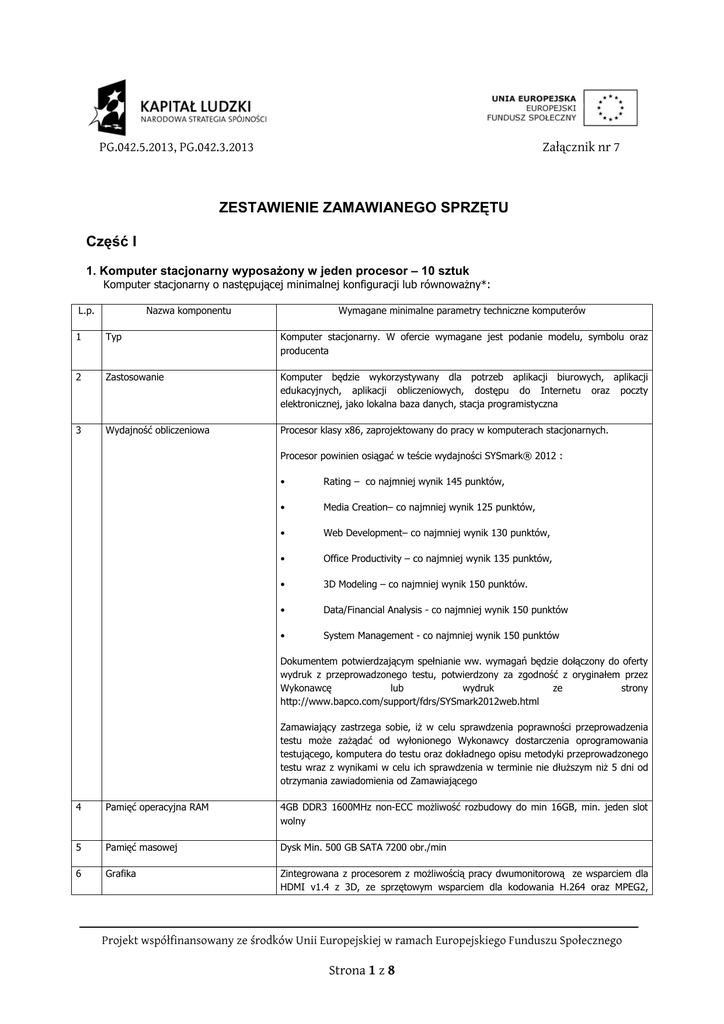 PG.042.5.2013, PG.042.3.2013 Załącznik nr 7 ZESTAWIENIE ZAMAWIANEGO SPRZĘTU Część I 1. Komputer stacjonarny wyposaŜony w jeden procesor – 10 sztuk Komputer stacjonarny o następującej minimalnej konfiguracji lub równowaŜny*: L.p. Nazwa komponentu Wymagane minimalne parametry techniczne komputerów 1 Typ Komputer stacjonarny. W ofercie wymagane jest podanie modelu, symbolu oraz producenta 2 Zastosowanie Komputer będzie wykorzystywany dla potrzeb aplikacji biurowych, aplikacji edukacyjnych, aplikacji obliczeniowych, dostępu do Internetu oraz poczty elektronicznej, jako lokalna baza danych, stacja programistyczna 3 Wydajność obliczeniowa Procesor klasy x86, zaprojektowany do pracy w komputerach stacjonarnych. Procesor powinien osiągać w teście wydajności SYSmark® 2012 : • Rating – co najmniej wynik 145 punktów, • Media Creation– co najmniej wynik 125 punktów, • Web Development– co najmniej wynik 130 punktów, • Office Productivity – co najmniej wynik 135 punktów, • 3D Modeling – co najmniej wynik 150 punktów. • Data/Financial Analysis - co najmniej wynik 150 punktów • System Management - co najmniej wynik 150 punktów Dokumentem potwierdzającym spełnianie ww. wymagań będzie dołączony do oferty wydruk z przeprowadzonego testu, potwierdzony za zgodność z oryginałem przez Wykonawcę lub wydruk ze strony http://www.bapco.com/support/fdrs/SYSmark2012web.html Zamawiający zastrzega sobie, iŜ w celu sprawdzenia poprawności przeprowadzenia testu moŜe zaŜądać od wyłonionego Wykonawcy dostarczenia oprogramowania testującego, komputera do testu oraz dokładnego opisu metodyki przeprowadzonego testu wraz z wynikami w celu ich sprawdzenia w terminie nie dłuŜszym niŜ 5 dni od otrzymania zawiadomienia od Zamawiającego 4 Pamięć operacyjna RAM 4GB DDR3 1600MHz non-ECC moŜliwość rozbudowy do min 16GB, min. jeden slot wolny 5 Pamięć masowej Dysk Min. 500 GB SATA 7200 obr./min 6 Grafika Zintegrowana z procesorem z moŜliwością pracy dwumonitorową ze wsparciem dla HDMI v1.4 z 3D, ze sprzętowym wsparciem dla kodowania H.264 oraz MPEG2, Projekt współfinansowany ze środków Unii Europejskiej w ramach Europejskiego Funduszu Społecznego Strona 1 z 8 PG.042.5.2013, PG.042.3.2013 Załącznik nr 7 DirectX 10.1, OpenGL 3.0, Shader 4.1 posiadająca min. 6EU (Graphics Execution Units) oraz Dual HD HW Decode o max rozdzielczości 2560x1600 @ 60Hz (cyfrowo) i 2048x1536 @ 75Hz (analogowo) oraz osiągać w teście wydajności SYSmark® 2012 3D Modeling – co najmniej wynik 150 punktów, a w SYSmark® 2012 Media Creation – co najmniej wynik 125 punktów. Dokumentem potwierdzającym spełnianie ww. wymagań będzie dołączony do oferty wydruk z przeprowadzonego testu, potwierdzony za zgodność z oryginałem przez Wykonawcę lub wydruk ze strony http://www.bapco.com/support/fdrs/SYSmark2012web.html 7 Multimedia Min 24-bitowa karta dźwiękowa zintegrowana z płytą główną, zgodna z High Definition, wewnętrzny głośnik 2W w obudowie komputera Porty słuchawek i mikrofonu na przednim oraz na tylnym panelu obudowy. 8 Obudowa Typu MiniTower z obsługą kart PCI Express o pełnym profilu, wyposaŜona w min. 4 kieszenie: 2 szt 5,25” zewnętrzne i 2 szt 3,5” wewnętrzne, Obudowa powinna fabrycznie umoŜliwiać montaŜ min 2 szt. dysku 3,5” lub dysków 2,5” Suma wymiarów obudowy nie moŜe przekraczać 97cm, waga max 8 kg, Zasilacz o mocy max. 290W pracujący w sieci 230V 50/60Hz prądu zmiennego i efektywności min. 90% przy obciąŜeniu zasilacza na poziomie 50% oraz o efektywności min. 87% przy obciąŜeniu zasilacza na poziomie 100%, Moduł konstrukcji obudowy w jednostce centralnej komputera powinien pozwalać na demontaŜ kart rozszerzeń, napędu optycznego i 3,5” dysku twardego bez konieczności uŜycia narzędzi (wyklucza się uŜycia wkrętów, śrub motylkowych). Obudowa w jednostce centralnej musi być otwierana bez konieczności uŜycia narzędzi (wyklucza się uŜycie standardowych wkrętów, śrub motylkowych) oraz powinna posiadać czujnik otwarcia obudowy współpracujący z oprogramowaniem zarządzająco – diagnostycznym producenta komputera. Obudowa musi umoŜliwiać zastosowanie zabezpieczenia fizycznego w postaci linki metalowej (złącze blokady Kensingtona) oraz kłódki (oczko w obudowie do załoŜenia kłódki). Obudowa musi być wyposaŜona w zamek szybkiego dostępu, który nie wystaje poza obrys obudowy i musi być usytuowany na bocznym panelu. Obudowa musi posiadać wbudowany wizualny system diagnostyczny, słuŜący do sygnalizowania i diagnozowania problemów z komputerem i jego komponentami, a w szczególności musi sygnalizować: - uszkodzenie lub brak pamięci RAM uszkodzenie złączy PCI i PCIe, płyty głównej uszkodzenie kontrolera Video uszkodzenie dysku twardego awarię BIOS’u awarię procesora Projekt współfinansowany ze środków Unii Europejskiej w ramach Europejskiego Funduszu Społecznego Strona 2 z 8 PG.042.5.2013, PG.042.3.2013 Załącznik nr 7 Oferowany system diagnostyczny nie moŜe wykorzystywać minimalnej ilości wolnych slotów wymaganych w specyfikacji, KaŜdy komputer powinien być oznaczony niepowtarzalnym numerem seryjnym umieszczonym na obudowie, oraz musi być wpisany na stałe w BIOS. 9 Zgodność z systemami operacyjnymi i Potwierdzenie kompatybilności komputera na daną platformę systemową (wydruk ze standardami strony Windows Logo'd Products List) 10 Bezpieczeństwo Zaimplementowany w BIOS system diagnostyczny z graficznym interfejsem uŜytkownika umoŜliwiający jednoczesne przetestowanie w celu wykrycia usterki zainstalowanych komponentów w oferowanym komputerze bez konieczności uruchamiania systemu operacyjnego. System opatrzony min. o funkcjonalność : - sprawdzenie Master Boot Record na gotowość do uruchomienia oferowanego systemu operacyjnego, - test procesora [ min. cache ] - test pamięci, - test wentylatora dla procesora - test wentylatora dodatko