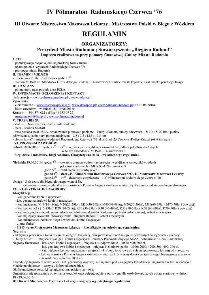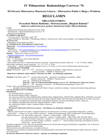 IV Półmaraton Radomskiego Czerwca ‘76 III Otwarte Mistrzostwa Mazowsza Lekarzy , Mistrzostwa Polski w Biegu z Wózkiem REGULAMIN ORGANIZATORZY: Prezydent Miasta Radomia ; Stowarzyszenie „Biegiem Radom!” Impreza realizowana przy pomocy finansowej Gminy Miasta Radomia I. CEL – popularyzacja biegania jako najprostszej formy ruchu – upamiętnienie wydarzeń Radomskiego Czerwca ‘76 – promocja miasta Radomia II. TERMIN I MIEJSCE – 19 czerwca 2016r. Start biegu - godz. 1000 – stadion MOSiR im. Marszałka J. Piłsudskiego, Radom ul. Narutowicza 9, ulice miasta (zgodnie z zał. mapką przebiegu trasy) III. DYSTANS – półmaraton, trasa posiada atest PZLA IV. INFORMACJE, ZGŁOSZENIA I KONTAKT Informacje – www.polmaratonradom.pl ; www.radom.pl Zgłoszenia: – elektroniczne - www.maratonypolskie.pl; www.datasport.pl; www.polmaratonradom.pl;-do 16.06.2016r. – biuro zawodów - w dniach 18 i 19.06.2016r. Kontakt – 504 574 021 ; tl/fax 48 333 07 22 – [email protected] ; www.polmaratonradom.pl V. TRASA BIEGU - start – ul. Narutowicza, ulice miasta Radomia - meta – stadion MOSiR - trasa posiada atest PZLA, oznakowanie pionowe i poziome – każdy kilometr, punkty odżywcze – 5; 10; 15; 20 km ; punkty odświeżania, sanitariaty, pomoc medyczna – 2,5 ; 7,5 ; 12,5 ; 17,5 km - „lotny finisz” - miejsce wydarzeń Radomskiego Czerwca ’76 skrzyż. ul. 25 Czerwca /Kelles-Krauza (ok.6 km trasy) VI. PROGRAM ZAWODÓW Sobota 18.06.2016r. godz. 1700 ÷ 2100 - rejestracja i weryfikacja zawodników, odbiór pakietów startowych w biurze zawodów - MOSiR ul. Narutowicza 9 Biegi dzieci i młodzieży, biegi rodzinne, Charytatywna Mila – wg odrębnego regulaminu. Niedziela 19.06.2016r. godz. 700 – otwarcie biura zawodów - rejestracja i weryfikacja zawodników, odbiór pakietów startowych – MOSiR ul. Narutowicza 9 godz. 930 – zamknięcie list startujących godz.1000 – start „IV Półmaratonu Radomskiego Czerwca ‘76”, III Mistrzostw Mazowsza Lekarzy godz.1315 – 1400 – dekoracja zwycięzców –„IV Półmaratonu Radomskiego Czerwca’76” Uwaga - limit czasu dla biegu głównego wynosi 3h, - zawodnicy biorący udział w mistrzostwach Polski w biegu z wózkiem wystartują 5 minut przed startem biegu głównego VII. KLASYFIKACJE I NAGRODY Klasyfikacje: – kat. generalna kobiet i mężczyzn - kat. generalna krajowa kobiet i mężczyzn – kat. mężczyzn: M18(16-19lat), M20(20-29lat), M30(30-39lat), M40(40-49lat), M50(50-59lat), M60(60-69lat), M70(70lat i powyżej) – kat. kobiet: K18 (16-19lat), K20 (20-29lat), K30 (30-39lat), K40 (40-49lat), K50 (50-59lat), K60 (60-69lat), K70 (70lat i powyżej) – kat. najlepszy zawodnik ziemi radomskiej (dot. mieszkańców Radomia i powiatu radomskiego), kobiet i mężczyzn – kat. najlepszy zawodnik Stowarzyszenia „Biegiem Radom!”, kobiet i mężczyzn – kat. mistrzostwa Polski w biegu z wózkiem, kobiet i mężczyzn - „lotny finisz” - III Otwarte Mistrzostwa Mazowsza Lekarzy – klasyfikacje wg. odrębnego regulaminu Nagrody: - zdobywcy pierwszych 6-ciu miejsc w kategorii krajowej, oraz pierwszych 3-ch miejsc w pozostałych kategoriach - puchary. - „lotny finisz” – 1 miejsca w kat. gen. kobiet i mężczyzn – puchary Przewodniczącego NSZZ „Solidarność” Ziemi Radomskiej. Nagrody finansowe – kat. open. kobiet i mężczyzn – miejsca 1÷3 odpowiednio – 1000; 500; 300 zł. - kat. gen. krajowa kobiet i mężczyzn – miejsca 1÷6 odpowiednio – 3000; 2000; 1200; 500; 400; 300 zł. – kat. wiekowe kobiet i mężczyzn – miejsca 1÷3 – bony towarowe do sklepu sportowego, lub nagrody rzeczowe - kat. mistrzostwa Polski w biegu z wózkiem – miejsca 1÷3 – bony do sklepu sportowego, lub nagrody rzeczowe - rekord trasy – premia 1000 zł. Zawodnicy nagrodzeni w kat. open i kat. generalnej krajowej, nie są brani pod uwagę przy klasyfikacji i nagrodach w kat. wiekowych. Medale pamiątkowe – wszyscy którzy ukończą bieg. Okolicznościowe koszulki techniczne, oraz pakiety startowe. Organizator nie gwarantuje otrzymania koszulek oraz pełnego pakietu startowego dla osób dokonujących opłaty startowej w dniach 18 i 19.06.2016r. III Otwarte Mistrzostwa Mazowsza Lekarzy – nagrody wg. odrębnego regulaminu VIII. UCZESTNICTWO Do startu w półmaratonie dopuszczeni zostaną zawodnicy którzy ukończyli 16-ty rok życia, posiadają aktualne badania lekarskie lub po podpisaniu oświadczenia o stanie zdrowia. W biegu z wózkami startują matka lub ojciec dziecka. Zawodnicy niepełnoletni muszą posiadać pisemną zgodę rodziców na uczestnictwo w biegu. IX. OPŁATY STARTOWE – 1 Przelew – 1. termin – 30 zł - wpłata do 15.03.2016r. ; 2 termin – 45 zł – wpłata do 15.05.2016r. ; 3 termin – 60 zł wpłata do 16.06.2016r Gotówka - 4 termin – 80 zł – wpłata w biurze zawodów Członkowie Stowarzyszenia „Biegiem Radom!” Przelew - 1 termin – 20 zł - wpłata do 15.05.2016r. ; po tym terminie – opłata - wg. zasad ogólnych – dla wpłat dok. przelewem po 15.06.2016 r. zaleca się posiadanie potwierdzenia przelewu Opłata startowa w systemie DataSport bezpośrednio po rejestracji. X. WYŻYWIENIE I NOCLEGI - Organizator zapewnia posiłek po biegu. - Na trasie biegu ustawione będą stoły z napojami zimnymi (woda, napój izotoniczny), odżywkami własnymi (oznakowane i dostarczone do biura zawodów do godz. 9.00) oraz punkty odświeżania z wodą i gąbkami. - Organizator zapewnia bezpłatny nocleg w hali sportowej MOSiR przy ul. Narutowicza 9 (własny śpiwór i materac). XI. POSTANOWIENIA KOŃCOWE -Organizatorzy nie odpowiadają za rzeczy zagubione, a nie oddane do depozytu. Uczestnicy biegów biorą udział w zawodach na własną odpowiedzialność i wskazane jest ubezpieczenie na własny koszt od następstw nieszczęśliwych wypadków. Pobranie numeru startowego przez zawodnika jest równoznaczne z akceptacją regulaminu którego ostateczna interpretacja należy do organiz