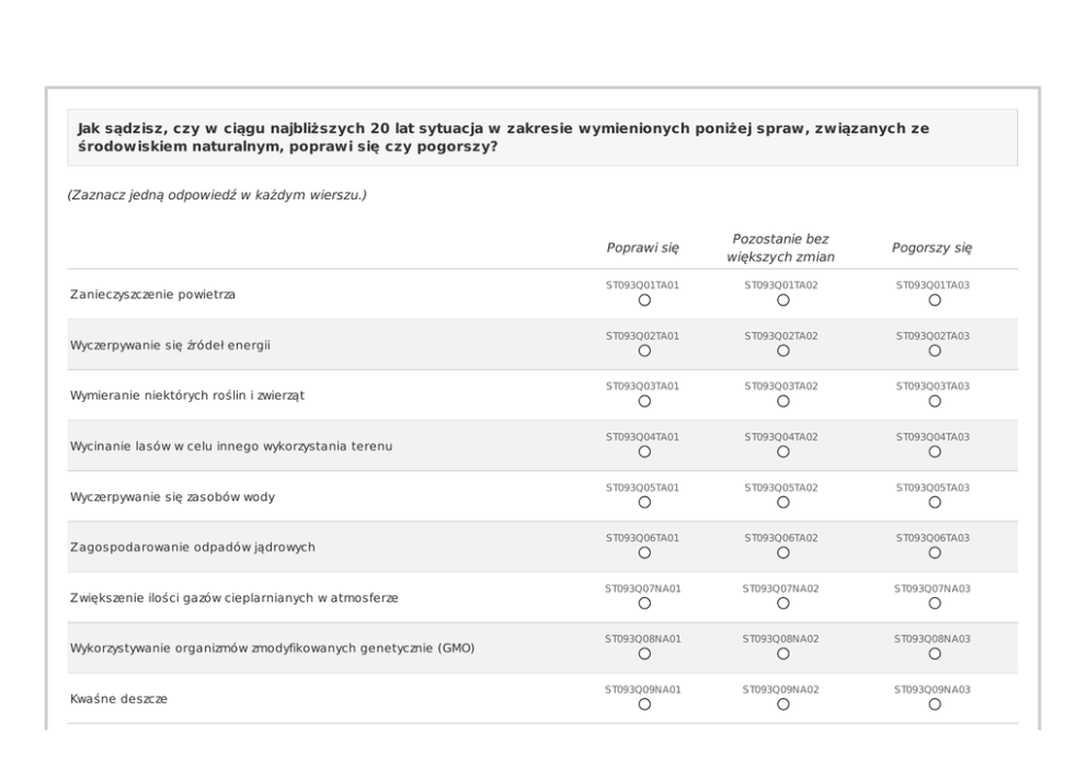 Jak sądzisz, czy w ciągu najbliższych 20 lat sytuacja w zakresie wymienionych poniżej spraw, związanych ze środowiskiem naturalnym, poprawi się czy pogorszy? (Zaznacz jedną odpowiedź w każdym wierszu.) Zanieczyszczenie powietrza Wyczerpywanie się źródeł energii Wymieranie niektórych roślin i zwierząt Wycinanie lasów w celu innego wykorzystania terenu Wyczerpywanie się zasobów wody Zagospodarowanie odpadów jądrowych Zwiększenie ilości gazów cieplarnianych w atmosferze Wykorzystywanie organizmów zmodyfikowanych genetycznie (GMO) Kwaśne deszcze Poprawi się Pozostanie bez większych zmian Pogorszy się ST093Q01TA01 ST093Q01TA02 ST093Q01TA03 ST093Q02TA01 ST093Q02TA02 ST093Q02TA03 ST093Q03TA01 ST093Q03TA02 ST093Q03TA03 ST093Q04TA01 ST093Q04TA02 ST093Q04TA03 ST093Q05TA01 ST093Q05TA02 ST093Q05TA03 ST093Q06TA01 ST093Q06TA02 ST093Q06TA03 ST093Q07NA01 ST093Q07NA02 ST093Q07NA03 ST093Q08NA01 ST093Q08NA02 ST093Q08NA03 ST093Q09NA01 ST093Q09NA02 ST093Q09NA03