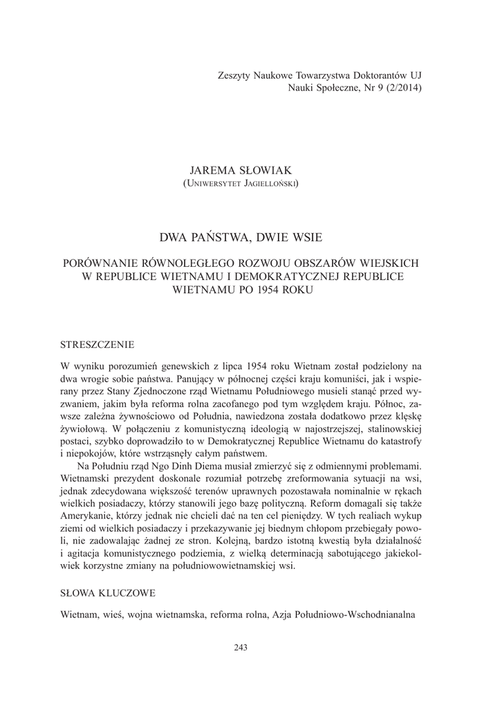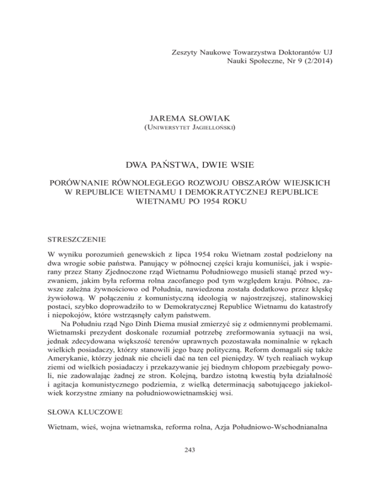 Zeszyty Naukowe Towarzystwa Doktorantów UJ Nauki Społeczne, Nr 9 (2/2014) JAREMA SŁOWIAK (Uniwersytet Jagielloński) DWA PAŃSTWA, DWIE WSIE PORÓWNANIE RÓWNOLEGŁEGO ROZWOJU OBSZARÓW WIEJSKICH W REPUBLICE WIETNAMU I DEMOKRATYCZNEJ REPUBLICE WIETNAMU PO 1954 ROKU STRESZCZENIE W wyniku porozumień genewskich z lipca 1954 roku Wietnam został podzielony na dwa wrogie sobie państwa. Panujący w północnej części kraju komuniści, jak i wspierany przez Stany Zjednoczone rząd Wietnamu Południowego musieli stanąć przed wyzwaniem, jakim była reforma rolna zacofanego pod tym względem kraju. Północ, zawsze zależna żywnościowo od Południa, nawiedzona została dodatkowo przez klęskę żywiołową. W połączeniu z komunistyczną ideologią w najostrzejszej, stalinowskiej postaci, szybko doprowadziło to w Demokratycznej Republice Wietnamu do katastrofy i niepokojów, które wstrząsnęły całym państwem. Na Południu rząd Ngo Dinh Diema musiał zmierzyć się z odmiennymi problemami. Wietnamski prezydent doskonale rozumiał potrzebę zreformowania sytuacji na wsi, jednak zdecydowana większość terenów uprawnych pozostawała nominalnie w rękach wielkich posiadaczy, którzy stanowili jego bazę polityczną. Reform domagali się także Amerykanie, którzy jednak nie chcieli dać na ten cel pieniędzy. W tych realiach wykup ziemi od wielkich posiadaczy i przekazywanie jej biednym chłopom przebiegały powoli, nie zadowalając żadnej ze stron. Kolejną, bardzo istotną kwestią była działalność i agitacja komunistycznego podziemia, z wielką determinacją sabotującego jakiekolwiek korzystne zmiany na południowowietnamskiej wsi. SŁOWA KLUCZOWE Wietnam, wieś, wojna wietnamska, reforma rolna, Azja Południowo-Wschodnianalna 243 Jarema Słowiak INFORMACJE O AUTORZE Jarema Słowiak Zakład Historii Powszechnej Najnowszej Uniwersytet Jagielloński [email protected] WSTĘP W nocy z 20 na 21 lipca 1954 roku na mocy porozumień genewskich Wietnam został podzielony na dwie części: kontrolowaną przez komunistów Północ oraz nominalnie niepodległe, ale de facto kontrolowane przez Francuzów Południe. Choć oba państwa miały w myśl układów genewskich zjednoczyć się po dwóch latach, granice wyznaczone w 1954 roku okazały się podziałem obowiązującym przez prawie dwadzieścia jeden lat. W ciągu tych dwóch dekad oba kraje podążyły w diametralnie różnych kierunkach zarówno pod względem polityki, jak i gospodarki. PÓŁNOCNA DROGA DO SOCJALIZMU Ustalenia z Genewy nie spotkały się z entuzjastyczną reakcją wśród wietnamskich komunistów, którzy liczyli na opanowanie całych Indochin, a w każdym razie obu części Wietnamu, i czuli się odarci ze zwycięstwa1. Burzliwe nastroje wśród dołów partyjnych musiał uśmierzać sam Ho Chi Minh, który wskazywał korzystne strony podziału kraju – uzyskano uznawaną przez byłą potęgę kolonialną niepodległość, zaś w ciągu dwóch lat planowano zorganizować referendum zjednoczeniowe, w którym komuniści mieli wielkie szanse na wygraną. Perspektywy nie były więc najgorsze, zwłaszcza wobec sytuacji na Południu, gdzie rząd Ngo Dinh Diema niebezpiecznie chwiał się od momentu, gdy ten ostatni pojawił się w Sajgonie. W razie jego upadku południowa część Wietnamu pogrążyłaby się w anarchii, rozdzierana przez wzajemnie zwalczające się sekty religijne, wojskowych, polityków i gangsterów. Po dwóch latach takiego zamieszania Południe wpadłoby zapewne w ręce komunistów z własnej woli, bez większego wysiłku ze strony tych ostatnich. Mając to na uwadze, przywódcy Demokratycznej Republiki Wietnamu chwilowo odłożyli na półkę ideę zjednoczenia kraju i poświęcili się budowaniu 1 Co ciekawe, swoimi żalami dzielili się także z zachodnimi mediami, np. T. Durdin, Some in Vietminh, Angered, Say Red Allies Forced Pact, „The New York Times”, 25 VII 1954. 244 Dwa państwa, dwie wsie... „socjalistycznego raju” na północ od siedemnastego równoleżnika. Biorąc pod uwagę, że wojna z Francuzami toczyła się głównie na północy, było co odbudowywać. Infrastruktura znajdowała się w opłakanym stanie, zaś ewakuujący się Francuzi zabierali wszystko, co byli w stanie, począwszy od samochodów, na wyposażeniu fabryk i kopalń skończywszy. W wyniku wymiany ludności Północ straciła prawie milion obywateli, na dodatek w tej liczbie zawierała się większość urzędników i personelu technicznego pracującego w przemyśle. Komuniści posiadali jednak szereg atutów, którymi nie dysponował rząd Południowego Wietnamu. Władze Demokratycznej Republiki Wietnamu od dawna przygotowywały się, by oficjalnie wkroczyć do Hanoi. Ich autorytet był niepodważalny, zarówno jako pogromców kolonialistów, jak i przez rozbudowany aparat bezpieczeństwa oraz armię, której lojalność względem rządu, dzięki wieloletniej indoktrynacji i ścisłej kontroli, nie podlegała dyskusji. Wietnamscy komuniści w trakcie wojny wykształcili liczne kadry, które pozwoliły im szybko i sprawnie wypełnić próżnię po uchodzących Francuzach i ich administracji. Brak zagranicznej prasy, patrzącej na ręce władzy, pozwolił także szybko i sprawnie rozprawić się z nieliczną opozycją polityczną, jaka po 1954 roku pozostała na Północy. Dzięki pomocy komunistycznych Chin oraz Związku Radzieckiego dość szybko udało się uruchomić przemysł. Industrializacja, obok reformy rolnej, była jednym z priorytetów nowej władzy. Co ciekawe, pomagali w tym nawet Francuzi, chcący za wszelką cenę zachować jakieś wpływy w byłej kolonii2. W Demokratycznej Republice Wietnamu, podobnie jak w innych krajach realnego socjalizmu, zaczęto tworzyć liczne organizacje, które miały ułatwić kontrolę nad poszczególnymi grupami społeczeństwa. Największą z nich był Patriotyczny Front Wietnamu. Młodzi Wietnamczycy w wieku dwunastu lat zapisywani byli do Młodzieżowej 