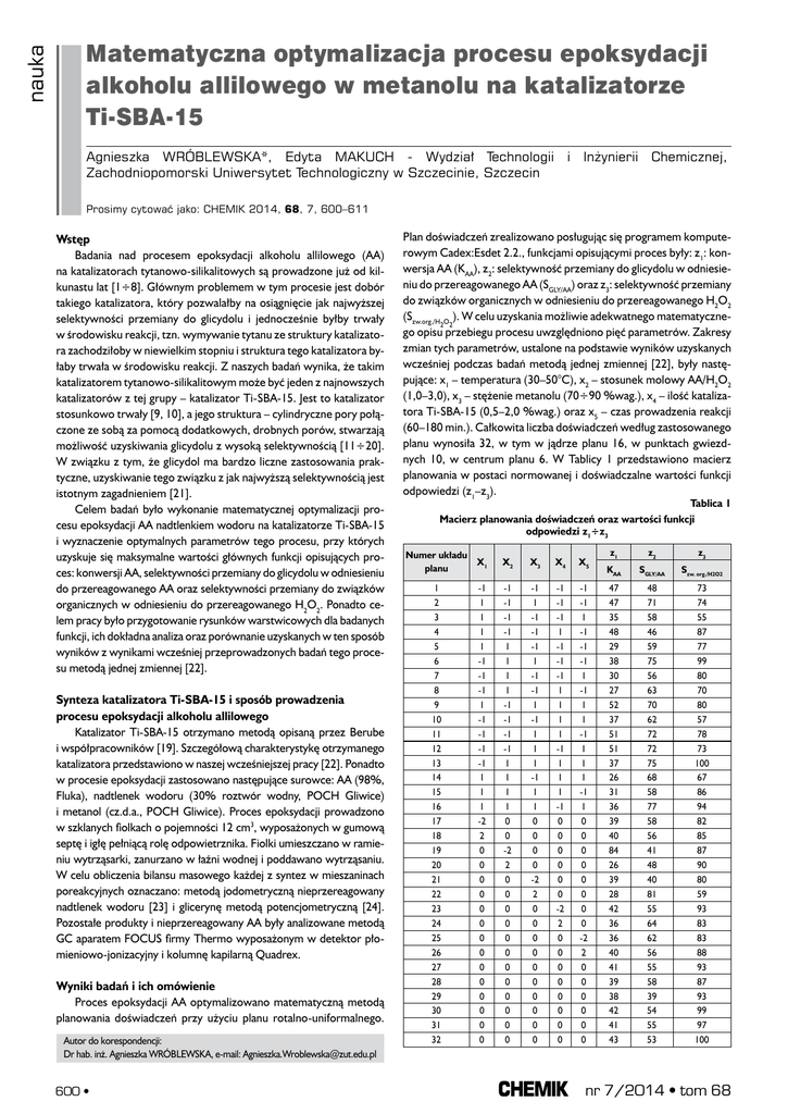 nauka Matematyczna optymalizacja procesu epoksydacji alkoholu allilowego w metanolu na katalizatorze Ti-SBA-15 Agnieszka WRÓBLEWSKA*, Edyta MAKUCH - Wydział Technologii i Inżynierii Chemicznej, Zachodniopomorski Uniwersytet Technologiczny w Szczecinie, Szczecin Prosimy cytować jako: CHEMIK 2014, 68, 7, 600–611 Wstęp Badania nad procesem epoksydacji alkoholu allilowego (AA) na katalizatorach tytanowo-silikalitowych są prowadzone już od kilkunastu lat [1÷8]. Głównym problemem w tym procesie jest dobór takiego katalizatora, który pozwalałby na osiągnięcie jak najwyższej selektywności przemiany do glicydolu i jednocześnie byłby trwały w środowisku reakcji, tzn. wymywanie tytanu ze struktury katalizatora zachodziłoby w niewielkim stopniu i struktura tego katalizatora byłaby trwała w środowisku reakcji. Z naszych badań wynika, że takim katalizatorem tytanowo-silikalitowym może być jeden z najnowszych katalizatorów z tej grupy – katalizator Ti-SBA-15. Jest to katalizator stosunkowo trwały [9, 10], a jego struktura – cylindryczne pory połączone ze sobą za pomocą dodatkowych, drobnych porów, stwarzają możliwość uzyskiwania glicydolu z wysoką selektywnością [11÷20]. W związku z tym, że glicydol ma bardzo liczne zastosowania praktyczne, uzyskiwanie tego związku z jak najwyższą selektywnością jest istotnym zagadnieniem [21]. Celem badań było wykonanie matematycznej optymalizacji procesu epoksydacji AA nadtlenkiem wodoru na katalizatorze Ti-SBA-15 i wyznaczenie optymalnych parametrów tego procesu, przy których uzyskuje się maksymalne wartości głównych funkcji opisujących proces: konwersji AA, selektywności przemiany do glicydolu w odniesieniu do przereagowanego AA oraz selektywności przemiany do związków organicznych w odniesieniu do przereagowanego H2O2. Ponadto celem pracy było przygotowanie rysunków warstwicowych dla badanych funkcji, ich dokładna analiza oraz porównanie uzyskanych w ten sposób wyników z wynikami wcześniej przeprowadzonych badań tego procesu metodą jednej zmiennej [22]. Synteza katalizatora Ti-SBA-15 i sposób prowadzenia procesu epoksydacji alkoholu allilowego Katalizator Ti-SBA-15 otrzymano metodą opisaną przez Berube i współpracowników [19]. Szczegółową charakterystykę otrzymanego katalizatora przedstawiono w naszej wcześniejszej pracy [22]. Ponadto w procesie epoksydacji zastosowano następujące surowce: AA (98%, Fluka), nadtlenek wodoru (30% roztwór wodny, POCH Gliwice) i metanol (cz.d.a., POCH Gliwice). Proces epoksydacji prowadzono w szklanych fiolkach o pojemności 12 cm3, wyposażonych w gumową septę i igłę pełniącą rolę odpowietrznika. Fiolki umieszczano w ramieniu wytrząsarki, zanurzano w łaźni wodnej i poddawano wytrząsaniu. W celu obliczenia bilansu masowego każdej z syntez w mieszaninach poreakcyjnych oznaczano: metodą jodometryczną nieprzereagowany nadtlenek wodoru [23] i glicerynę metodą potencjometryczną [24]. Pozostałe produkty i nieprzereagowany AA były analizowane metodą GC aparatem FOCUS firmy Thermo wyposażonym w detektor płomieniowo-jonizacyjny i kolumnę kapilarną Quadrex. Wyniki badań i ich omówienie Proces epoksydacji AA optymalizowano matematyczną metodą planowania doświadczeń przy użyciu planu rotalno-uniformalnego. Autor do korespondencji: Dr hab. inż. Agnieszka WRÓBLEWSKA, e-mail: [email protected] 600 • Plan doświadczeń zrealizowano posługując się programem komputerowym Cadex:Esdet 2.2., funkcjami opisującymi proces były: z1: konwersja AA (KAA), z2: selektywność przemiany do glicydolu w odniesieniu do przereagowanego AA (SGLY/AA) oraz z3: selektywność przemiany do związków organicznych w odniesieniu do przereagowanego H2O2 (Szw.org./H O ). W celu uzyskania możliwie adekwatnego matematyczne2 2 go opisu przebiegu procesu uwzględniono pięć parametrów. Zakresy zmian tych parametrów, ustalone na podstawie wyników uzyskanych wcześniej podczas badań metodą jednej zmiennej [22], były następujące: x1 – temperatura (30–50°C), x2 – stosunek molowy AA/H2O2 (1,0–3,0), x3 – stężenie metanolu (70÷90 %wag.), x4 – ilość katalizatora Ti-SBA-15 (0,5–2,0 %wag.) oraz x5 – czas prowadzenia reakcji (60–180 min.). Całkowita liczba doświadczeń według zastosowanego planu wynosiła 32, w tym w jądrze planu 16, w punktach gwiezdnych 10, w centrum planu 6. W Tablicy 1 przedstawiono macierz planowania w postaci normowanej i doświadczalne wartości funkcji odpowiedzi (z1–z3). Tablica 1 Macierz planowania doświadczeń oraz wartości funkcji odpowiedzi z1÷z3 Numer układu X1 planu 1 2 3 4 5 6 7 8 9 10 11 12 13 14 15 16 17 18 19 20 21 22 23 24 25 26 27 28 29 30 31 32 -1 1 1 1 1 -1 -1 -1 1 -1 -1 -1 -1 1 1 1 -2 2 0 0 0 0 0 0 0 0 0 0 0 0 0 0 X2 X3 X4 X5 -1 -1 -1 -1 1 1 1 1 -1 -1 -1 -1 1 1 1 1 0 0 -2 2 0 0 0 0 0 0 0 0 0 0 0 0 -1 1 -1 -1 -1 1 -1 -1 1 -1 1 1 1 -1 1 1 0 0 0 0 -2 2 0 0 0 0 0 0 0 0 0 0 -1 -1 -1 1 -1 -1 -1 1 1 1 1 -1 1 1 1 -1 0 0 0 0 0 0 -2 2 0 0 0 0 0 0 0 0 -1 -1 1 -1 -1 -1 1 -1 1 1 -1 1 1 1 -1 1 0 0 0 0 0 0 0 0 -2 2 0 0 0 0 0 0 z1 z2 z3 KAA SGLY/AA Szw. org./H2O2 47 47 35 48 29 38 30 27 52 37 51 51 37 26 31 36 39 40 84 26 39 28 42 36 36 40 41 39 38 42 41 43 48 71 58 46 59 75 56 63 70 62 72 72 75 68 58 77 58 56 41 48 40 81 55 64 62 56 55 58 39 54 55 53 73 74 55 87 77 99 80 70 80 57 78 73 100 67 86 94 82 85 87 90 80 59 93 83 83 88 93 87 93 99 97 100 nr 7/2014 • tom 68 Tablica 2 Wartości normowane i rzeczywiste planu doświadczeń PARAMETRY WEJŚCIOWE – RZECZYWISTE Poziom Normowane Tempewartości ratura °C Ilość Czas Stosunek Stężenie metanolu Ti-SBA-15 reakcji molowy AA/H2O2 min. %wag. %wag. Tablica 3 Współczynniki równań regresji w postaci normowanej oraz parametry statystyczne równań Z1-Z3 Z1 Z2 Z3 b00 41,070* 51,000* 95,180* b01 -0,500 -0,830 -0,170 b02 -9,580* 1,920 4,250* b03 1,750* 8,000* 3,170* b04 -0,670 0,670 -0,830 b05 -0,25 1,420 -1,170 b11 -0,690 2,500 -3,180* b12 -0