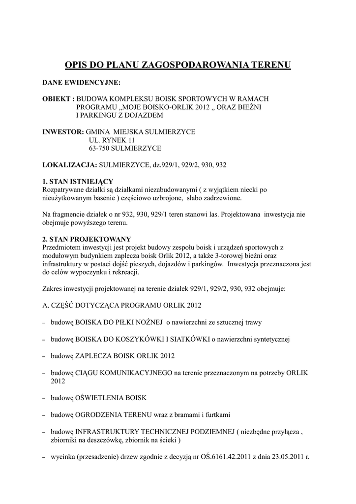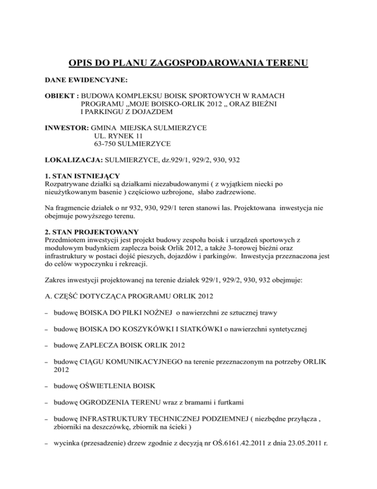 OPIS DO PLANU ZAGOSPODAROWANIA TERENU DANE EWIDENCYJNE: OBIEKT : BUDOWA KOMPLEKSU BOISK SPORTOWYCH W RAMACH PROGRAMU „MOJE BOISKO-ORLIK 2012 „ ORAZ BIEŻNI I PARKINGU Z DOJAZDEM INWESTOR: GMINA MIEJSKA SULMIERZYCE UL. RYNEK 11 63-750 SULMIERZYCE LOKALIZACJA: SULMIERZYCE, dz.929/1, 929/2, 930, 932 1. STAN ISTNIEJĄCY Rozpatrywane działki są działkami niezabudowanymi ( z wyjątkiem niecki po nieużytkowanym basenie ) częściowo uzbrojone, słabo zadrzewione. Na fragmencie działek o nr 932, 930, 929/1 teren stanowi las. Projektowana inwestycja nie obejmuje powyższego terenu. 2. STAN PROJEKTOWANY Przedmiotem inwestycji jest projekt budowy zespołu boisk i urządzeń sportowych z modułowym budynkiem zaplecza boisk Orlik 2012, a także 3-torowej bieżni oraz infrastruktury w postaci dojść pieszych, dojazdów i parkingów. Inwestycja przeznaczona jest do celów wypoczynku i rekreacji. Zakres inwestycji projektowanej na terenie działek 929/1, 929/2, 930, 932 obejmuje: A. CZĘŚĆ DOTYCZĄCA PROGRAMU ORLIK 2012 – budowę BOISKA DO PIŁKI NOŻNEJ o nawierzchni ze sztucznej trawy – budowę BOISKA DO KOSZYKÓWKI I SIATKÓWKI o nawierzchni syntetycznej – budowę ZAPLECZA BOISK ORLIK 2012 – budowę CIĄGU KOMUNIKACYJNEGO na terenie przeznaczonym na potrzeby ORLIK 2012 – budowę OŚWIETLENIA BOISK – budowę OGRODZENIA TERENU wraz z bramami i furtkami – budowę INFRASTRUKTURY TECHNICZNEJ PODZIEMNEJ ( niezbędne przyłącza , zbiorniki na deszczówkę, zbiornik na ścieki ) – wycinka (przesadzenie) drzew zgodnie z decyzją nr OŚ.6161.42.2011 z dnia 23.05.2011 r. – rozbiórka nasypów ziemnych basenu, obejścia/chodnika wokół basenu oraz schodów betonowych wejściowych. B. ROBOTY DODATKOWE - budowę BIEŻNI LEKKOATLETYCZNEJ 3 torowej o nawierzchni syntetycznej - budowę OGRODZENIA TERENU WOKÓŁ BIEŻNI wraz z bramą i furtką - budowę dojść pieszych z kostki gr.6cm - budowę dojazdów i parkingów z kostki gr.8cm Na poniższym rysunku ( rys.A) przedstawiono projektowane zagospodarowanie terenu dla inwestycji oraz projektowaną kolorystykę. Dla większej przejrzystości poszczególne elementy zagospodarowania zwymiarowano dokładniej na rys.B i C. 3. ZESTAWIENIE POWIERZCHNI. Boisko do piłki nożnej 1860 m2 Boisko wielofunkcyjne 613,11 m2 Zaplecze socjalne 95,37 m2 Podjazdy i schody 10,84m2 Teren utwardzony na terenie „ORLIKA 2012” 159,04 m2 Trawnik na terenie „ORLIKA 2012” 297,73 m2 Pozostały teren ( krawężniki, ogrodzenie, pasy pod oświetlenie ) 217,49m2 Bieżnia lekkoatletyczna 1135,74 m2 Trawnik wewnątrz bieżni 2307,42m2 Dojścia piesze 112,94 m2 Dojazdy i parkingi Ilość miejsc parkingowych – dla samochodów osobowych (2,3x5,0m) Ilość miejsc parkingowych – dla samochodów osobowych dla osób niepełnosprawnych (3,6x5,0m) 1074,07 m2 32 miejsca 2 miejsca 4. UKŁAD KOMUNIKACYJNY Projektowane ciągi komunikacyjne znajdujące się na terenie objętym opracowaniem, będą służyły jako dojazd i dojście do projektowanych obiektów. Połączenie z istniejącym układem komunikacyjnym określa usytuowanie bramy wjazdowej i furtki dla terenu Orlika oraz projektowane drogi i parking poza obszarem Orlika. 6. OPIS ROBÓT ROZBIÓRKOWYCH. Do wykonania kompleksu boisk sportowych należy rozebrać drogę na dz. nr 930, fragment nasypów ziemnych i pas obejścia przy basenie oraz schody betonowe wejściowe do basenu. Konstrukcja basenu żelbetowego pozostaje nienaruszona. 7. PROJEKTOWANA INFRASTRUKTURA. woda – istniejące przyłącze wodociągowe ścieki socjalne - do projektowanego zbiornika bezodpływowego instalacja elektryczna – istniejące przyłącze elektryczne wody opadowe z boisk i zaplecza socjalnego, zostaną doprowadzone systemem drenaży i rur do projektowanych zbiorników bezodpływowych 8. UKSZTAŁTOWANIE TERENU Teren jest równinny, nie wymaga makroniwelacji 9. DANE O WPŁYWIE EKSPLOATACJI GÓRNICZEJ Nie dotyczy 10. DANE O ISTNIEJĄCYCH I PRZEWIDYWANYCH CECHACH ZAGROŻENIA DLA ŚRODOWISKA ORAZ HIGIENY I ZDROWIA UŻYTKOWNIKÓW Projektowany obiekt nie ma negatywnego wpływu na środowisko przyrodnicze. Woda dostarczana będzie z istniejącego przyłącza wodociągowego, ścieki odprowadzane do szczelnego zbiornika bezodpływowego. Gromadzenie odpadków stałych w kontenerach przy bramie wjazdowej na terenie Orlika oraz w koszach przy ciągu pieszym i parkingach. 11. INFORMACJE DOTYCZĄCE HIGIENY I ZDROWIA UŻYTKOWNIKÓW Projektuje się zaplecze socjalne boisk, które spełnia wymogi higieniczno-sanitarne. 12. INFORMACJE DOTYCZĄCE BEZPIECZEŃSTWA I ZDROWIA UŻYTKOWNIKÓW Projektowany budynek zaplecza, jak również cały teren kompleksu spełniają wymogi bezpieczeństwa i zdrowia użytkowników. 13. DOSTĘPNOŚĆ DLA OSÓB NIEPEŁNOSPRAWNYCH. Projektowany budynek zaplecza boisk pod względem rozwiązań technicznych i funkcjonalnych jest dostosowany dla osób niepełnosprawnych, poruszających się na wózkach, poprzez zastosowanie podjazdu dla osób niepełnosprawnych wyprofilowanego z kostki oraz łazienki przystosowanej na potrzeby osób niepełnosprawnych. Opracowała : mgr inż. arch. Izabela Wrześniewska Nr upr 585/84/Lo