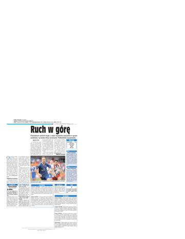 zródło: Sport (PL) | 20.5.2015 rubryka: T-MOBILE EKSTRAKLASA | Strona: 4 Autor: Zbigniew Cieńciała | nakład: 11904 | rozpowszechniono: 5824 | Temat: Niebiescy-Prasa | AVE: 30 661 PLN PIŁKA NOŻNA SPORT • środa 20.05.2015 • www.katowickispor Ruch w górę Chorzowianie odnieśli drugie z rzędu wyjazdowe zwycięstwo w grupie spadkowej i są bardzo bliscy utrzymania. Podbeskidzie rozczarowało. Zajac bez szans Grodzicki po raz pierwszy Podbeskidzie powinno objąć prowadzenie, po tym jak Robert Demjan podał piłkę Trzy pytania do... ...Dariusza Kołodzieja piłkarza Podbeskidzia Za wolno... ◗ Ten mecz przypominał trochę jesienną konfrontację w Bielsku-Białej. Ale wtedy to wy po przerwie strzelaliście gole. - Faktycznie tak było. To spotkanie natomiast nam nie wyszło. Trudno powiedzieć dlaczego. Przecież wcześniejsze wyglądały dobrze. Myślę, że w drugiej połowie mieliśmy nawet niewielką przewagę, ale nic z niej nie wynikało. Nie przekładało się na jakieś sytuacje. do wychodzącego na czystą pozycję Bartos za Śpiączki, jednak strzelec z sześciu metrów skierował piłkę do... rąk Matusza Putnockiego. Jeszcze w końcówce pierwszej połowy groźnie przymierzył Maciej Iwański, ale Putnocky końcami palców odbił piłkę. Szybko po przerwie Ruch poprawił wszystkie złe statystyki z pierwszych 45 minut. Egzekwował trzy kornery z rzędu, w końcu po trzecim - precyzyjnej centrze Zieńczuka - Rafał Grodzicki oddał silny strzał głową, pakując piłkę do siatki. Piękna była to bramka, dodajmy, że dopiero pierwsza w tym sezonie zdobyta przez „Niebieskich” po rzucie rożnym. ◗ Strata pierwszego gola wy musiła, że musieliście atako wać. Nie szło wam to... - Ruch po zdobyciu gola cofnął się praktycznie całym zespołem. Trudno było skonstruować jakąś akcję. Przy wyniku 0:2 Damian Chmiel wyszedł na czystą po zycję. Szkoda, że nie trafił, może wtedy byłoby inaczej. Mo glibyśmy powalczyć o remis. ◗ Gole straciliście po błędach w obronie. A czego zabrakło ofensywie? - Szybkości w rozgrywaniu piłki. Wszystko było za wolno. Za mało graliśmy z pierwszej piłki. Nie mogli śmy „rozklepać” obrony przeciwnika i dlatego nie zagrażaliśmy bramce Ruchu. Tak czasem bywa. Szkoda. kowej, zrównał się punktami z „góralami” i jest już bardzo bliski utrzymania. Podbeskidzie rozczarowało. - Ruch bez naszej agresji spokojnie rozgrywał sobie piłkę. Dopiero w ostatnich 20 minutach zaczęliśmy grać. Nie oszukujmy się - przegraliśmy w marnym stylu... - ocenił postawę zespołu mocno poirytowany Maciej Iwański. Zbigniew Cieńciała Mówią liczby PODBESKIDZIE RUCH 4 strzały celne 3 6 strzały niecelne 5 7 rzuty rożne 3 2 spalone 2 1 żółte kartki 0 Wygrany Rołand Gigołajew Rołand Gigołajew był bardzo niezadowolony, gdy w derbach z Piastem w Chorzowie trener Waldemar Fornalik posadził go na ławce. Rosjanin w Bielsku-Białej udowodnił szkoleniowcowi, że aktualnie jest suwerenem na lewym boku pomocy Ruchu. Przegrany Tomasz Górkiewicz Fot. Norber Barczyk/Pressfocus O ba zespoły zapowiadały walkę o trzy punkty, ale pierwsza połowa tego nie potwierdziła. Ruch do przerwy był zdecydowanie częściej w posiadaniu piłki, ale też chorzowianie nie oddali w pierwszej połowie celnego strzału i nie egzekwowali ani jednego rzutu rożnego. Podbeskidzie miało dwa celne uderzenia, jednak trudno te próby nazwać okazjami na zdobycie gola. - Nieźle operujemy piłką, ale nic z tego nie wynika. Mecz był do przerwy... senny - przyznał Marek Zieńczuk. Po godzinie gry goście mieli już dwubramkową przewagę. Zieńczuk szykował się do strzału, ale zmienił decyzję obsługując lepiej ustawionego i niepilnowanego Rołanda Gigołajewa. Rosjanin skleił piłkę na piersi i lewą nogą, strzałem z woleja, po raz drugi pokonał Richarda Zajaca. Bramkarz nie miał najmniejszych szans, bo akcja gości i finalne uderzenie były przedniej marki. W 75 minucie Grzegorz Kuświk świetnie dograł piłkę do Bartłomieja Babiarza, lecz Zajac świetnie obronił strzał gracza Ruchu. Kropkę nad „i” mógł też postawić Jakub Kowalski, ale i w jego przypadku lepszy okazał się Słowak. Ostatecznie Ruch odniósł drugie z rzędu wyjazdowe zwycięstwo w grupie spad- Rafał Grodzicki trafił w meczu z Podbeskidziem na 1:0. To pierwszy gol strzelony w tym sezonie przez Ruch po rzucie rożnym. Urodzony w Wadowicach 30-letni obrońca Podbeskidzia pewnie nie będzie chciał długo pamiętać o wczorajszym występie. W 52 minucie nie upilnował w polu karnym Rafała Grodzickiego. Zszedł też wcześniej z boiska, choć jego zmiana podyktowana była także względami taktycznymi. Głos trenerów Czy wiesz że... Liczba Waldemar FORNALIK: - Jesteśmy bardzo zadowoleni z wyniku i z drugiej połowy w naszym wykonaniu. W pierwszej odsłonie nie było łatwo. Utrzymywaliśmy się przy piłce, ale nie stwarzaliśmy sytuacji. Po przerwie nieco przyspieszyliśmy grę. Szybciej wymienialiśmy podania. Bramka otworzyła spotkanie, a drugi gol spowodował, że grało się nam bardzo dobrze. Zdobyliśmy bardzo cenne punkty na bardzo trudnym terenie. Chorzowianie w pięciu kolejnych wyjazdowych przegrali tylko raz. Z kolei „górale” w ostatnich sześciu meczach granych w roli gospodarza wygrali tylko raz. 7 Dariusz KUBICKI: - Ten mecz zupełnie nam nie wyszedł. Mieliśmy mało czasu na regenerację i dlatego pojawiły się problemy, szczególnie w drugiej połowie. To było spotkanie do pierwszego błędu. Niestety to my go popełniliśmy. Trudno było cokolwiek odwrócić. Próbowaliśmy się ratować rozpaczliwymi zmianami, które jednak nic nam nie dały. Mecz z Ruchem to już jednak historia. Teraz przede wszystkim musimy odpocząć przed kolejnym arcyważnym spotkaniem z Piastem. Po raz siódmy w tym roku Matus Putnocky i jego koledzy nie stracili w ligowym meczu gola. Pod szatniami Kristian KOLCZAK: - Do tej pory czę