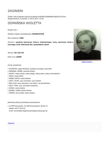 ZAGINIENI Źródło: http://zaginieni.policja.pl/zag/form/r65405,DOMANSKA-WIOLETTA.html Wygenerowano: Czwartek, 2 marca 2017, 13:33 DOMAŃSKA WIOLETTA Drugie imię: Ostatnie miejsce zameldowania: KRASNYSTAW Rok urodzenia: 1980 Ubranie: spodnie jeansowe koloru niebieskiego, buty sportowe koloru czarnego, brak informacji dot. pozostałych ubrań Wzrost: 161-165 CM Kolor oczu: JASNE Zgłoś osobę!!! Cechy rysopisowe ● SYLWETKA: waga 50-69 kg, sylwetka szczupła, wysmukła ● RAMIONA / RAMIĘ: ramiona krótkie ● WŁOSY: włosy proste, włosy długie, włosy jasne, włosy ciemnoblond ● SZYJA: szyja krótka ● WARGI (USTA): wargi średnie ● USZY / UCHO: uszy normalne, uszy średnie ● NOS: kolor nosa naturalny, nos średni, nos prostolinijny ● OCZY / OKO: oczy normalnie osadzone ● CZOŁO: czoło średnie ● DŁONIE / DŁOŃ: dłonie drobne ● TWARZ: cera śniada, twarz owalna Jednostka policji prowadząca poszukiwania ● LU KPP Krasnystaw, 22-300 Krasnystawul. Okrzei 11 telefon: 82 57 56 210 email: [email protected] Tweetnij