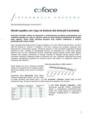 I N F O R M A C J A P R A S O W A Sao Paulo/Paryż/Warszawa, 6 marca 2015 r. Skutki spadku cen ropy na świecie dla Ameryki Łacińskiej Ameryka Łacińska należy do obszarów o rozbudowanej produkcji przemysłowej, zaś niedawny spadek cen ropy na świecie niesie za sobą szereg konsekwencji dla krajów tego regionu. Które kraje odnoszą korzyści przy niskich indeksach, a którym pozostaje tylko liczyć straty? Ceny czarnego złota leciały na łeb na szyję od miesięcy, ze 114,81 USD 20 czerwca 2014 r. do 48,47 USD 28 stycznia br. (wykres 1). Spadek o 57,8 proc. tłumaczy się wzrostem wydobycia przy jednoczesnym wyhamowaniu popytu. Rewolucja łupkowa w USA oznaczała zwiększenie krajowej produkcji (a więc i podaży) do największego poziomu od trzydziestu lat. Z kolei Chiny, główny odbiorca ropy (12 proc. globalnego zużycia), odnotowały spadek dynamiki wzrostu PKB, którego skutkiem były mniejsze zamówienia na energię. Powzięta 27 listopada decyzja państw OPEC o utrzymaniu wydobycia zwiększyła presję na obniżanie cen ropy. Zamiarem organizacji jest przede wszystkim zniechęcenie inwestorów do szukania nowych złóż łupków, co negatywnie wpływa na rentowność pól naftowych. Ceny ropy (ropa Brent, w USD), wykres 1. Skutki spadku cen ropy w Ameryce Łacińskiej zależą od utrzymania się ich niskiego pułapu; różne kraje reagują na ten proces w odmienny sposób. Najbardziej cierpi Wenezuela, której bilans handlowy według MFW spada o 3,5 proc. PKB na każde obniżenie ceny baryłki ropy o 10 USD. Kolumbia i Ekwador, kolejne kraje na liście eksporterów ropy, również są narażone na straty związane ze spadkiem cen surowca. Z kolei Chile, Brazylia, Argentyna i Peru odnotowują poprawę bilansu handlowego. Jednak w perspektywie średnioterminowej, niższe ceny mogą wpłynąć na ograniczenie inwestycji energetycznych w Argentynie i Brazylii. 1 Prognozy dla Kolumbii, Chile i Argentyny – Perspektywy dla Ameryki Łacińskiej są korzystne i Coface przewiduje wzrost PKB całego regionu o 2,3 proc. Mimo tego ocena pozostaje niska, głównie z powodu zagrożenia stagflacją w Brazylii. Kraj ten stanowi dużą część gospodarki Ameryki Łacińskiej, zaś jego wzrost gospodarczy raczej nie nabierze tempa, przynajmniej w krótkiej perspektywie – podsumowuje Patricia Krause, ekonomistka przy Coface w Ameryce Łacińskiej. Sytuacja w Kolumbii wciąż ma się dobrze. Rozwój napędzany jest przez rynek wewnętrzny, głównie dzięki inwestycjom w infrastrukturę, budownictwo socjalne oraz konsumpcję prywatną. Inflacja osiągnęła 3,66 proc. w 2014 r., przekraczając zamierzony cel 3 proc. Tąpnięcie na rynku ropy prowadzi jednak do pogorszenia warunków handlowych, osłabienia waluty i wzrostu cen. W Chile dynamika wzrostu malała systematycznie od ostatniego kwartału 2013 r., zaś do trzeciego kwartału 2014 r. osiągnęła najniższy pułap od 2009 r. (+0,8 proc. w skali rok do roku). Sytuacja ta jest spowodowana głównie spadkiem cen miedzi, co wpływa na bilans handlowy i plany inwestycyjne. Eksport Chile odpowiada za 27 proc. krajowego PKB, zaś połowa z tego to surowce mineralne. Na zaufaniu rynków negatywnie odbiła się też reforma podatkowa przeprowadzona pod koniec września 2014 r. Argentyna wciąż przechodzi poważne kłopoty. W 2014 r. doszło najprawdopodobniej do recesji, inflacja osiąga poziom ok. 40 proc. (według nieoficjalnych źródeł), kraj nie ma dostępu do rezerw międzynarodowych, zaś problemy związane z ogłoszeniem bankructwa wciąż ciągną się za rządem. Według prognoz Coface, argentyńskie PKB skurczyło się o 1,5 proc. w 2014 r., zaś w 2015 r. zmaleje o kolejny 1 proc., Stanie się tak głównie z powodu spadku konsumpcji wywołanego galopującą inflacją, słabnącym rynkiem pracy oraz pesymizmem inwestorów. Podsumowanie głównych sektorów Górnictwo w Chile Tutaj wciąż dominuje miedź, lecz sytuacja nie przedstawia się najlepiej. Górnictwo stanowi filar chilijskiej gospodarki. Chile jest największym producentem miedzi (ok. 1/3 globalnej podaży), a także złota, srebra, molibdenu, żelaza i węgla. Miedź odpowiada za 50 proc. eksportu oraz 15 proc. PKB kraju. Rosnące koszty produkcji mogą również przyczynić się do problemów w tej branży. Rynek budowlany w Kolumbii W przeciwieństwie do sektora paliw, budownictwo w tym dynamicznie rozwijającym się kraju jednak o słabej infrastrukturze wygląda obiecująco. W ostatnich latach gospodarka kolumbijska radzi sobie dobrze, zaś branża budowlana to jeden z jej najmocniejszych punktów. 2 Sektor motoryzacyjny w Argentynie Niekorzystna sytuacja gospodarcza widoczna jest również w Argentynie. Kraj ten stanowi trzeci największy rynek samochodów w Ameryce Łacińskiej, jest też dwudziestym trzecim największych producentem aut na świecie. Branża ta odpowiada za 5 proc. PKB, czyli 20 proc. produkcji przemysłowej. Jednak sytuacja w 2014 r. nie wyglądała zachęcająco, głównie z powodu problemów gospodarczych Argentyny oraz ich wpływu na optymizm konsumentów i ich siłę nabywczą. KONTAKT DLA MEDIÓW: Anna A. GUZIK – T. +48 22 465 02 22, M. +48 509 467 531 – E. [email protected] Informacje o Coface Grupa Coface, światowy lider w obszarze ubezpieczeń należności, oferuje firmom na całym świecie rozwiązania w zakresie ochrony przed ryzykiem niewypłacalności ich klientów, zarówno w transakcjach krajowych jak i eksportowych. W 2014 r. Grupa osiągnęła skonsolidowany obrót w wysokości 1,44 mld EUR. 4 446 pracowników zapewnia lokalną obsługę 37 tys. klientów z ponad 200 krajów na całym świecie. Coface publikuje co kwartał swoje oceny ryzyka kraju dla 160 państw, w oparciu o unikalną wiedzę nt. zachowań płatniczych przedsiębiorstw i doświadczenie 350 analityków ds. oceny ryzyka, znajdujących się blisko klientów i ich dłużników. We Francji Coface zarządza gwarancjami eksportowymi w imieniu skarbu pańs