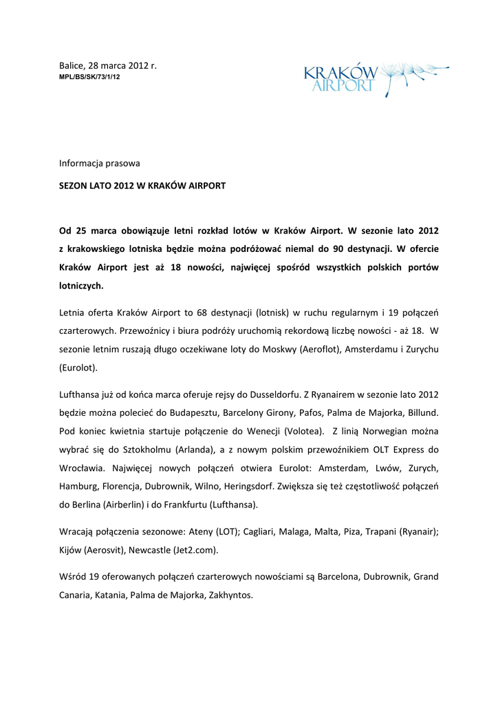 Balice, 28 marca 2012 r. MPL/BS/SK/73/1/12 Informacja prasowa SEZON LATO 2012 W KRAKÓW AIRPORT Od 25 marca obowiązuje letni rozkład lotów w Kraków Airport. W sezonie lato 2012 z krakowskiego lotniska będzie można podróżować niemal do 90 destynacji. W ofercie Kraków Airport jest aż 18 nowości, najwięcej spośród wszystkich polskich portów lotniczych. Letnia oferta Kraków Airport to 68 destynacji (lotnisk) w ruchu regularnym i 19 połączeń czarterowych. Przewoźnicy i biura podróży uruchomią rekordową liczbę nowości - aż 18. W sezonie letnim ruszają długo oczekiwane loty do Moskwy (Aeroflot), Amsterdamu i Zurychu (Eurolot). Lufthansa już od końca marca oferuje rejsy do Dusseldorfu. Z Ryanairem w sezonie lato 2012 będzie można polecieć do Budapesztu, Barcelony Girony, Pafos, Palma de Majorka, Billund. Pod koniec kwietnia startuje połączenie do Wenecji (Volotea). Z linią Norwegian można wybrać się do Sztokholmu (Arlanda), a z nowym polskim przewoźnikiem OLT Express do Wrocławia. Najwięcej nowych połączeń otwiera Eurolot: Amsterdam, Lwów, Zurych, Hamburg, Florencja, Dubrownik, Wilno, Heringsdorf. Zwiększa się też częstotliwość połączeń do Berlina (Airberlin) i do Frankfurtu (Lufthansa). Wracają połączenia sezonowe: Ateny (LOT); Cagliari, Malaga, Malta, Piza, Trapani (Ryanair); Kijów (Aerosvit), Newcastle (Jet2.com). Wśród 19 oferowanych połączeń czarterowych nowościami są Barcelona, Dubrownik, Grand Canaria, Katania, Palma de Majorka, Zakhyntos. „Tak zdywersyfikowana siatka połączeń sprawia, że ze stolica Małopolski stała się jeszcze bardziej atrakcyjna turystycznie i biznesowo”. – powiedział Jan Pamuła, Prezes Kraków Airport – „Mam nadzieję, że dzięki temu jeszcze więcej pasażerów wybierze Kraków Airport na początek lub docelowe miejsce podróży, tym bardziej że ceny biletów oraz czas przelotu często stanowią dobrą alternatywę dla podróży tradycyjnymi środkami transportu”. ***************************************************************************************************** Kraków Airport to największe regionalne lotnisko w Polsce, które obsłużyło w 2011 r. ponad 3 mln pasażerów. W obecnym sezonie letnim oferuje połączenia regularne i czarterowe do 87 portów w 28 krajach. W sezonie lato 2012 port współpracuje z 20 liniami lotniczymi - 11 tradycyjnymi oraz 9 niskokosztowymi. Dodatkowe informacje: Urszula Podraza – Rzecznik Prasowy/Kierownik Działu PR Tel. 664 404 486 [email protected]