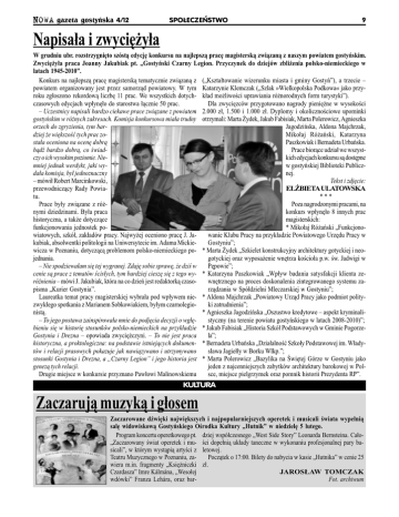 NOWA gazeta gostyñska 4/12 SPO£ECZEÑSTWO 9 Napisa³a i zwyciê¿y³a W grudniu ubr. rozstrzygniêto szóst¹ edycjê konkursu na najlepsz¹ pracê magistersk¹ zwi¹zan¹ z naszym powiatem gostyñskim. Zwyciê¿y³a praca Joanny Jakubiak pt. Gostyñski Czarny Legion. Przyczynek do dziejów zbli¿enia polsko-niemieckiego w latach 1945-2010. Konkurs na najlepsz¹ pracê magistersk¹ tematycznie zwi¹zan¹ z (Kszta³towanie wizerunku miasta i gminy Gostyñ), a trzecie powiatem organizowany jest przez samorz¹d powiatowy. W tym Katarzynie Klemczak (Szlak »Wielkopolska Podkowa« jako przyroku zg³oszono rekordow¹ liczbê 11 prac. We wszystkich dotych- k³ad mo¿liwoci uprawiania ró¿norodnych form turystyki). czasowych edycjach wp³ynê³o do starostwa ³¹cznie 50 prac. Dla zwyciêzców przygotowano nagrody pieniê¿ne w wysokoci Uczestnicy napisali bardzo ciekawe prace zwi¹zane z powiatem 2.000 z³, 1.500 i 1.000 z³. Dyplomy i okolicznociowe upominki gostyñskim w ró¿nych zakresach. Komisja konkursowa mia³a trudny otrzymali: Marta ¯ydek, Jakub Fabisiak, Marta Polerowicz, Agnieszka orzech do zgryzienia, tym barJagodziñska, Aldona Majchrzak, dziej ¿e wiêkszoæ tych prac zoMiko³aj Ró¿añski, Katarzyna sta³a oceniona na ocenê dobr¹ Paszkowiak i Bernadeta Urbañska. b¹d bardzo dobr¹, co wiadPrace bior¹ce udzia³ we wszystczy o ich wysokim poziomie. Niekich edycjach konkursu s¹ dostêpne mniej jednak werdykt, jaki wyw gostyñskiej Biblioteki Publiczda³a komisja, by³ jednoznaczny nej. mówi³ Robert Marcinkowski, Tekst i zdjêcie: przewodnicz¹cy Rady PowiaEL¯BIETA ULATOWSKA tu. *** Prace by³y zwi¹zane z ró¿Poza nagrodzonymi pracami, na nymi dziedzinami. By³a praca konkurs wp³ynê³o 8 innych prac historyczna, a tak¿e dotycz¹ce magisterskich: funkcjonowania jednostek po* Miko³aj Ró¿añski Funkcjonowiatowych, szkó³, zak³adów pracy. Najwy¿ej oceniono pracê J. Jawanie Klubu Pracy na przyk³adzie Powiatowego Urzêdu Pracy w kubiak, absolwentki politologii na Uniwersytecie im. Adama MickieGostyniu; wicza w Poznaniu, dotycz¹c¹ problemom polsko-niemieckiego po- * Marta ¯ydek Szkielet konstrukcyjny architektury gotyckiej i neojednania. gotyckiej oraz wyposa¿enie wnêtrza kocio³a p.w. w. Jadwigi w Nie spodziewa³am siê tej wygranej. Zdajê sobie sprawê, ¿e dzi w Pêpowie; cenie s¹ prace z tematów cis³ych, tym bardziej cieszê siê z tego wy- * Katarzyna Paszkowiak Wp³yw badania satysfakcji klienta zeró¿nienia mówi J. Jakubiak, która na co dzieñ jest redaktork¹ czasownêtrznego na proces doskonalenia zintegrowanego systemu zapisma Kurier Gostynia. rz¹dzania w Spó³dzielni Mleczarskiej w Gostyniu; Laureatka temat pracy magisterskiej wybra³a pod wp³ywem nie- * Aldona Majchrzak Powiatowy Urz¹d Pracy jako podmiot polityzwyk³ego spotkania z Marianem Sobkowiakiem, by³ym czarnolegioki zatrudnienia; nist¹. * Agnieszka Jagodziñska Oszustwo kredytowe aspekt kryminali To jego postawa zainspirowa³a mnie do podjêcia decyzji o wg³êstyczny (na terenie powiatu gostyñskiego w latach 2008-2010); bieniu siê w historiê stosunków polsko-niemieckich na przyk³adzie * Jakub Fabisiak Historia Szkó³ Podstawowych w Gminie PogorzeGostynia i Drezna opowiada zwyciê¿czyni. To nie jest praca la; historyczna, a proktologiczna: na podstawie istniej¹cych dokumen- * Bernadeta Urbañska Dzia³alnoæ Szko³y Podstawowej im. W³adytów i relacji prasowych pokazuje jak nawi¹zywano i utrzymywano s³awa Jagie³³y w Borku Wlkp.; stosunki Gostynia i Drezna, a Czarny Legion i jego historia jest * Marta Polerowicz Bazylika na wiêtej Górze w Gostyniu jako genez¹ tych relacji. jeden z najcenniejszych zabytków architektury barokowej w PolDrugie miejsce w konkursie przyznano Paw³owi Malinowskiemu sce, miejsce pielgrzymek oraz pomnik historii Prezydenta RP. KULTURA Zaczaruj¹ muzyk¹ i g³osem Zaczarowane dwiêki najwiêkszych i najpopularniejszych operetek i musicali wiata wype³ni¹ salê widowiskow¹ Gostyñskiego Orodka Kultury Hutnik w niedzielê 5 lutego. Program koncertu operetkowego pt. dziej wspó³czesnego West Side Story Leonarda Bernsteina. Ca³oZaczarowany wiat operetek i mu- ci dope³ni¹ uk³ady taneczne w wykonaniu profesjonalnej pary basicali, w którym wyst¹pi¹ artyci z letowej. Teatru Muzycznego w Poznaniu, zaPocz¹tek o 17:00. Bilety do nabycia w kasie Hutnika w cenie 25 wiera m.in. fragmenty Ksiê¿niczki z³. JAROS£AW TOMCZAK Czardasza Imre Kálmána, Weso³ej Fot. archiwum wdówki Franza Lehára, oraz bar-
