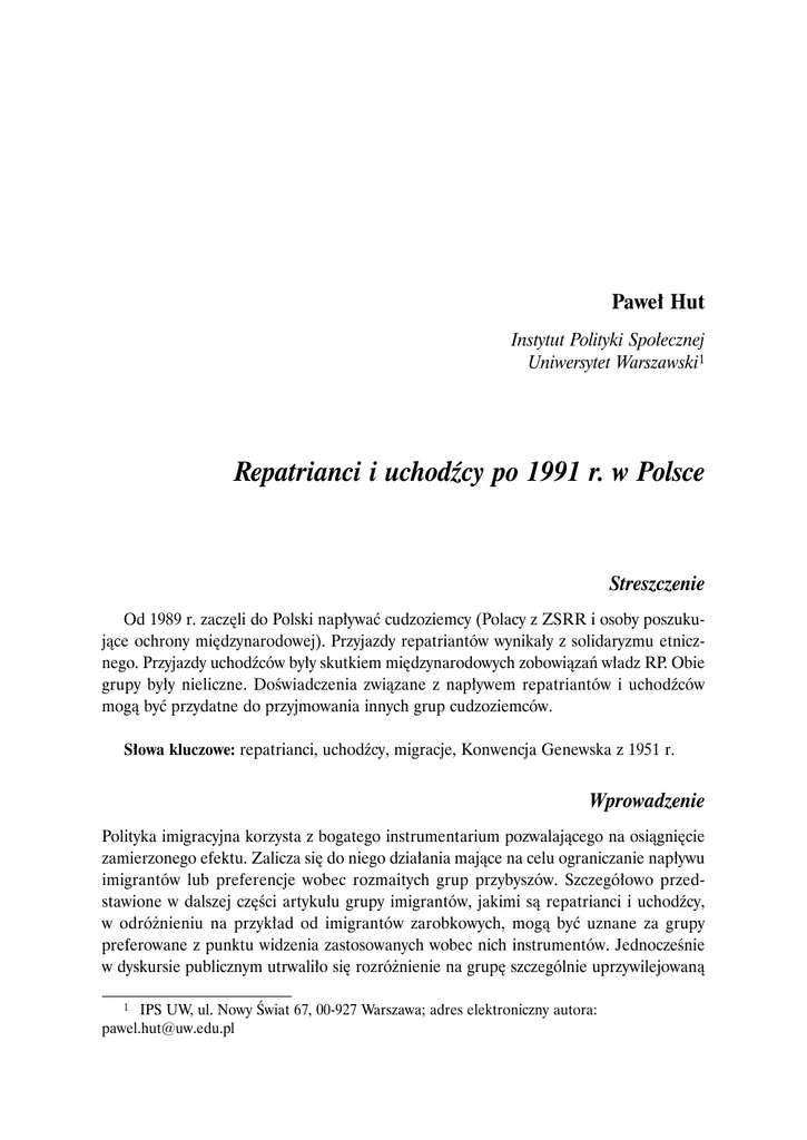 Paweł Hut Instytut Polityki Społecznej Uniwersytet Warszawski1 Repatrianci i uchodźcy po 1991 r. w Polsce Streszczenie Od 1989 r. zaczęli do Polski napływać cudzoziemcy (Polacy z ZSRR i osoby poszukujące ochrony międzynarodowej). Przyjazdy repatriantów wynikały z solidaryzmu etnicznego. Przyjazdy uchodźców były skutkiem międzynarodowych zobowiązań władz RP. Obie grupy były nieliczne. Doświadczenia związane z napływem repatriantów i uchodźców mogą być przydatne do przyjmowania innych grup cudzoziemców. Słowa kluczowe: repatrianci, uchodźcy, migracje, Konwencja Genewska z 1951 r. Wprowadzenie Polityka imigracyjna korzysta z bogatego instrumentarium pozwalającego na osiągnięcie zamierzonego efektu. Zalicza się do niego działania mające na celu ograniczanie napływu imigrantów lub preferencje wobec rozmaitych grup przybyszów. Szczegółowo przedstawione w dalszej części artykułu grupy imigrantów, jakimi są repatrianci i uchodźcy, w odróżnieniu na przykład od imigrantów zarobkowych, mogą być uznane za grupy preferowane z punktu widzenia zastosowanych wobec nich instrumentów. Jednocześnie w dyskursie publicznym utrwaliło się rozróżnienie na grupę szczególnie uprzywilejowaną IPS UW, ul. Nowy Świat 67, 00-927 Warszawa; adres elektroniczny autora: [email protected] 1 48 Paweł Hut – repatriantów, których przyjazdy wynikały z chęci zadośćuczynienia ofiarom stalinowskiej polityki etnicznej, oraz grupę niejako „przymusowo” uprzywilejowaną – osoby poszukujące ochrony międzynarodowej na terytorium Polski. Jednoznaczną przesłanką tego rozróżnienia była (i jest) kwestia nadawania obywatelstwa RP. W przypadku repatriantów, po spełnieniu określonych prawem warunków, nadawanie obywatelstwa odbywa się z mocy prawa w momencie wjazdu na obszar Polski. Natomiast osoby, które wnioskują w Polsce o nadanie statusu uchodźcy i uzyskują ten status, mogą nabyć obywatelstwo RP, a co za tym idzie – uprawnienia polityczne, po długotrwałym pobycie w Polsce2. Warto też nadmienić, że wbrew pojawiającym się co pewien czas wypowiedziom publicystycznym wieszczącym wzmożony napływ repatriantów lub uchodźców, obie grupy były i są w Polsce nieliczne, przy czym – ze względu na uwarunkowania prawne tych migracji – repatrianci częściej niż uchodźcy osiedlali się indywidualnie w małych miejscowościach. W dalszej części artykułu zostaną przedstawione kluczowe informacje związane z obiema formami imigracji, w tym okoliczności tworzenia przepisów repatriacyjnych i uchodźczych oraz dane statystyczne. Dla pełnej charakterystyki zostaną także wykorzystane dane pozyskane podczas badań przeprowadzonych przeze mnie w obu tych grupach imigrantów3. Uwarunkowania przesiedleń i uchodźstwa po 1989/1990 r. Przełom lat 1989/1990 spowodował głębokie zmiany polityczne, społeczne i gospodarcze w regionie Europy Środkowo-Wschodniej, które miały istotny wpływ na kształtowanie się postaw migracyjnych i na zarządzanie ruchem przestrzennym ludności. Obywatele państw bloku wschodniego po dziesięcioleciach ograniczeń powszechnie uzyskali swobodę przemieszczania się poza terytorium kraju obywatelstwa. Pogłębiane od drugiej połowy lat 80. kontakty ze środowiskami Polaków w Związku Radzieckim pozwalały przypuszczać, że duża część obywateli ZSRR narodowości polskiej byłaby zainteresowana trwałym osiedleniem się w Polsce4. Można było tak sądzić, tym bardziej, że dwie masowe akcje przesiedleńcze z lat 1944–1950 oraz 1955–1959 pozwoliły wprawdzie na przemieszczenie się prawie dwóch milionów osób, niemniej jednak istniały dokumenty urzędowe i świadectwa potwierdzające, że nie mogli w nich uczestniczyć wszyscy zainteresowani (Ruchniewicz 2000; Srebrakowski 2001; Hut 2002). Uznawano zatem, 2 Regulacje związane z nabywaniem obywatelstwa są określone ustawowo. Polskie przepisy w art. 14 ustawy o obywatelstwie odwołują się do ius sanguinis – „prawa krwi”, zgodnie z którym o obywatelstwie nie decyduje miejsce urodzenia, ale obywatelstwo rodziców. 3 Są to badania w grupach przesiedleńców-repatriantów (2000, 2011) oraz osób ubiegających się o objęcie ich ochroną międzynarodową (2004–2007). 4 Indywidualne, prywatne i rodzinne kontakty z Polakami w ZSRR stały się możliwe dopiero po względnej liberalizacji ruchu migracyjnego w czasie „odwilży” zapoczątkowanej przez Nikitę Chruszczowa. Faktycznym przełomem była jednak dopiero oficjalna wizyta Wojciecha Jaruzelskiego w Wilnie w 1986 r. i spotkanie z przedstawicielami mniejszości polskiej w Litewskiej SRR. Od 1988 r. nastąpiła intensyfikacja działań podejmowanych przez Kościół katolicki i Związek Harcerstwa Rzeczypospolitej na dawnych Kresach Wschodnich. Repatrianci i uchodźcy po 1991 r. w Polsce 49 że po dwóch dekadach nadal wiele osób chciałoby opuścić granice Związku Radzieckiego i żyć w Polsce. Nowe okoliczności związane z ruchem przestrzennym ludności stwarzała także przyjęta przez stronę polską i obowiązująca od grudnia 1991 r. Konwencja Genewska z 1951 r. dotycząca statusu uchodźcy5. Na jej mocy władze RP zobowiązywały się udzielić ochrony międzynarodowej cudzoziemcom, którzy z przyczyn wskazanych w tejże Konwencji musieli wyemigrować z terytorium swoich państw zamieszkania6. Uwzględniając zróżnicowanie w poziomie rozwoju gospodarczego pomiędzy Polską i państwami EWG w ówczesnym okresie, należy stwierdzić, że nie istniały realne przesłanki do uznania tej formy migracji za istotną w momencie przystępowania Polski do grona państw-stron Konwencji Genewskiej z 1951 r. Następujące w późniejszym czasie wydarzenia stworzyły sytuację, w której władze polskie, mając instrumentarium prawne ograniczone wyłącznie do regulacji wynikających ze zobowiązań międzynarodowych (status uchodźcy), zostały zmuszone do zmierzenia się z presją