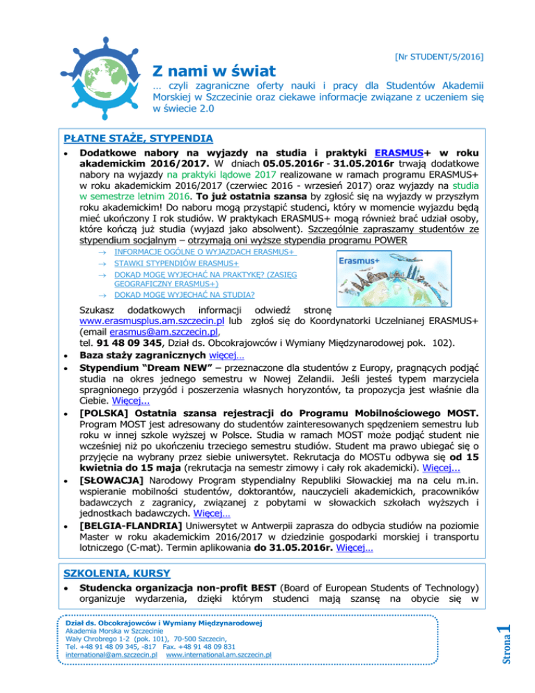 [Nr STUDENT/5/2016] Z nami w świat … czyli zagraniczne oferty nauki i pracy dla Studentów Akademii Morskiej w Szczecinie oraz ciekawe informacje związane z uczeniem się w świecie 2.0 PŁATNE STAŻE, STYPENDIA Dodatkowe nabory na wyjazdy na studia i praktyki ERASMUS+ w roku akademickim 2016/2017. W dniach 05.05.2016r - 31.05.2016r trwają dodatkowe nabory na wyjazdy na praktyki lądowe 2017 realizowane w ramach programu ERASMUS+ w roku akademickim 2016/2017 (czerwiec 2016 - wrzesień 2017) oraz wyjazdy na studia w semestrze letnim 2016. To już ostatnia szansa by zgłosić się na wyjazdy w przyszłym roku akademickim! Do naboru mogą przystąpić studenci, który w momencie wyjazdu będą mieć ukończony I rok studiów. W praktykach ERASMUS+ mogą również brać udział osoby, które kończą już studia (wyjazd jako absolwent). Szczególnie zapraszamy studentów ze stypendium socjalnym – otrzymają oni wyższe stypendia programu POWER INFORMACJE OGÓLNE O WYJAZDACH ERASMUS+ STAWKI STYPENDIÓW ERASMUS+ DOKĄD MOGĘ WYJECHAĆ NA PRAKTYKĘ? (ZASIĘG GEOGRAFICZNY ERASMUS+) DOKĄD MOGĘ WYJECHAĆ NA STUDIA? Szukasz dodatkowych informacji odwiedź stronę www.erasmusplus.am.szczecin.pl lub zgłoś się do Koordynatorki Uczelnianej ERASMUS+ (email [email protected], tel. 91 48 09 345, Dział ds. Obcokrajowców i Wymiany Międzynarodowej pok. 102). Baza staży zagranicznych więcej… Stypendium “Dream NEW” – przeznaczone dla studentów z Europy, pragnących podjąć studia na okres jednego semestru w Nowej Zelandii. Jeśli jesteś typem marzyciela spragnionego przygód i poszerzenia własnych horyzontów, ta propozycja jest właśnie dla Ciebie. Więcej... [POLSKA] Ostatnia szansa rejestracji do Programu Mobilnościowego MOST. Program MOST jest adresowany do studentów zainteresowanych spędzeniem semestru lub roku w innej szkole wyższej w Polsce. Studia w ramach MOST może podjąć student nie wcześniej niż po ukończeniu trzeciego semestru studiów. Student ma prawo ubiegać się o przyjęcie na wybrany przez siebie uniwersytet. Rekrutacja do MOSTu odbywa się od 15 kwietnia do 15 maja (rekrutacja na semestr zimowy i cały rok akademicki). Więcej... [SŁOWACJA] Narodowy Program stypendialny Republiki Słowackiej ma na celu m.in. wspieranie mobilności studentów, doktorantów, nauczycieli akademickich, pracowników badawczych z zagranicy, związanej z pobytami w słowackich szkołach wyższych i jednostkach badawczych. Więcej… [BELGIA-FLANDRIA] Uniwersytet w Antwerpii zaprasza do odbycia studiów na poziomie Master w roku akademickim 2016/2017 w dziedzinie gospodarki morskiej i transportu lotniczego (C-mat). Termin aplikowania do 31.05.2016r. Więcej… SZKOLENIA, KURSY Dział ds. Obcokrajowców i Wymiany Międzynarodowej Akademia Morska w Szczecinie Wały Chrobrego 1-2 (pok. 101), 70-500 Szczecin, Tel. +48 91 48 09 345, -817 Fax. +48 91 48 09 831 [email protected] www.international.am.szczecin.pl 1 Studencka organizacja non-profit BEST (Board of European Students of Technology) organizuje wydarzenia, dzięki którym studenci mają szansę na obycie się w Strona międzynarodowym środowisku, nawiązanie kontaktów, udoskonalenie znajomości języka angielskiego oraz dobrą zabawę. Przez cały rok lokalne grupy BEST organizują krótkie (1-2 tygodniowe) kursy, dzięki którym studenci mają okazję pogłębić swoją wiedzę na wybrany temat. BEST organizuje także seminaria naukowe, konkursy oraz imprezy rozrywkowe. W każdym kursie organizowanym przez BEST bierze udział 20-30 studentów. Więcej… KONKURSY, WYDARZENIA… Konkurs "Young Code Architects". Weź udział w konkursie i wygraj płatny staż w Dziale Produkcji Oprogramowania! Young Code Architects to cykliczny konkurs dla programistów organizowany przez firmę Streamsoft. Konkurs skierowany jest do studentów, absolwentów szkół wyższych z całej Polski oraz do pasjonatów, którzy chcieliby związać swoją przyszłość z branżą IT. To również okazja do zdobycia płatnego stażu i rozpoczęcia kariery zawodowej jako programista w firmie o ugruntowanej pozycji na rynku. Termin nadsyłania prac do 16 maja 2016 r. Więcej… Konkurs stypendialny „Ekologia w transporcie drogowym w Europie”. Clicktrans.pl, największy w Polsce serwis aukcji transportowych, ogłasza I edycję ogólnopolskiego konkursu stypendialnego „Ekologia w transporcie drogowym w Europie – nowe rozwiązania, szanse i wyzwania”. Celem Konkursu jest szerzenie wiedzy o ekologii w transporcie. Na zwycięzców czekają nagrody pieniężne o łącznej wartości 2000 zł! Zadaniem konkursowym jest przesłanie do 31.05.2016r. analizy obecnej sytuacji na rynku transportowym w Europie ze szczególnym uwzględnieniem aspektu ekologii w transporcie oraz zaproponowanie innowacyjnego połączenia transportu i idei ochrony środowiska. Oprócz pracy pisemnej (do 15 000 znaków), uczestnicy mogą przesłać załączniki w dowolnej formie - mile widziane są szczególnie filmy video, infografiki oraz zdjęcia. Więcej… Konkurs na nowe logo Politechniki Łódzkiej. Rektor PŁ ogłasza Konkurs na nowe logo oraz system identyfikacji wizualnej Politechniki Łódzkiej. Celem Konkursu jest wyłonienie projektu graficznego logo PŁ, na podstawie którego zostanie stworzony nowy system identyfikacji wizualnej. Władzom uczelni zależy, aby nowy system identyfikacji zwracał uwagę na nowoczesność i prestiż oraz renomę Uczelni, podkreślając równocześnie jej bogatą historię i tradycję. Konkurs ma charakter otwarty, ogólnopolski, trzyetapowy. Termin nadsyłania prac do 06.06.2016r. Więcej… PRAKTYKI Baza praktyk zagranicznych więcej… Baza praktyk zagranicznych więcej… IAESTE oferuje praktyki za granicą dla studentów Polskich uczelni wyższych, głównie kierunków technicznych. Najczęściej trwają one od 6 do 12 tygodni i mogą się odbywać w jednym z ponad 90 krajów świata. Więcej… Parlament Europejski oferuje pła