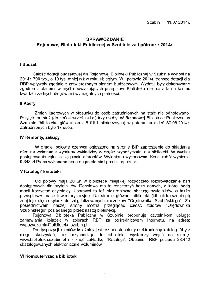Szubin 11.07.2014r. SPRAWOZDANIE Rejonowej Biblioteki Publicznej w Szubinie za I półrocze 2014r. I Budżet Całość dotacji budżetowej dla Rejonowej Biblioteki Publicznej w Szubinie wynosi na 2014r. 790 tys., o 10 tys. mniej niż w roku ubiegłym. W I połowie 2014r. transze dotacji dla RBP wpływały zgodnie z zatwierdzonym planem budżetowym. Wydatki były dokonywane zgodnie z planem, w myśl obowiązujących przepisów. Biblioteka nie posiada na koniec kwartału żadnych długów ani wymagalnych płatności. II Kadry Zmian kadrowych w stosunku do osób zatrudnionych na stałe nie odnotowano. Przyjęto na staż (do końca września br.) trzy osoby. W Rejonowej Bibliotece Publicznej w Szubinie (biblioteka główna oraz 6 filii bibliotecznych) wg stanu na dzień 30.06.2014r. Zatrudnionych było 17 osób. IV Remonty, zakupy W drugiej połowie czerwca ogłoszono na stronie BIP zaproszenie do składania ofert na wykonanie wymiany wykładziny w części wypożyczalni dla biblioteki. W wyniku postępowania zgłosiło się pięciu oferentów. Wyłoniono wykonawcę. Koszt robót wyniesie 9.348 zł Prace wykonane będa na przełomie lipca i sierpnia br. V Katalogi/ kartoteki Od połowy maja 2012r. w bibliotece miejskiej rozpoczęto rozprowadzanie kart dostępowych dla czytelników. Docelowo ma to rozszerzyć bazę danych, z której będą mogli korzystać czytelnicy. Usprawni to też elektroniczną obsługę czytelników, a także przyspieszy prace inwentaryzacyjne. Na stronie głównej biblioteki (biblioteka.szubin.pl) znajduje się odsyłacz do zdigitalizowanych roczników "Orędownika Szubińskiego". Za pośrednictwem naszej strony można przeglądać całość zbiorów "Orędownika Szubińskiego" posiadanego przez naszą bibliotekę. Rejonowa Biblioteka Publiczna w Szubinie proponuje czytelnikom usługę: zamawiania książek w zbiorach RBP za pośrednictwem Internetu, na adres; [email protected] Do dyspozycji klientów książnicy jest też udostępniony elektroniczny katalog. Aby z niego skorzystać, nie przychodząc do biblioteki, wystarczy wejść na stronę: www.biblioteka.szubin.pl i kliknąć zakładkę: "Katalogi". Obecnie RBP posiada 23.442 skatalogowanych elektronicznie woluminów. VI Komputeryzacja bibliotek 1 Nasycenie sprzętem komputerowym bibliotek Gminy i Miasta Szubin jest zadawalające. Obecnie RBP w swej siedzibie w Szubinie, posiada 22 komputery z tego z dostępem do Internetu 21 w tym 2 służą jako dostęp do katalogu on-line. Dla czytelników dostępnych jest 9 stanowisk komputerowych z dostępem do Internetu. Filia biblioteczna w Rynarzewie posiada 3 stanowiska komputerowe (w tym 2 dla czytelników), Filia w Samoklęskach 4 stanowiska (w tym 3 dla czytelników). Filia w Chomętowie 4 stanowiska (3 udostępnione czytelnikom). Placówka w Słonawach 2 stanowiska, a Filia w Królikowie 3 stanowiska komputerowe (wszystkie z dostępem dla czytelników). Obecnie prowadzi się zakup zbiorów oraz opracowanie i ich katalogowanie drogą elektroniczną. Wszystkie biblioteki wiejskie posiadają komputery z szerokim łączem internetowym. Łącznie RBP dysponuje 38 komputerami w tym z dostępem do Internetu 37, a dostępnych dla czytelnikow 23. Należy dodać, że stan techniczny sieci komputerowej poprawia się z roku na rok i jest obecnie dość dobry. Oprogramowanie RBP wykorzystuje oprogramowanie "MAK+". Ponadto każda jednostka wyposażona jest w oprogramowanie legalne najczęściej Windows, Corel, Word, ale też w oprogramowanie ogólnie dostępne w formie nieodpłatnej jak Open Office. Program MAK+ wykorzystuje się w siedzibie RBP w celu katalogowania i opracowywania zbiorów. Źródła finansowania Podstawą finansowania komputeryzacji w RBP w Szubinie jest dotacja Samorządu. W roku minionym otrzymaliśmy darowiznę w postaci trzech komputerów z Programu Rozwoju Bibliotek. Poza tym część zakupów, w miarę możliwości, realizujemy ze środków własnych. Dostęp do Internetu Jak wspomnieliśmy wyżej dostęp czytelników do Internetu w naszych placówkach jest dobry. RBP posiada 8-megowe łącze. Filie z reguły 2-megowe. Od dnia 20 stycznia 2006r. Rejonowa Biblioteka Publiczna w Szubinie proponuje czytelnikom usługę zamawiania pozycji książkowych, będących w zbiorach RBP, za pośrednictwem Internetu na adres; [email protected]. Do dyspozycji klientów książnicy jest też udostępniony elektroniczny katalog zbiorów dostępny na stronie biblioteki. Od maja 2006r. prezentujemy też indeks zbiorów niemieckojęzycznych. W linkach strony umieszczona jest baza danych dotyczących Szubina na stronach Wielkopolskiej Biblioteki Internetowej. VII Szkolenia W pierwszej połowie roku wszyscy pracownicy merytoryczni wzięli udział w dwóch naradach połączonych ze szkoleniami. Szkolenia dotyczyły m.in. Pracy z dziećmi i mlodzieżą w bibliotekach publicznych oraz przestrzegania zapisów Ustawy o ochronie danych osobowych w realiach bibliotek publicznych. Dyrektor RBP prowadzi co miesiąc narady robocze z zespołem mające na celu bieżącą ocenę pracy pracowników i wyznaczanie kierunków działań na najbliższy miesiąc. W miarę potrzeby dyrektor RBP deleguje pracowników na szkolenia zewnętrzne. W pierwszej połowie roku kontynuowano szkolenia w ramach programów PRB i Biblioteka+ Wzięło w nich udział czterech pracowników oraz dyrektor RBP. W trzech szkoleniach wyjazdowych brali udział pracownicy działu księgowości i kadr. 2 VIII Główne zadania realizowane przez działy RBP Szubin Oprócz zakupu, opracowania i udostępniania zbiorów oraz organizacji różnych form kulturalnych i oświatowych parcownicy wszystkich działów byli zaangażowani w kompleksową inwentaryzację zbiorów Rejonowej Biblioteki Publicznej w Szubinie. Ponadto realizowano sprawozdawczość oraz inne prace bibliotekarskie. IX Ważniejsze imprezy kulturalno-oświatowe przeprowadzone w Bibliotekach Publicznych Gminy i Miasta Szubin Oddział dla dzieci i młodzieży Rejonow