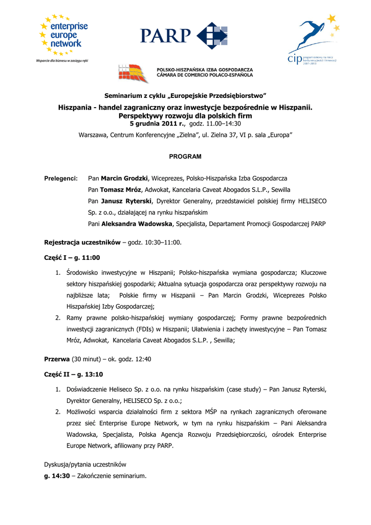 Seminarium z cyklu „Europejskie Przedsiębiorstwo” Hiszpania - handel zagraniczny oraz inwestycje bezpośrednie w Hiszpanii. Perspektywy rozwoju dla polskich firm 5 grudnia 2011 r., godz. 11.00–14:30 Warszawa, Centrum Konferencyjne „Zielna”, ul. Zielna 37, VI p. sala „Europa” PROGRAM Prelegenci: Pan Marcin Grodzki, Wiceprezes, Polsko-Hiszpańska Izba Gospodarcza Pan Tomasz Mróz, Adwokat, Kancelaria Caveat Abogados S.L.P., Sewilla Pan Janusz Ryterski, Dyrektor Generalny, przedstawiciel polskiej firmy HELISECO Sp. z o.o., działającej na rynku hiszpańskim Pani Aleksandra Wadowska, Specjalista, Departament Promocji Gospodarczej PARP Rejestracja uczestników – godz. 10:30–11:00. Część I – g. 11:00 1. Środowisko inwestycyjne w Hiszpanii; Polsko-hiszpańska wymiana gospodarcza; Kluczowe sektory hiszpańskiej gospodarki; Aktualna sytuacja gospodarcza oraz perspektywy rozwoju na najbliższe lata; Polskie firmy w Hiszpanii – Pan Marcin Grodzki, Wiceprezes Polsko Hiszpańskiej Izby Gospodarczej; 2. Ramy prawne polsko-hiszpańskiej wymiany gospodarczej; Formy prawne bezpośrednich inwestycji zagranicznych (FDIs) w Hiszpanii; Ułatwienia i zachęty inwestycyjne – Pan Tomasz Mróz, Adwokat, Kancelaria Caveat Abogados S.L.P. , Sewilla; Przerwa (30 minut) – ok. godz. 12:40 Część II – g. 13:10 1. Doświadczenie Heliseco Sp. z o.o. na rynku hiszpańskim (case study) – Pan Janusz Ryterski, Dyrektor Generalny, HELISECO Sp. z o.o.; 2. Możliwości wsparcia działalności firm z sektora MŚP na rynkach zagranicznych oferowane przez sieć Enterprise Europe Network, w tym na rynku hiszpańskim – Pani Aleksandra Wadowska, Specjalista, Polska Agencja Rozwoju Przedsiębiorczości, ośrodek Enterprise Europe Network, afiliowany przy PARP. Dyskusja/pytania uczestników g. 14:30 – Zakończenie seminarium.