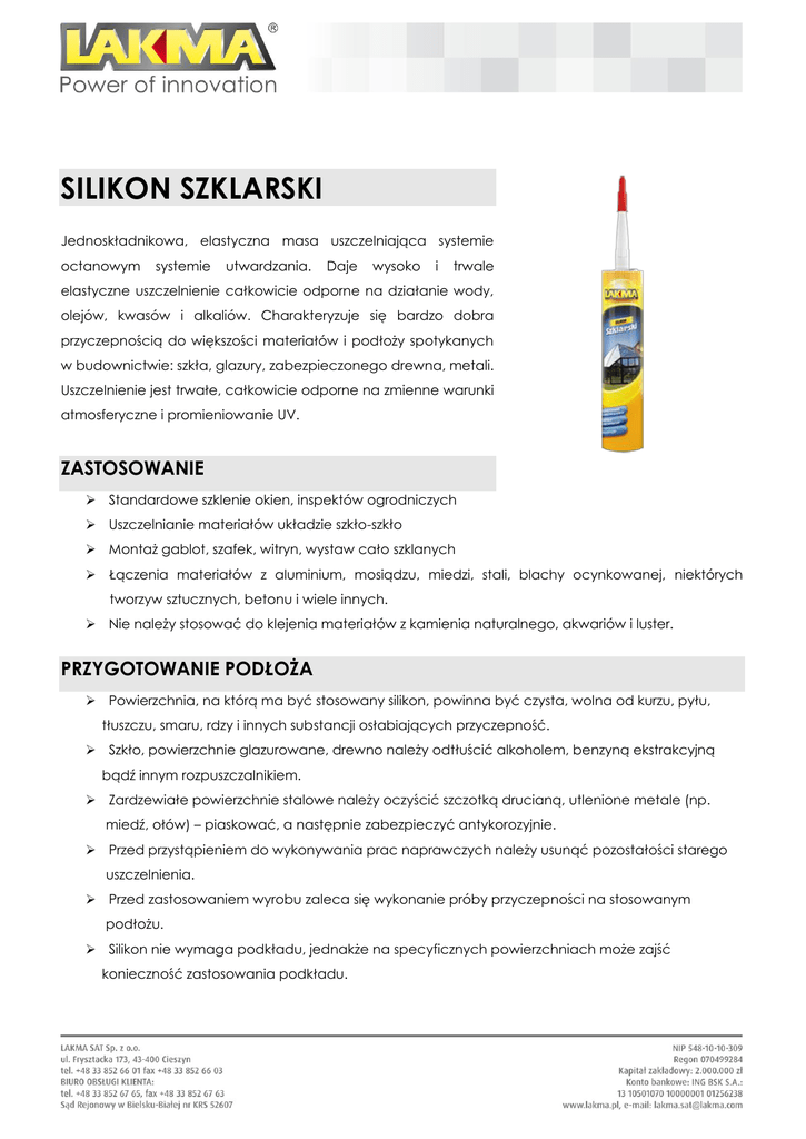 SILIKON SZKLARSKI Jednoskładnikowa, elastyczna masa uszczelniająca systemie octanowym systemie utwardzania. Daje wysoko i trwale elastyczne uszczelnienie całkowicie odporne na działanie wody, olejów, kwasów i alkaliów. Charakteryzuje się bardzo dobra przyczepnością do większości materiałów i podłoży spotykanych w budownictwie: szkła, glazury, zabezpieczonego drewna, metali. Uszczelnienie jest trwałe, całkowicie odporne na zmienne warunki atmosferyczne i promieniowanie UV. ZASTOSOWANIE Standardowe szklenie okien, inspektów ogrodniczych Uszczelnianie materiałów układzie szkło-szkło Montaż gablot, szafek, witryn, wystaw cało szklanych Łączenia materiałów z aluminium, mosiądzu, miedzi, stali, blachy ocynkowanej, niektórych tworzyw sztucznych, betonu i wiele innych. Nie należy stosować do klejenia materiałów z kamienia naturalnego, akwariów i luster. PRZYGOTOWANIE PODŁOŻA Powierzchnia, na którą ma być stosowany silikon, powinna być czysta, wolna od kurzu, pyłu, tłuszczu, smaru, rdzy i innych substancji osłabiających przyczepność. Szkło, powierzchnie glazurowane, drewno należy odtłuścić alkoholem, benzyną ekstrakcyjną bądź innym rozpuszczalnikiem. Zardzewiałe powierzchnie stalowe należy oczyścić szczotką drucianą, utlenione metale (np. miedź, ołów) – piaskować, a następnie zabezpieczyć antykorozyjnie. Przed przystąpieniem do wykonywania prac naprawczych należy usunąć pozostałości starego uszczelnienia. Przed zastosowaniem wyrobu zaleca się wykonanie próby przyczepności na stosowanym podłożu. Silikon nie wymaga podkładu, jednakże na specyficznych powierzchniach może zajść konieczność zastosowania podkładu. SPOSÓB UŻYCIA Przed przystąpieniem do aplikacji silikonu obrzeża zabezpieczyć taśmą maskującą. Obciąć końcówkę kartusza pozostawiając część gwintu Aplikator nakręcić na gwint, obciąć pod kątem w szerokości dostosowanej do wykonywanej spoiny. Nakładać za pomocą pistoletów ręcznych lub pneumatycznych. Nałożony silikon można wygładzać szpachelką do rozprowadzania silikonu zmoczoną w roztworze z mydła. Należy stosować narzędzia z tworzywa sztucznego lub stali nierdzewnej. Silikon utwardza się poprzez reakcję wilgoci z powietrza, w związku z tym uszczelnienia należy wykonywać w warunkach umożliwiających dostęp powietrza. Przemywanie utwardzonej spoiny ogólnie dostępnymi środkami czystości przedłuża jej żywotność Po zakończeniu pracy narzędzia wytrzeć ręcznikiem papierowym i umyć rozpuszczalnikiem. DANE TECHNICZNE Typ utwardzania System utwardzania Czas obróbki Czas pełnego utwardzenia Temperatura aplikacji (stosowania) Odporność termiczna (utwardzonego produktu) Poprzeczny moduł rozciągający w temp. 23°C wg ISO 8339 Twardość Shore A Gęstość Wydłużenie przy zerwaniu wg ISO 8339 Wydajność Kolorystyka Przechowywanie i transport jednokomponentowy – sieciuje wilgocią z powietrza Octanowy ok 25min 2mm/24h przy zachowaniu wilgotności względnej 55% +5° do +40°C -40° do +180°C 0,36 N/mm2 ok. 18 °Sh 0,98 – 1,05 g/cm3 150% Z kartusza 300ml uzyskuje się ok. 18mb spoiny o wymiarach 4x4mm Biały, bezbarwny, szary, czarny, brązowy W oryginalnie zamkniętych opakowaniach w suchych i chłodnych pomieszczeniach przez okres 18 miesięcy od dnia produkcji w temperaturach od +5° do +35°C INFORMACJE LOGISTYCZNE Kolorystyka Pojemność opakowania jednostkowego Ilość sztuk w opakowaniu zbiorczym Ilość opakowań na palecie Biały, bezbarwny 300ml 15szt. 1260szt. Biały, bezbarwny 600ml 20szt. 960szt. DOPUSZCZENIA, ATESTY, NORMY Karta Charakterystyki Deklaracja Właściwości Użytkowych 4/U/2015 BHP I OSTRZEŻENIA S2 - Chronić przed dziećmi Aktualizacja 27.04.2015 Informacje zawarte w niniejszej Karcie Technicznej mają na celu zapewnienie optymalnego wykorzystania produktu, jednak nie są podstawą do odpowiedzialności prawnej Producenta, gdyż warunki wykonawstwa pozostają poza jego kontrolą. Zaproponowane sposoby postępowania uznane są za powszechne, jednak każdy z użytkowników tego materiału powinien upewnić się na wszelkie możliwe sposoby, włącznie ze sprawdzeniem produktu końcowego, o przydatności dostarczanych materiałów do osiągnięcia zamierzonych celów. W przypadku połączenia z wyrobami innych Producentów nie ponosimy żadnej odpowiedzialności. Powyższe dane, zalecenia i wskazówki opierają się na naszej najlepszej wiedzy, badaniach oraz doświadczeniach i zostały udzielone w dobrej wierze, zgodnie z zasadami obowiązującymi w naszej firmie i u naszych dostawców. Producent zastrzega sobie prawo do zmiany treści w kolejnych edycjach bez wcześniejszego informowania o tym fakcie odbiorców. Wraz z ukazaniem się tej Karty Technicznej, karty wcześniejsze tracą ważność.