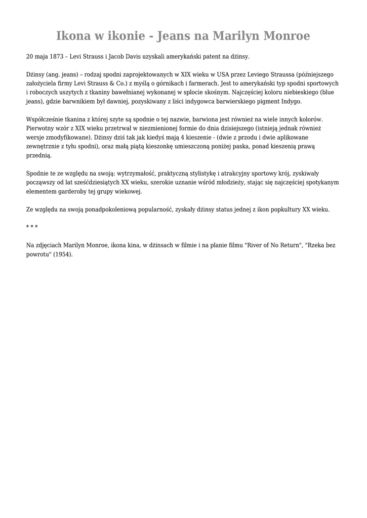Ikona w ikonie - Jeans na Marilyn Monroe 20 maja 1873 – Levi Strauss i Jacob Davis uzyskali amerykański patent na dżinsy. Dżinsy (ang. jeans) – rodzaj spodni zaprojektowanych w XIX wieku w USA przez Leviego Straussa (późniejszego założyciela firmy Levi Strauss & Co.) z myślą o górnikach i farmerach. Jest to amerykański typ spodni sportowych i roboczych uszytych z tkaniny bawełnianej wykonanej w splocie skośnym. Najczęściej koloru niebieskiego (blue jeans), gdzie barwnikiem był dawniej, pozyskiwany z liści indygowca barwierskiego pigment Indygo. Współcześnie tkanina z której szyte są spodnie o tej nazwie, barwiona jest również na wiele innych kolorów. Pierwotny wzór z XIX wieku przetrwał w niezmienionej formie do dnia dzisiejszego (istnieją jednak również wersje zmodyfikowane). Dżinsy dziś tak jak kiedyś mają 4 kieszenie - (dwie z przodu i dwie aplikowane zewnętrznie z tyłu spodni), oraz małą piątą kieszonkę umieszczoną poniżej paska, ponad kieszenią prawą przednią. Spodnie te ze względu na swoją: wytrzymałość, praktyczną stylistykę i atrakcyjny sportowy krój, zyskiwały począwszy od lat sześćdziesiątych XX wieku, szerokie uznanie wśród młodzieży, stając się najczęściej spotykanym elementem garderoby tej grupy wiekowej. Ze względu na swoją ponadpokoleniową popularność, zyskały dżinsy status jednej z ikon popkultury XX wieku. *** Na zdjęciach Marilyn Monroe, ikona kina, w dżinsach w filmie i na planie filmu "River of No Return", "Rzeka bez powrotu" (1954).