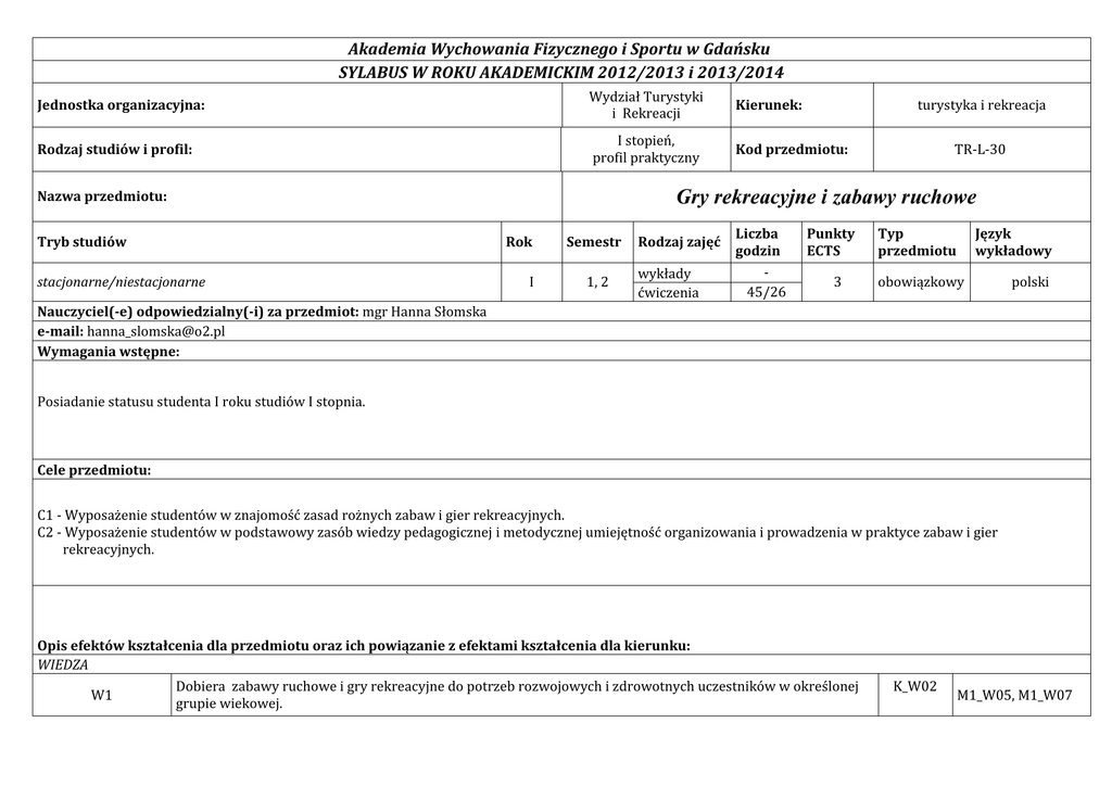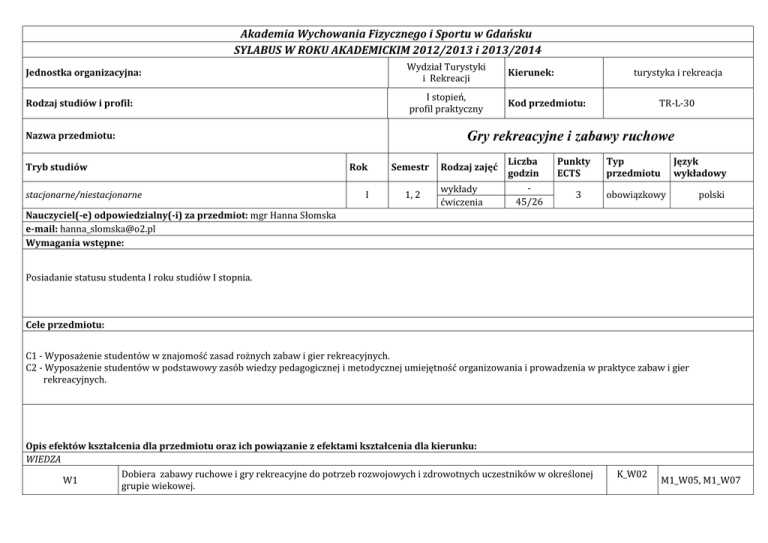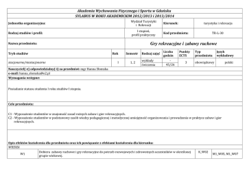 Akademia Wychowania Fizycznego i Sportu w Gdańsku SYLABUS W ROKU AKADEMICKIM 2012/2013 i 2013/2014 Jednostka organizacyjna: Wydział Turystyki i Rekreacji Kierunek: Rodzaj studiów i profil: I stopień, profil praktyczny Kod przedmiotu: stacjonarne/niestacjonarne TR-L-30 Gry rekreacyjne i zabawy ruchowe Nazwa przedmiotu: Tryb studiów turystyka i rekreacja Rok I Semestr 1, 2 Rodzaj zajęć wykłady ćwiczenia Liczba godzin 45/26 Punkty ECTS 3 Typ przedmiotu Język wykładowy obowiązkowy polski Nauczyciel(-e) odpowiedzialny(-i) za przedmiot: mgr Hanna Słomska e-mail: [email protected] Wymagania wstępne: Posiadanie statusu studenta I roku studiów I stopnia. Cele przedmiotu: C1 - Wyposażenie studentów w znajomość zasad rożnych zabaw i gier rekreacyjnych. C2 - Wyposażenie studentów w podstawowy zasób wiedzy pedagogicznej i metodycznej umiejętność organizowania i prowadzenia w praktyce zabaw i gier rekreacyjnych. Opis efektów kształcenia dla przedmiotu oraz ich powiązanie z efektami kształcenia dla kierunku: WIEDZA Dobiera zabawy ruchowe i gry rekreacyjne do potrzeb rozwojowych i zdrowotnych uczestników w określonej W1 grupie wiekowej. K_W02 M1_W05, M1_W07 Zna i potrafi ocenić potrzeby psychofizyczne człowieka , w zakresie niezbędnych dla oceny możliwości podejmowania przez niego aktywności w zakresie gier rekreacyjnych i zabaw ruchowych. K_W02 U1 Planuje i organizuje zajęcia ruchowe dostosowane do posiadanych warunków oraz możliwości i zainteresowań uczestników. K_U06 U2 Prowadzi zajęcia w wybranych formach rekreacyjnych dla osób w różnym wieku. U3 Modyfikuje znane zabawy i gry rekreacyjne w zależności od warunków ich realizacji, zainteresowań i możliwości uczestników zajęć. W2 M1_W03 UMIEJĘTNOŚCI M1_U07, M1_U10 S1P_U02, S1P_U04 K_U07 M1_U01, M1_U07 M1_U11 KU01 K_U04 M1_U10 SIA_U02 M1_U01 KOMPETENCJE K1 Wykazuje dbałość o bezpieczeństwo osób uczestniczących w zajęciach rekreacyjnych. K_K12 K2 Sprawnie komunikuje się z uczestnikami zajęć oraz prawidłowo interpretuje oczekiwania uczestników prowadzonych zajęć. K_K10 K3 Wykazuje aktywność w samodzielnym podejmowaniu zadań, szczególnie w sytuacji potrzeb wynikających ze zmieniających się warunków realizacji zajęć rekreacyjnych. K_K05 M1_K07, S1P_K04 M1_K03 M1_K06, S1P_K04 Kryteria i metody oceny osiągniętych efektów kształcenia: W1- sprawdzian praktyczny, dyskusja (umiejętność definiowania, odtwarzania, powielania, opisywania, planowania oraz dobierania zabaw i gier ruchowych do możliwości uczestników zajęć oraz sposób ich prowadzenia). Zwraca się szczególną uwagę na dostosowanie gier i zabaw do bazy organizacyjnej, potrzeb i poziomu sprawności grupy wiekowej. W2 - sprawdzian praktyczny, dyskusja (umiejętność oceny sytuacji – stanu psychofizycznego uczestników zajęć, zmiennych warunków realizacji, miejsca zajęć oraz zasobów sprzętowych – i dostosowania gier rekreacyjnych i zabaw ). U1 - pisemne opracowanie konspektu zajęć i przeprowadzenie zajęć na wybrany temat (elementy podlegające ocenie to: przeprowadzenie zajęć z zastosowaniem metod, form, zasad i środków określonych zabaw i gier ruchowych. Istotnym elementem oceny będą: organizacja i sprawność w kierowaniu grupą oraz dostosowanie do możliwości i zainteresowań uczestników), U2 - pisemne opracowanie konspektu zajęć, dyskusja (zwraca się uwagę na dobór metod, form i środków uwzględniających możliwości), U3 - sprawdzian praktyczny, dyskusja (umiejętność dostosowania gier i zabaw do oczekiwań uczestników zajęć oraz ich modyfikacji w zależności od możliwości grupy i zmiennych warunków ich realizacji), K1 - obserwacja przedłużona działań praktycznych (studenci, na podstawie obserwacji działań praktycznych, są oceniani za wykazywaną dbałość o bezpieczeństwo) K2 - dyskusja (umiejętność komunikacji z uczestnikami zajęć. Szczególną uwagę zwraca się na właściwą interpretację oczekiwań grupy i jej organizację, na prawidłową terminologię, pokaz i objaśnienie zadań), K3 - dyskusja, obserwacja przedłużona (aktywny udział w zajęciach, szczególnie za kreatywność i samodzielne podejmowanie zadań w sytuacjach wynikających ze zmieniających się warunków realizacji zajęć). Aby uzyskać zaliczenie przedmiotu na ocenę dostateczną student musi osiągnąć wszystkie wymienione w programie efekty kształcenia. Metody i formy realizacji przedmiotu: Ćwiczenia praktyczne - klasyczna metoda problemowa, ćwiczeniowa, metoda zadaniowa ścisła, dyskusja, Przekazanie podstawowej wiedzy teoretycznej następuje podczas pierwszych zajęć ze studentami. Treści kształcenia: Wykłady: brak Ćwiczenia: 1. Podział gier i zabaw, wartości gier i zabaw ruchowych, metodyka nauczania gier i zabaw ruchowych. Konspekt zajęć gier i zabaw ruchowych. 2. Zasady prowadzenia i organizacji zajęć w formie zabaw ruchowych (integracyjnych, orientacyjno-porządkowych, skocznych, bieżnych, rzutnych itp.) oraz umiejętność posługiwania się sprzętem i panowania nad grupą. Przygotowanie konspektu zajęć oraz prowadzenie określonych zestawów zabaw przez studentów. 3. Przepisy oraz zasady organizacji gier rekreacyjnych: "W dwa ognie", "W cztery ognie", "Tenis nożny”, "Przesuwanka", "Ringo zespołowe", "Dętka", "Pięstówka", "Kręgle polskie", "Zośka", "Kometka", "Kwadrant", "Krokiet", "Palant", "Wybijanka", "Boccia", "Rzut podkową", gry regionalne oraz mini gry zespołowe. Przygotowanie konspektu zajęć oraz prowadzenie gier przez studentów. Forma zaliczenia: zaliczenie na ocenę Literatura: Podstawowa: 1. Bondarowicz M., 1983, Zabawy i gry ruchowe. Podstawy metodyczne. AWF, Warszawa. 2. Bondarowicz M. ,1995, Zabawy i gry ruchowe na cztery pory roku (wiosna, lato, jesień, zima). Bellona, Warszawa. 3. Mielniczuk M., Staniszewski T., 1999, Stare i nowe gry drużynowe. Telbit, Warszawa. 4. Toczek - Werner S. ,1995, Rekreacyjne gry ruch