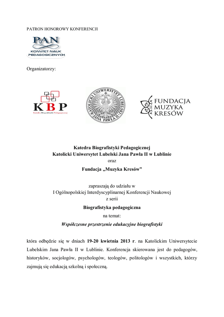 PATRON HONOROWY KONFERENCJI Organizatorzy: Katedra Biografistyki Pedagogicznej Katolicki Uniwersytet Lubelski Jana Pawła II w Lublinie oraz Fundacja „Muzyka Kresów” zapraszają do udziału w I Ogólnopolskiej Interdyscyplinarnej Konferencji Naukowej z serii Biografistyka pedagogiczna na temat: Współczesne przestrzenie edukacyjne biografistyki która odbędzie się w dniach 19-20 kwietnia 2013 r. na Katolickim Uniwersytecie Lubelskim Jana Pawła II w Lublinie. Konferencja skierowana jest do pedagogów, historyków, socjologów, psychologów, teologów, politologów i wszystkich, którzy zajmują się edukacją szkolną i społeczną. Osoby zainteresowane czynnym udziałem w konferencji prosimy o przesyłanie tematów i streszczeń wystąpień do dnia 10 marca 2013 r. Przewidujemy wystąpienia w formie wykładów (15 minut). Komitet Naukowy ks. prof. dr hab. Grzegorz Bujak, Katolicki Uniwersytet Lubelski Jana Pawła II prof. dr hab. Maryia Chepil, Uniwersytet Marii Curie-Skłodowskiej prof. dr hab. Maria Dębowska, Katolicki Uniwersytet Lubelski Jana Pawła II prof. zw. dr hab. Waldemar J. Dziak, Instytut Studiów Politycznych PAN ks. prof. dr hab. Stanisław Fel, Katolicki Uniwersytet Lubelski Jana Pawła II prof. dr hab. Romuald Grzybowski, Uniwersytet Gdański prof. dr hab. Janina Kostkiewicz, Uniwersytet Jagielloński prof. dr hab. Mirosław Kowalski, Uniwersytet Zielonogórski prof. dr hab. Danuta Lalak, Uniwersytet Warszawski prof. dr hab. Igor Macijewski, Rosyjski Instytut Historii Sztuki (Rosja) ks. prof. dr hab. Marian Nowak, Katolicki Uniwersytet Lubelski Jana Pawła II prof. zw. dr hab. Stanisława Steuden, Katolicki Uniwersytet Lubelski Jana Pawła II prof. zw. dr hab. Władysława Szulakiewicz, Uniwersytet Mikołaja Kopernika Cele konferencji W czasach gdy media zalewają nas z każdej strony opowieściami o gwiazdach i celebrytach, ludziach znanych ze względu na ich osiągnięcia lub popełnione „grzechy”, przedstawiając osoby, ich życie prywatne i zawodowe, możemy stwierdzić, że szeroko rozumiana biografistyka bardziej niż kiedykolwiek przeżywa rozkwit. Jednakowoż ważnym jest, aby świat nauki zareagował na to, co podają nam środki masowego przekazu, weryfikował prawdziwość i wartość przedstawianych opowieści i podsuwał własne propozycje biograficzne. Konferencja „Współczesne przestrzenie edukacyjne biografistyki” skierowana jest do pedagogów, socjologów, psychologów, historyków… do wszystkich, którzy zajmują się pisaniem biografii, biografistyką w aspekcie teoretycznym, a także edukacją szkolną i społeczną. Ma ona na celu przedstawienie, przybliżenie i wskazanie nowatorskich sposobów wykorzystania źródeł, z których można korzystać zarówno podczas procesu wychowania, jak i tworzenia biografii. Konferencja ma na celu zwrócenie uwagi na konieczność dostosowania języka materiałów edukacyjnych do potrzeb odbiorców, tak aby nie były obce edukowanym. Rozwój systemu interdyscyplinarności nauk otwiera ogromne pole dla biografistyki, która daje możliwość przedstawiania ludzi, zajmujących się różnymi dziedzinami, prezentowania wzorców osobowych godnych pokazania i zapamiętania. Obszary tematyczne konferencji Autobiografia Biografistyka tradycji muzycznej (twórcy, mistrzowie, osobowości, miejsca) Biografistyka wychowawcza, edukacyjna Biografia naukowa a literacka, biografia historyczna, tematyczna, psychobiografia, socjobiografia Biografia polityczna i polityka w biografii Biografistyka codzienności Biografie negatywne, biografie z negatywnym bohaterem, biografie pozytywne (apologetyczne) Biografistyka pozorna czyli biografie z fikcji literackiej Biografia w kulturze i sztuce Hagiografia – jako typ biografii Biografia miejsc pamięci Biografia społeczności (zbiorowa – miejscowość, parafia, szkoła, instytucja oświatowo-wychowawcza, wspólnoty zamknięte) Odbiorcy biografii Przedmiot biografistyki Metodologia badań biograficznych Źródła do biografii (dzienniki, pamiętniki, fotografie) Koszt konferencji – 350 zł – przy wpłacie do 1 kwietnia 2013 r. – 400 zł – przy wpłacie po 1 kwietnia 2013 r. Opłata pokrywa: uczestnictwo w sesjach, materiały konferencyjne, drobny poczęstunek w przerwach oraz obiady. Opłatę konferencyjną należy przelać na konto: 74 2030 0045 1110 0000 0251 5050 Fundacja Muzyka Kresów ul. Jezuicka 4/5 20-113 Lublin Tytuł wpłaty: Opłata Konferencyjna – imię i nazwisko Zgłoszenia należy dokonywać poprzez formularz zamieszczony na stronie Katedry Biografistyki Pedagogicznej KUL JP II w zakładce „Konferencja…” Zgłoszenie i abstrakt należy przesłać drogą e-mail na adres [email protected] do 10 marca 2013 r. Tekst wystąpienia na ten sam adres do dnia rozpoczęcia konferencji, czyli 19 kwietnia 2013 r., ze względu na ograniczenia czasowe dotyczące redakcji i wydania publikacji pokonferencyjnej. Komitet Organizacyjny Konferencji prof. dr hab. Ryszard Skrzyniarz (przewodniczący) mgr Edmund Kuryluk (sekretarz konferencji) mgr Katarzyna Kołtuniewicz mgr Katarzyna Kosacka mgr Elżbieta Krzewska mgr Sylwia Krysa mgr Zdzisław Krzyżanowski mgr Monika Mamińska-Domagalska dr Ewa Grochowska Olga Kozieł mgr Bartłomiej Drozd mgr Paweł Grochocki Kontakt mgr Edmund Kuryluk sekretarz konferencji tel. 691 522 806 Katolicki Uniwersytet Lubelski Jana Pawła II http://www.kul.pl/katedra-biografistyki-pedagogicznej,11001.html Katedra Biografistyki Pedagogicznej ul. Droga Męczenników Majdanka 70 20-325 Lublin tel. 603 250 568 [email protected] Fundacja „Muzyka Kresów” www.muzykakresow.pl ul. Jezuicka 4/5 20-113 Lublin tel. 503 686 444, 513 264 445 [email protected] Serdecznie zapraszamy! mgr Edmund Kuryluk sekretarz konferencji dr hab. Ryszard Skrzyniarz prof. KUL przewodniczący Komitetu Organizacyjnego