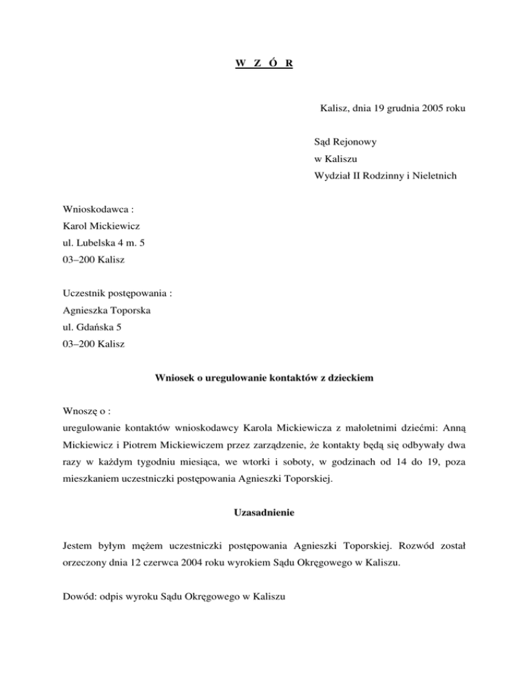 W Z Ó R Kalisz, dnia 19 grudnia 2005 roku Sąd Rejonowy w Kaliszu Wydział II Rodzinny i Nieletnich Wnioskodawca : Karol Mickiewicz ul. Lubelska 4 m. 5 03–200 Kalisz Uczestnik postępowania : Agnieszka Toporska ul. Gdańska 5 03–200 Kalisz Wniosek o uregulowanie kontaktów z dzieckiem Wnoszę o : uregulowanie kontaktów wnioskodawcy Karola Mickiewicza z małoletnimi dziećmi: Anną Mickiewicz i Piotrem Mickiewiczem przez zarządzenie, że kontakty będą się odbywały dwa razy w każdym tygodniu miesiąca, we wtorki i soboty, w godzinach od 14 do 19, poza mieszkaniem uczestniczki postępowania Agnieszki Toporskiej. Uzasadnienie Jestem byłym mężem uczestniczki postępowania Agnieszki Toporskiej. Rozwód został orzeczony dnia 12 czerwca 2004 roku wyrokiem Sądu Okręgowego w Kaliszu. Dowód: odpis wyroku Sądu Okręgowego w Kaliszu Z małżeństwa mamy dwójkę małoletnich dzieci 5-letnią Annę i 7-letniego Piotra. Mocą wyroku rozwodowego wykonywanie władzy rodzicielskiej zostało powierzone obojgu rodzicom z tym, że miejsce pobytu dzieci zostało wyznaczone przy uczestniczce postępowania Agnieszce Toporskiej. Zgodnie z postanowieniem sądu dzieci zamieszkują z matką. Dowód: skrócony odpis aktu urodzenia Anny Mickiewicz skrócony odpis aktu urodzenia Piotra Mickiewicza Była żona od dnia orzeczenia rozwodu utrudnia mi kontakty z dziećmi. Bardzo często, gdy umówię się na spotkanie z dziećmi, celowo wychodzi z domu zabierając je ze sobą lub też nie otwiera drzwi, udając, że nikogo nie ma w środku. Bardzo przeżywam rozłąkę z dziećmi i z rozmów z nimi wiem, iż one też. Boję się, że obecna sytuacja wpłynie niekorzystnie na moje relacje z dziećmi. Wobec powyżej wskazanych zachowań uczestniczki postępowania wniosek uważam za w pełni zasadny. Karol Mickiewicz Załączniki: 1. odpis wyroku Sądu Okręgowego w Kaliszu 2. skrócony odpis aktu urodzenia Anny Mickiewicz 3. skrócony odpis aktu urodzenia Piotra Mickiewicza 4. odpis wniosku i kserokopie załączników