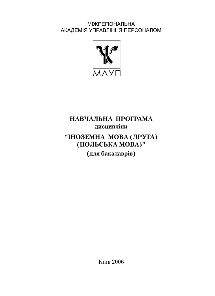 МІЖРЕГІОНАЛЬНА АКАДЕМІЯ УПРАВЛІННЯ ПЕРСОНАЛОМ НАВЧАЛЬНА ПРОГРАМА дисципліни “іноземна мова (друга) (польська мова)” (для бакалаврів) Київ 2006 Підготовлено викладачем кафедри української мови та літератури Л. А. Медведенко Затверджено на засіданні кафедри української мови та літератури (протокол № 9 від 30.06.06) Схвалено Вченою радою Міжрегіональної Академії управління персоналом Медведенко Л. А. Навчальна програма дисципліни “Іноземна мова (друга) (польська мова) (для бакалаврів). — К.: МАУП, 2006. — 30 с. Навчальна програма містить пояснювальну записку, тематичний план, зміст дисципліни “Іноземна мова — (друга) (польська мова)”, самостійну роботу, форму поточного та підсумкового контролю, вимоги до заліків та іспитів, питання для самоконтролю, варіанти контрольних робіт, а також список літератури. © Міжрегіональна Академія управління персоналом (МАУП), 2006 ПОЯСНЮВАЛЬНА ЗАПИСКА Дисципліна “Іноземна мова (друга) (польська мова)” як курс практики усного та писемного мовлення має на меті практичне засвоєння студентами польської мови як нормативної бази її функціонування у комунікативно-мовленнєвих ситуаціях у різних сферах професійної діяльності та побуту, формування лінгвокраїнознавчої компетенції. Практична та фахова мета курсу — формування у студентів умінь та навичок вільного володіння усіма видами мовленнєвої діяльності в межах програмної тематики. В основу курсу покладені принципи системності, комунікативної спрямованості навчання, порівняння мовних систем рідної та іноземної мов. Завдання вивчення дисципліни полягають у формуванні у студентів умінь та навичок аудіювання, усного та писемного монологічного та діалогічного мовлення відповідно до тематичного та граматичного мінімумів запропонованого курсу. Засвоєння структури мови відбувається в типових комунікативних контекстах і основних видах мовленнєвої діяльності (слуханні, говорінні, читанні, письмі). Слухання передбачає формування навичок і вмінь сприймання монологічного та діалогічного мовлення викладача, студентів і носія мови (в аудіозапису) та активізацію навичок сприйняття на слух лексичного матеріалу, текстів у подачі викладача і аудіозапису за тематикою курсу. Говоріння передбачає формування та розвиток навичок володіння розмовною мовою у монологічній і діалогічній формі за темами, перед баченими програмою курсу. Студенти повинні оволодіти лексичним матеріалом і використовувати його у розмові, враховуючи фонетичні і граматичні особливості польської мови. Компетенція усного мовлення на початковому рівні включає: підготовлене монологічне мовлення у формі опису та діалогічне мовлення у формі бесіди. Читання: розвиток навичок та умінь читання відбувається на базі вправ, текстів. Одночасно з навичками розуміння прочитаного розвиваються навички та вміння правильно вимовляти звуки як ізольовано, так і в мовленнєвому потоці. При читанні вголос студенти мають дотримуватися вимови, темпу та мелодики звучання, близьких до вимови та темпу носіїв мови. При самостійному читанні студенти повинні швидко сприймати та засвоювати інформацію, уміти відзначати основну думку, розділити текст на смислові частини, складати план. Письмо передбачає формування навичок правопису окремих лексичних одиниць, граматично оформлених речень та самостійних вис