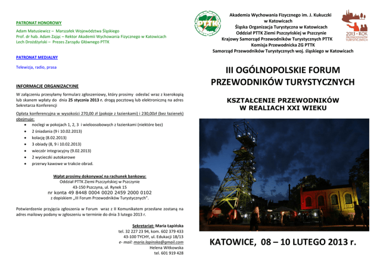 PATRONAT HONOROWY Adam Matusiewicz – Marszałek Województwa Śląskiego Prof. dr hab. Adam Zając – Rektor Akademii Wychowania Fizycznego w Katowicach Lech Drożdżyoski – Prezes Zarządu Głównego PTTK Akademia Wychowania Fizycznego im. J. Kukuczki w Katowicach Śląska Organizacja Turystyczna w Katowicach Oddział PTTK Ziemi Pszczyoskiej w Pszczynie Krajowy Samorząd Przewodników Turystycznych PTTK Komisja Przewodnicka ZG PTTK Samorząd Przewodników Turystycznych woj. śląskiego w Katowicach PATRONAT MEDIALNY Telewizja, radio, prasa III OGÓLNOPOLSKIE FORUM PRZEWODNIKÓW TURYSTYCZNYCH INFORMACJE ORGANIZACYJNE W załączeniu przesyłamy formularz zgłoszeniowy, który prosimy odesład wraz z kserokopią lub skanem wpłaty do dnia 25 stycznia 2013 r. drogą pocztową lub elektroniczną na adres Sekretarza Konferencji KSZTAŁCENIE PRZEWODNIKÓW W REALIACH XXI WIEKU Opłata konferencyjna w wysokości 270,00 zł (pokoje z łazienkami) i 230,00zł (bez łazienek) obejmuje: noclegi w pokojach 1, 2, 3 i wieloosobowych z łazienkami (niektóre bez) 2 śniadania (9 i 10.02.2013) kolację (8.02.2013) 3 obiady (8, 9 i 10.02.2013) wieczór integracyjny (9.02.2013) 2 wycieczki autokarowe przerwy kawowe w trakcie obrad. Wpłat prosimy dokonywad na rachunek bankowy: Oddział PTTK Ziemi Pszczyoskiej w Pszczynie 43-150 Pszczyna, ul. Rynek 15 nr konta 49 8448 0004 0020 2459 2000 0102 z dopiskiem „III Forum Przewodników Turystycznych”. Potwierdzenie przyjęcia zgłoszenia w Forum wraz z II Komunikatem przesłane zostaną na adres mailowy podany w zgłoszeniu w terminie do dnia 3 lutego 2013 r. Sekretariat: Maria Łapioska tel. 32 227 23 94, kom. 602 379 433 43-100 TYCHY, ul. Edukacji 18/13 e- mail: [email protected] Helena Witkowska tel. 601 919 428 KATOWICE, 08 – 10 LUTEGO 2013 r. MIEJSCE OBRAD Aula Główna Akademii Wychowania Fizycznego w Katowicach im. Jerzego Kukuczki, ul. Mikołowska 72a. CEL KONFERENCJI III Ogólnopolskie Forum Przewodników Turystycznych to spotkanie branżowe mające na celu: dyskusję na tematy dotyczące głównych problemów współczesnego przewodnictwa turystycznego w Polsce, głównie kształcenia współczesnych przewodników, zacieśnienie współpracy pomiędzy organizacjami przewodnickimi w Polsce reprezentującymi różne środowiska i prawne formy organizacyjne, wzbogacenie warsztatu przewodnickiego szczególnie o zagadnienia związane z pracą przewodnika w obiektach postindustrialnych. Organizatorzy mają nadzieję, iż spotkanie stanie się dobrą tradycją cyklicznych spotkao środowiska przewodnickiego w kolejnych regionach kraju. PROGRAM 08.02.2013 r.(piątek) Rejestracja uczestników – Recepcja Forum 10.00 – 12.30 Wycieczki po obiektach AWF w Katowicach: – trasa dłuższa 11.00 – 12.30 – trasa krótsza 11.30 – 12.30 Obiad 12.30 – 13.30 Uroczyste otwarcie III Forum Przewodników Turystycznych 13.30 – 14.15 14.15 – 19.00 14.15 – 15.05 15.05 – 15.55 15.55 – 16.45 16.45 – 17.15 17.15 – 18.05 18.05 – 18.55 18.55 – 19.30 19.30 – 20.10 20.10 – 20.40 Powitanie gości, prezentacja celów konferencji, wystąpienia okolicznościowe zaproszonych Gości I Sesja Plenarna* Nowe zmiany w prawie turystycznym i ich skutki dla przyszłośd polskiego przewodnictwa turystycznego – dr Piotr Cybula, AWF Kraków Nowoczesne metody oprowadzania w pracy przewodnika turystycznego – dr Armin Mikos von Rohrscheidt, GWSHM „Millenium” Gniezno, Redaktor Naczelny „Turystyki Kulturowej” Przewodnictwo turystyczne w Parkach Narodowych na przykładzie Ojcowskiego PN – mgr Janusz Glanowski, Ojcowski PN Ojców Przerwa kawowa Zadania przewodnika turystycznego związane z imprezami turystyki aktywnej – prof. nadzw. dr hab. Rajmund Tomik, AWF Katowice Organizacja kursów przewodnickich w świetle ostatnich zmian prawnych – mgr inż. Stanisław Kawęcki, KSPT Warszawa * po każdym wystąpieniu przewiduje się 15 minutową dyskusję Przejazd do hotelu „Skaut” w Chorzowie Kolacja Zakwaterowanie w pokojach hotelowych 09.02.2013 r. (sobota) 7.30 – 8.15 8.15 – 8.45 9.00 – 13.15 9.00 – 9.50 9.50 – 10.40 10.40 – 11.30 11.30 – 12.00 12.00 – 12.50 12.50 – 13.40 13.45 – 14.30 14.30 – 16.00 16.00 – 19.30 20.00 Śniadanie Przejazd do miejsca obrad II Sesja Plenarna* Obiekty sakralne jako szczególne miejsce pracy przewodnika – ks. Piotr Wenzel, Archidiecezja Katowicka Historyczne formy przewodnictwa w XIX wieku – prof. nadzw. dr hab. Janusz Ślusarczyk Rola przewodnika turystycznego w promocji i rozwoju produktu turystycznego – dr Piotr Halemba, AWF Katowice Przerwa kawowa Przygoda jako składnik produktu turystycznego – dr Wacław Sonelski, AWF Katowice Rola usług przewodnickich w funkcjonowaniu sieciowego produktu turystycznego. Studium przypadku „Szlaku Zabytków Techniki Województwa Śląskiego” – dr Adam Hajduga, Urząd Marszałkowski Woj. Śląskiego * po każdym wystąpieniu przewiduje się 15 minutową dyskusję Obiad Panele dyskusyjne Panel A - Deregulacja zawodów przewodnickich Panel B - Metodyka oprowadzania - nowoczesne metody i środki w pracy przewodnika Wycieczki metodyczne: A. Kopalnia zabytkowa „Guido” w Zabrzu, B. Browar Książęcy w Tychach Uroczysta kolacja 10.02.2013 r. (niedziela) 7.30 – 8.30 9.00 – 12.00 12.00 – 12.30 12.30 – 13.30 13.30 – 14.30 Śniadanie Wycieczka krajoznawczo-metodyczna do Katowic-Nikiszowca Przerwa kawowa Prezentacja wniosków z dyskusji Podsumowanie i zakooczenie III Forum Przewodników Turystycznych Obiad RECEPCJA KONFERENCJI Recepcja Forum – Hol przed Aulą Główną AWF w Katowicach, ul. Mikołowska 72a Recepcja hotelowa – Hol przed recepcją Hotelu „Skaut”, Chorzów, Al. Harcerska 3 UWAGA Istnieje możliwośd zamówienia (za dopłatą 55,00 PLN lub 37,00 PLN) dodatkowego noclegu z 9 na 10 lutego oraz z 12 na 13 lutego. Fakt ten należy zadeklarowad w „Karcie uczestnictwa”