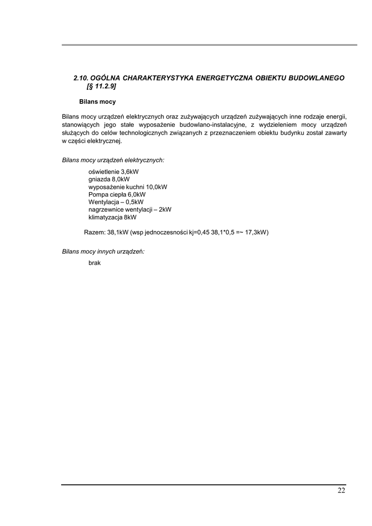 2.10. OGÓLNA CHARAKTERYSTYKA ENERGETYCZNA OBIEKTU BUDOWLANEGO [§ 11.2.9] Bilans mocy Bilans mocy urządzeń elektrycznych oraz zużywających urządzeń zużywających inne rodzaje energii, stanowiących jego stałe wyposażenie budowlano-instalacyjne, z wydzieleniem mocy urządzeń służących do celów technologicznych związanych z przeznaczeniem obiektu budynku został zawarty w części elektrycznej. Bilans mocy urządzeń elektrycznych: oświetlenie 3,6kW gniazda 8,0kW wyposażenie kuchni 10,0kW Pompa ciepła 6,0kW Wentylacja – 0,5kW nagrzewnice wentylacji – 2kW klimatyzacja 8kW Razem: 38,1kW (wsp jednoczesności kj=0,45 38,1*0,5 =~ 17,3kW) Bilans mocy innych urządzeń: brak 22 Właściwości cieplne przegród zewnętrznych W stosunku do przypadku budynku wyposażonego w instalacje grzewcze ogrzewcze, wentylacyjne, klimatyzacyjne lub chłodnicze - właściwości cieplne przegród zewnętrznych, w tym ścian pełnych oraz drzwi, a także przegród przezroczystych i innych wg poniższych tabeli: Obliczenia właściwości cieplne przegród zewnętrznych, SZ 1, SD 1, SZ 2 Zestawienie parametrów przegród zewnętrznych: Ozn. Opis SZ 1 Ściana zewnętrzna SZ 2 Ściana zewnętrzna SD 1 Dach - stropodach ST 1 Podłoga na gruncie 2 Uk [W/m K] 0,148 0,153 0,090 0,188 2 Umax [W/m K] 0,30 0,30 0,25 Parametry sprawności energetycznej Parametry sprawności energetycznej instalacji grzewczej i ogrzewczych, wentylacyjnych, klimatyzacyjnych lub chłodniczych oraz innych urządzeń mających wpływ na gospodarkę cieplną energetyczną obiektu budowlanego, w tym wentylacyjnych i klimatyzacyjnych. Sprawność urządzeń instalacji grzewczej: Pompa ciepła – COP 3,5 Ogrzewanie podłogowe - regulacji i wykorzystanie ciepła 96% Ogrzewanie podłogowe - dystrybucja ciepła 95% Bufor ciepła - regulacji i wykorzystanie ciepła 95% Kominek z płaszczem wodnym – sprawność 75% Instalacja solarna – sprawność 51% Zasobnik c.u.w. – 86% Przesył i dystrybucja c.u.w. – sprawność 80% instalacja grzewcza do przesyłania ciepła izolowana cieplnie – sprawność 87% wymiennik ciepła centrali wentylacyjnej 1 i 2 – sprawność 80% Przewody instalacji grzewczych należy izolować zgodnie z wymaganiami zawartymi w tabeli p.2.11.6 23 Założone parametry klimatu wewnętrznego: Zakładane parametry klimatu wewnętrznego określono w części rysunkowej. W zakresie temperatury w pomieszczeniach, przestrzegać wymagań PN-82/B-02402 Temperatury ogrzewanych pomieszczeń w budynkach. W zakresie krotności wymiany powietrza przestrzegać wymagań PN-83/B-03430 Wentylacja w budynkach mieszkalnych, zamieszkania zbiorowego i użyteczności publicznej. Spełnienie wymagań w zakresie oszczędności energii Dane wykazujące, że przyjęte w projekcie architektoniczno – budowlanym rozwiązania budowlane i instalacyjne spełniają wymagania dotyczące oszczędności energii zawarte w przepisach technicznobudowlanych: Przegrody zewnętrzne budynku oraz technika instalacyjna odpowiadają wymaganiom izolacyjności cieplnej. Powierzchnia okien spełnia wymagania warunków technicznych dla budynków mieszkalnych i budynków użyteczności publicznej pole powierzchni okien oraz przegród szklanych i przezroczystych, o współczynniku przenikania ciepła nie mniejszym niż 1,5W/m2K (Wszystkie okna o U<1,5W/m2K) Zgodnie z wyliczeniami zawartymi załączniku wartość wskaźnika EP [kWh/(m2rok)] jest mniejsza od wartości granicznej: EP= 59,07 kWh/(m2rok) < EPlim= 138,76 kWh/(m2rok). W świetle powyższego zgodnie z §328 budynek i jego instalacje zaprojektowany i wykonany jest w taki sposób aby ilość ciepła, chłodu i energii elektrycznej można utrzymać na racjonalnym poziomie, oraz aby ograniczyć ryzyko przegrzewania się budynku w okresie letnim. W związku z uzyskaniem wartości wskaźnika EP<60 kWh/(m2rok) budynek można określić jako energooszczędny. Zgodnie z wymaganiami programu priorytetowego Narodowego Funduszu Ochrony Środowiska i Gospodarki Wodnej „Efektywne wykorzystanie energii - Dopłaty do kredytów na budowę domów energooszczędnych” wartość wskaźnika EP powinna można obniżyć do uzyskania wartości wymaganych przez program: standard NF40 – EU=38,97kWh/(m2rok) < 40 kWh/(m2rok) - przy zastosowaniu kominka z płaszczem wodnym jako wspomagającego instalacje centralnego ogrzewania oraz przy zastosowaniu solarów słonecznych jako wspomagających dla przygotowania c.u.w. standard NF15 – EU=14,54kWh/(m2rok)<15 kWh/(m2*rok) – przy zastosowaniu ogniw fotowoltaicznych. Obliczenia szczegółowe dla poszczególnych konfiguracji zawarte są w załączniku. 2.11. Wyposażenie techniczno – budowlane Projektuje się wyposażenie obiektu w następujące instalacje: Instalacja wodociągowa Instalacja kanalizacji sanitarnej i odprowadzenia skroplin Instalacja elektryczna, oświetleniowa i odgromowa Instalacje teletechniczne Instalacja wentylacji mechanicznej i klimatyzacji Wszystkie instalacje stanowią temat odrębnego opracowania. 24