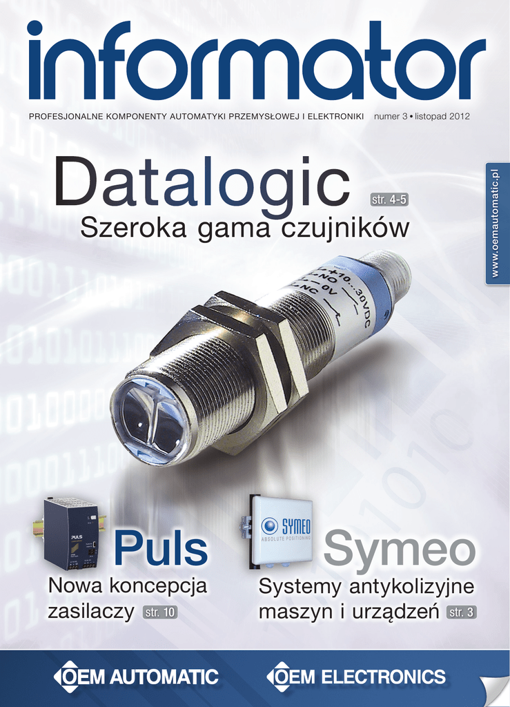 numer 3 • listopad 2012 Datalogic Szeroka gama czujników str. 4-5 Puls Nowa koncepcja zasilaczy str. 10 Symeo Systemy antykolizyjne maszyn i urządzeń str. 3 www.oemautomatic.pl PROFESJONALNE KOMPONENTY AUTOMATYKI PRZEMYSŁOWEJ I ELEKTRONIKI Słowo wstępu… Mariusz Matejczyk W numerze Managing Director, OEM Automatic Sp. z o.o. Oddając do Państwa dyspozycji jesienne wydanie Informatora, chciałbym zwrócić szczególną uwagę na będące nowością w naszej ofercie produkty włoskiej firmy Datalogic. Producent ten oferuje czujniki fotoelektryczne, indukcyjne i wizyjne, bariery i kurtyny świetlne oraz skanery laserowe. Mając do dyspozycji tak szeroką gamę produktów, mamy szansę stać się jednym z wiodących dostawców na rynku i jest to cel, który stawiamy sobie w perspektywie najbliższych trzech lat. Uważam, że wprowadzenie tej oferty będzie dla naszej firmy wydarzeniem przełomowym, jeśli wziąć pod uwagę intensywność planowanych nakładów marketingowych. W chwili obecnej dostępny jest już katalog Datalogic na naszej stronie internetowej www.oeamautomatic.pl, a jego wersja papierowa ukaże się w listopadzie. Zapraszamy do zapoznania się z tą ofertą. Znakomitym uzupełnieniem we wszystkich aplikacjach, gdzie niezbędna jest detekcja obiektów, są prezentowane w Informatorze nowe produkty z rodziny czujników laserowych Dimetix oraz będące od niedawna w sprzedaży czujniki radarowe Symeo. Takie nagromadzenie różnych technologii sensorycznych jest wyrazem priorytetowego traktowania tego obszaru automatyki przemysłowej przez naszą firmę. Chcemy być postrzegani jako eksperci w tej dzidzinie i zrobimy wszystko, aby to osiągnąć. Ponadto chciałbym zwrócić uwagę na 50-lecie działalności, które obchodzi w tym roku firma Releco – producent przekaźników z klasy premium. Cieszę się, że wyroby tej firmy zyskują coraz większe uznanie na rynku polskim. Mimo wysokiej ceny produkty te znajdują nabywców doceniających ich walory w wymagających aplikacjach przemysłowych. Mierzony dystans LPR-1DXi SYMEO, strona 3 Fotokomórki cylindryczne M18 DATALOGIC, strona 5 LPR-1DXi Systemy antykolizyjne maszyn i urządzeń Fakty • Dokładność: ±0,5 m (opcja: do ±0,5 cm) • Zakres pomiarowy: 120 m (opcja: 500 m) Nowe pulpity sterowania oburęcznego STAR AUTOMATION, strona 6 • Częstotliwości: 5,8 GHz, ISM band • Wyjścia przekaźnikowe: styki bezpotencjałowe do kontroli dystansu • Bezkontaktowy pomiar w technologii radiowej Zapraszam do lektury nowego Informatora. • Odporny na trudne warunki atmosferyczne, wibracje, zanieczyszczenia • Łatwy w montażu i konfiguracji • System bezobsługowy Mariusz Matejczyk, Managing Director Nowa koncepcja zasilaczy PULS, strona 10 Czujnik radiowy LPR-1DXi, mierzący odległość między dwoma urządzeniami za pomocą fal radiowych, może być użyty do automatyzacji procesów przemysłowych lub w systemach antykolizyjnych. Opcjonalnie czujniki radiowe mogą dokonywać pomiaru względnej prędkości między dwiema jednostkami. Wszystkie komponenty są zintegrowane w jednej obudowie. Czujnik wyposażony jest w siedem przekaźników, które umożliwiają skonfigurowanie dwóch progów: ostrzegania i stopu oraz sygnalizują zasilanie i błąd systemu lub poprawny pomiar. Programowanie odbywa się poprzez darmowe oprogramowanie dołączone do czujników. Odczyt odległości oraz przekaźniki są dostępne w każdej z dwóch sparowanych jednostek systemu, które są łatwe w montażu i nie wymagają obsługi nawet w trudnych warunkach. Pył, mgła oraz inne warunki atmosferyczne nie wpływają na działanie systemu. Czujnik LPR-1DXi Redakcja OEM Automatic wydawca OEM Automatic Sp. z o.o. manager Mariusz Matejczyk redakcja Aleksandra Klimek l nakład 3500 egz. siedziba ul. Postępu 2, 02-676 Warszawa tel. (+48 22) 863 27 22 l fax (+48 22) 863 27 24 internet www.oemautomatic.pl l [email protected] Firma Symeo to niemiecki producent nowoczesnych czujników i systemów opartych na technologii radiowej do zastosowań przemysłowych. Systemy radiowe firmy Symeo są przeznaczone do pomiaru odległości oraz pozycji obiektów takich jak suwnice, wózki, żurawie, koparki, zwałowarki itp. EDS – pomiar poziomów w silosach DIMETIX, strona 15 Rys. Przykładowa aplikacja. System antykolizyjny pomiędzy mostami suwnicy wyposażony w czujniki radiowe LPR-1DXi Szczegółowe informacje: Mariusz Szabłowski tel. +48 22 863 27 22 e-mail: [email protected] 2 O E M I N F O R M AT O R 2 0 1 2 - 3 W W W. O E M A U T O M AT I C . P L O E M I N F O R M E R A R 2 0 1 2 - 3 W W W. O E M A U T O M AT I C . P L 3 Szeroka gama czujników t e raz w o f e r c ie OEM A u t o m a Fotokomórki cylindryczne M18 Jakość w atrakcyjnej cenie! Datalogic jest największym producentem czujników cylindrycznych na rynku europejskim. Sukces ten został osiągnięty dzięki niezawodności rozwiązań, szerokiemu portfolio oferowanych wersji, atrakcyjnym cenom i szybkim dostawom produktów. Fakty • Napięcie zasilania 10–30 V DC • W obudowie z tworzywa, niklowanego mosiądzu, stali nierdzewnej AIS316L tic! • Długość obudowy 40 mm lub 67 mm • Stopień ochrony IP67, IP68 lub IP69K • Dostępne w wersji „patrzącej z boku” • Wyjście tranzystorowe PNP, NPN • Potencjometr umożliwiający regulację czułości OEM Automatic uzyskał niedawno tytuł autoryzowanego dystrybutora produktów Datalogic Automation. Firma Datalogic Automation jest producentem szerokiej gamy czujników, począwszy od czujników indukcyjnych, poprzez uniwersalne fotokomóki, kurtyny, aż do zaawansowanych fotokomórek do specjalnych aplikacji i czujników wizyjnych. Produkty te są rozwijane i dostarczane do Klientów na całym świecie od ponad czterdziestu lat. Dzięki wieloletniemu doświadczeniu firmy produkty Datalogic Automation charakteryzują się najwyższą jakością i innowacyjnością rozwiązań. Nawiązanie współpracy z Datalogic pozwoli 