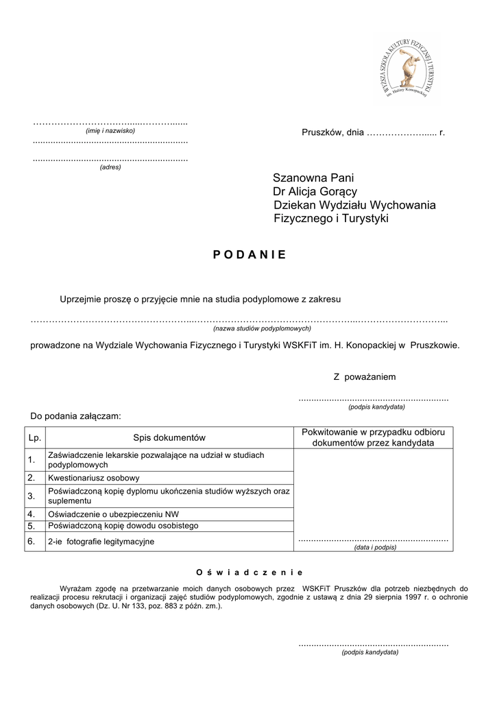 ……………………….…......………....... (imię i nazwisko) Pruszków, dnia ………………...... r. ............................................................. ............................................................. (adres) Szanowna Pani Dr Alicja Gorący Dziekan Wydziału Wychowania Fizycznego i Turystyki PODANIE Uprzejmie proszę o przyjęcie mnie na studia podyplomowe z zakresu ……………………………………………...……………………………………………...………………………... (nazwa studiów podyplomowych) prowadzone na Wydziale Wychowania Fizycznego i Turystyki WSKFiT im. H. Konopackiej w Pruszkowie. Z poważaniem ........................................................... (podpis kandydata) Do podania załączam: Lp. Spis dokumentów 1. Zaświadczenie lekarskie pozwalające na udział w studiach podyplomowych 2. Kwestionariusz osobowy 3. Poświadczoną kopię dyplomu ukończenia studiów wyższych oraz suplementu 4. 5. Oświadczenie o ubezpieczeniu NW Poświadczoną kopię dowodu osobistego 6. 2-ie fotografie legitymacyjne Pokwitowanie w przypadku odbioru dokumentów przez kandydata ........................................................... (data i podpis) O ś w i a d c z e n i e Wyrażam zgodę na przetwarzanie moich danych osobowych przez WSKFiT Pruszków dla potrzeb niezbędnych do realizacji procesu rekrutacji i organizacji zajęć studiów podyplomowych, zgodnie z ustawą z dnia 29 sierpnia 1997 r. o ochronie danych osobowych (Dz. U. Nr 133, poz. 883 z późn. zm.). ........................................................... (podpis kandydata)