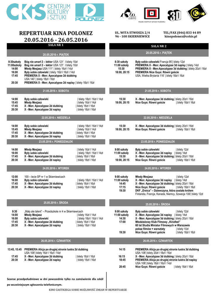 REPERTUAR KINA POLONEZ 20.05.2016 - 26.05.2016 UL. WITA STWOSZA 2/4 96 - 100 SKIERNIEWICE SALA NR 1 SALA NR 2 20.05.2016 r. PIĄTEK 20.05.2016 r. PIĄTEK 8:30szkoły 11:00szkoły 14:00 16:00 17:45 20:30 Bóg nie umarł 2 – lektor USA 121’ I bilety 10zł Bóg nie umarł 2 – lektor USA 121’ I bilety 10zł Młody Mesjasz USA 111’ | bilety 16zł I 14zł Były sobie człowieki | bilety 18zł I 16zł I 14zł PREMIERA X - Men: Apocalypse 2d dubbing USA 140’ | bilety 18zł I 16zł PREMIERA X - Men: Apocalypse 2d napisy | bilety 18zł I 16zł 8:30 szkoły 11:00 szkoły 15:30 18:00, 20:15 21.05.2016 r. SOBOTA 14:00 15:45 17:45 20:30 Były sobie człowieki Młody Mesjasz X - Men: Apocalypse 2d dubbing X - Men: Apocalypse 2d napisy Były sobie człowieki Młody Mesjasz X - Men: Apocalypse 2d dubbing X - Men: Apocalypse 2d napisy | bilety 18zł I 16zł I 14zł | bilety 16zł I 14zł | bilety 18zł I 16zł | bilety 18zł I 16zł 15:30 18:00, 20:15 Młody Mesjasz Były sobie człowieki X - Men: Apocalypse 2d dubbing X - Men: Apocalypse 2d napisy | bilety 18zł I 16zł I 14zł | bilety 16zł I 14zł | bilety 18zł I 16zł | bilety 18zł I 16zł 15:30 18:00, 20:15 100 – lecie SP nr 1 w Skierniewicach Były sobie człowieki X - Men: Apocalypse 2d dubbing X - Men: Apocalypse 2d napisy | bilety 16zł I 14zł | bilety 18zł I 16zł I 14zł | bilety 18zł I 16zł | bilety 18zł I 16zł 9:00 szkoły 11:00 szkoły 15:30 18:00, 20:15 Były sobie człowieki | bilety 12zł X - Men: Apocalypse 3d napisy | bilety 14zł X - Men: Apocalypse 3d dubbing | bilety 20zł I 18zł Nice Guys: Równi goście | bilety 18zł I 16zł 24.05.2016 r. WTOREK | bilety 18zł I 16zł I 14zł | bilety 18zł I 16zł | bilety 18zł I 16zł 9:00 szkoły 11:00 szkoły 14:45 17:15 19:30 25.05.2016 r. ŚRODA 9:30 14:00 16:00 17:45 20:30 X - Men: Apocalypse 3d dubbing | bilety 20zł I 18zł Nice Guys: Równi goście | bilety 18zł I 16zł 23.05.2016 r. PONIEDZIAŁEK 24.05.2016 r. WTOREK 12:00 16:00 17:45 20:30 X - Men: Apocalypse 3d dubbing | bilety 20zł I 18zł Nice Guys: Równi goście | bilety 18zł I 16zł 22.05.2016 r. NIEDZIELA 23.05.2016 r. PONIEDZIAŁEK 14:00 16:00 17:45 20:30 Były sobie człowieki Francja 95’| bilety 12zł PREMIERA X - Men: Apocalypse 3d napisy | bilety 14zł PREMIERA X - Men:Apocalypse 3d dubbing | bilety 20zł I 18zł PREMIERA Nice Guys: Równi goście USA, Wielka Brytania 116’ | bilety 18zł I 16zł 21.05.2016 r. SOBOTA 22.05.2016 r. NIEDZIELA 14:00 15:45 17:45 20:30 TEL/FAX (046) 833 44 89 [email protected] „Mały ale talent” – Przedszkole nr 4 w Skierniewicach Młody Mesjasz | bilety 16zł I 14zł Były sobie człowieki | bilety 18zł I 16zł I 14zł X - Men: Apocalypse 2d dubbing | bilety 18zł I 16zł X - Men: Apocalypse 2d napisy | bilety 18zł I 16zł 25.05.2016 r. ŚRODA 9:00 szkoły 11:00 szkoły 14:30 17:00 19:30 26.05.2016 r. CZWARTEK 13:45, 15:45 PREMIERA Alicja po drugiej stronie lustra 2d dubbing USA 108’| bilety 18zł I 16zł I 14zł 17:45 X - Men: Apocalypse 2d dubbing | bilety 18zł I 16zł 20:30 X - Men: Apocalypse 2d napisy | bilety 18zł I 16zł Młody Mesjasz | bilety 12zł X - Men: Apocalypse 3d napisy | bilety 14zł X - Men: Apocalypse 3d dubbing | bilety 20zł I 18zł Nice Guys: Równi goście | bilety 18zł I 16zł DKF „Eroica” – Dziewczyna, która została królem Finlandia, Francja, Kanada, Niemcy, Szwecja 106’| bilety 12zł Były sobie człowieki | bilety 12zł X - Men: Apocalypse 3d napisy | bilety 14zł X - Men: Apocalypse 3d dubbing | bilety 20zł I 18zł Młodzieżowy Klub Filmowy „Kinofeel” 60 lat Studia Miniatur Filmowych w Warszawie pokaz filmów + warsztaty | bilety 10zł Nice Guys: Równi goście | bilety 18zł I 16zł 26.05.2016 r. CZWARTEK 14:15 16:15 18:45 20:45 Seanse przedpołudniowe w dni powszednie tylko na zamówienie dla szkół po wcześniejszym zgłoszeniu telefonicznym. KINO ZASTRZEGA SOBIE MOŻLIWOŚĆ ZMIAN W REPERTUARZE PREMIERA Alicja po drugiej stronie lustra 3d dubbing USA 108’| bilety 20zł I 18zł I 16zł X - Men: Apocalypse 3d dubbing | bilety 20zł I 18zł PREMIERA Alicja po drugiej stronie lustra 2d napisy USA 108’| bilety 18zł I 16zł I 14zł Nice Guys: Równi goście | bilety 18zł I 16zł