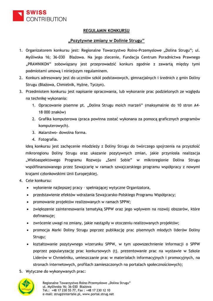 REGULAMIN KONKURSU „Pozytywne zmiany w Dolinie Strugu” 1. Organizatorem konkursu jest: Regionalne Towarzystwo Rolno-Przemysłowe „Dolina Strugu”; ul. Myśliwska 16; 36-030 Błażowa. Na jego zlecenie, Fundacja Centrum Poradnictwa Prawnego „PRAWNIKON” zobowiązany jest przeprowadzić konkurs zgodnie z zawartą między tymi podmiotami umową i niniejszym regulaminem. 2. Konkurs adresowany jest do uczniów szkół podstawowych, gimnazjalnych i średnich z gmin Doliny Strugu (Błażowa, Chmielnik, Hyżne, Tyczyn). 3. Przedmiotem konkursu jest napisanie opracowania, lub wykonanie prac podzielonych ze względu na technikę wykonania: 1. Opracowanie pisemne pt. „Dolina Strugu moich marzeń” (maksymalnie do 10 stron A418 000 znaków) 2. Grafika komputerowa (praca powinna zostać wykonana za pomocą graficznych programów komputerowych). 3. Malarstwo- dowolna forma. 4. Fotografia. Ideą konkursu jest zachęcenie młodzieży z Doliny Strugu do twórczego spojrzenia na przyszłość mikroregionu Doliny Strugu oraz ukazanie pozytywnych zmian, jakie przyniosła realizacja „Wieloaspektowego Programu Rozwoju „Sami Sobie” w mikroregionie Dolina Strugu współfinansowanego przez Szwajcarię w ramach szwajcarskiego programu współpracy z nowymi krajami członkowskimi Unii Europejskiej. 4. Cele konkursu: wyłonienie najlepszej pracy – spełniającej wytyczne Organizatora, przedstawienie efektów wdrażania Szwajcarsko-Polskiego Programu Współpracy; promowanie projektów realizowanych w ramach SPPW; zwiększenie zainteresowania tematyką SPPW oraz jego wpływem na rozwój obszarów, które dofinansuje; zwrócenie uwagi na zmiany, jakie nastąpiły w otoczeniu realizowanych projektów; promocja Marki Doliny Strugu poprzez publikację prac pisemnych młodych liderów Doliny Strugu; kształtowanie pozytywnego wizerunku SPPW, w tym upowszechnienie informacji o SPPW poprzez popularyzację prac konkursowych (tj. prezentowanie prac na wystawie w Szkole Liderów w Chmielniku, umieszczanie prac w materiałach informacyjnych i promocyjnych, na stronach internetowych, profilach zamieszczonych na portalach społecznościowych); 5. Wytyczne do wykonywanych prac: DOLINA S TR UGU Regionalne Towarzystwo Rolno-Przemysłowe „Dolina Strugu” ul. Myśliwska 16; 36-030 Błażowa Tel.: +48 17 230 55 77, Fax : +48 17 230 12 10 e-mail: [email protected], www.portal.strug.net Praca powinna przedstawiać przedsięwzięcia realizowane przez RTRP Dolinę Strugu w ramach projektu „Sami Sobie”, rozbudzać poczucie lokalnej tożsamości i wspólnego celu jakim jest społeczny i gospodarczy rozwój mikroregionu „Dolina Strugu” czyli obszaru obejmującego 4 gminy (Błażowa, Chmielnik, Hyżne i Tyczyn), Prace powinny odzwierciedlać cechy charakterystyczne dla tego mikroregionu, czym ten mikroregion wyróżnia się w porównaniu do innych podobnych mikroregionów z najbliższego i dalszego otoczenia, Organizator dopuszcza wykonanie prac dotyczących działań „miękkich” takich jak: szkolenia, wydarzenia promocyjne, doradztwo, certyfikację i inne, ale także inwestycje infrastrukturalne: projekty realizowane w ramach naborów na piekarnie, przetwórnie owocowo-warzywne, pszczelarstwo oraz turystykę, budowę Szkoły Liderów, magazynuprzechowalni a także Inter-Kluby. Opracowanie może bazować na zmianach w regionie realizowanych przy pomocy programu szwajcarskiego 6. W ramach konkursu dany uczeń może złożyć tylko jedną pracę. 7. Opiekunowie odpowiedzialni za przeprowadzenie konkursu w szkołach, przekażą organizatorom wykonane prace, najpóźniej do dnia 17 października 2016 r. na adres: Biuro Projektu w Tyczynie, ul. Kościuszki 8, 36-020 Tyczyn. 8. Kolejnym etapem będzie ocena prac przez kapitułę, w skład której wejdą: a) Profesjonalny fotograf b) Grafik komputerowy c) Malarz/artysta d) Polonista Członkowie kapituły oceniać będą prace w swoich kategoriach. Każdy z członków kapituły wyselekcjonuje najlepsze 3 prace dla poszczególnych kategorii wiekowych (szkoły podstawowe, gimnazja i szkoły średnie). 9. Organizator przewiduje przyznanie nagród dla zwycięzców (I, II oraz III miejsce) w danej kategorii wiekowej. 10. Kapituła przekaże organizatorowi wybrane prace. Następnie skontaktuje się z laureatami odnośnie terminu odbioru nagród. Oficjalne przyznanie nagród odbędzie się podczas konferencji podsumowującej projekt „Sami Sobie”. 11. Najlepsze prace zostaną zaprezentowane uczestnikom konferencji na specjalnie przygotowanej ekspozycji. 12. Wykonawcy prac (lub ich opiekunowie prawni) zobowiązani są wyrazić zgodę na umieszczanie ich prac na stronie internetowej Organizatora oraz powielanie ich, szczególnie w postaci elektronicznej i drukowanej. Zwycięskie prace zostaną umieszczone także w publikacji DOLINA S TR UGU Regionalne Towarzystwo Rolno-Przemysłowe „Dolina Strugu” ul. Myśliwska 16; 36-030 Błażowa Tel.: +48 17 230 55 77, Fax : +48 17 230 12 10 e-mail: [email protected], www.portal.strug.net stanowiącej podsumowanie realizacji projektu „Sami Sobie” wykonywanej na zlecenie Organizatora. 13. W załączniku nr 3 należy umieścić informację dotyczącą autora pracy: imię, nazwisko, klasa oraz nazwa Szkoły. Do zgłoszenia stanowiącego załącznik nr 3 uczestnik dołącza: Pracę w formie papierowej lub elektronicznej, oświadczenia podpisane przez rodzica lub opiekuna prawnego stanowiące załącznik nr 1 i 2 do regulaminu . 14. W ramach konkursu dany uczeń może złożyć tylko jedną pracę. 15. Pracę należy dostarczyć osobiście bądź wysłać pocztą na adres: Regionalne Towarzystwo RolnoPrzemysłowe „Dolina Strugu” ul. Kościuszki 8, 36-020 Tyczyn do dnia 17 października 2016 r. 16. Spośród nadesłanych projektów powołana przez organizatora kapituła wybierze 9 (po 3 z każdej kategorii wiekowej). Autorzy najlepszych prac otrzymają atrakcyjne nagrody rzeczowe. Uwagi końcowe: Organizatorzy zastrzegają sobi