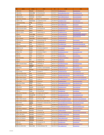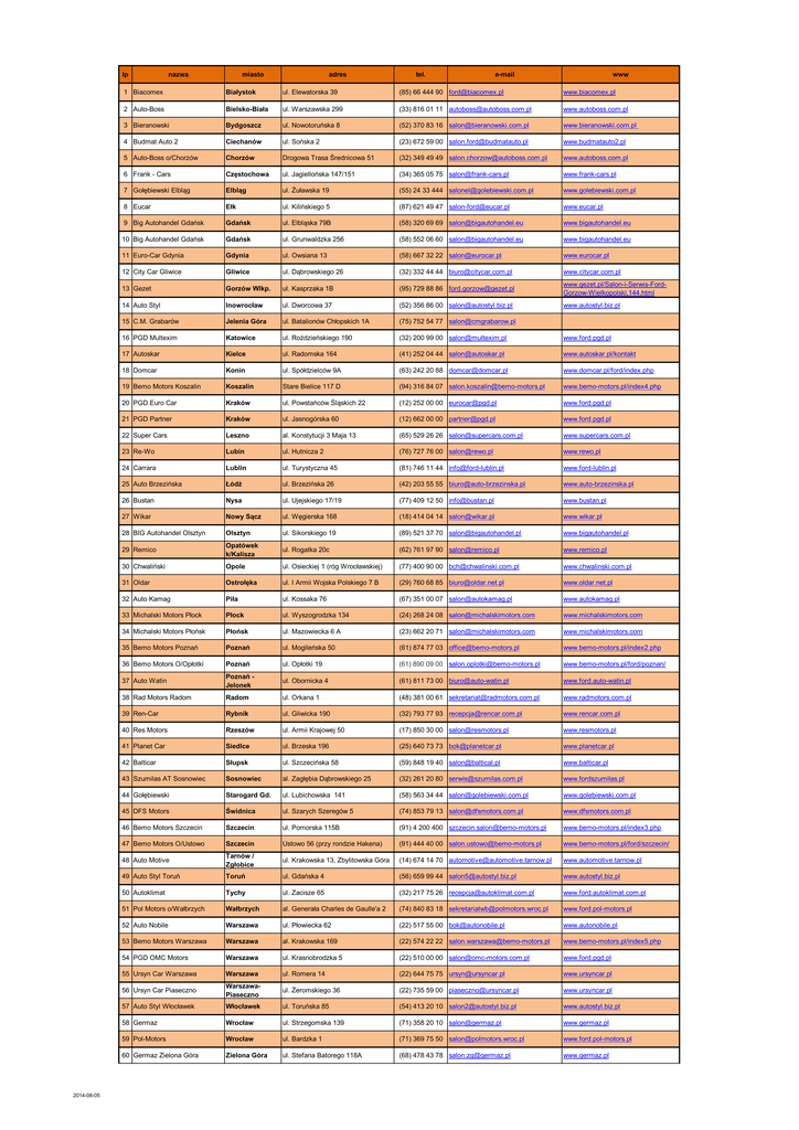 lp 2014-08-05 nazwa miasto adres tel. e-mail www 1 Biacomex Białystok ul. Elewatorska 39 (85) 66 444 90 [email protected] www.biacomex.pl 2 Auto-Boss Bielsko-Biała ul. Warszawska 299 (33) 816 01 11 [email protected] www.autoboss.com.pl 3 Bieranowski Bydgoszcz ul. Nowotoruńska 8 (52) 370 83 16 [email protected] www.bieranowski.com.pl 4 Budmat Auto 2 Ciechanów ul. Sońska 2 (23) 672 59 00 [email protected] www.budmatauto2.pl 5 Auto-Boss o/Chorzów Chorzów Drogowa Trasa Średnicowa 51 (32) 349 49 49 [email protected] www.autoboss.com.pl 6 Frank - Cars Częstochowa ul. Jagiellońska 147/151 (34) 365 05 75 [email protected] www.frank-cars.pl 7 Gołębiewski Elbląg Elbląg ul. Żuławska 19 (55) 24 33 444 [email protected] www.golebiewski.com.pl 8 Eucar Ełk ul. Kilińskiego 5 (87) 621 49 47 [email protected] www.eucar.pl 9 Big Autohandel Gdańsk Gdańsk ul. Elbląska 79B (58) 320 69 69 [email protected] www.bigautohandel.eu 10 Big Autohandel Gdańsk Gdańsk ul. Grunwaldzka 256 (58) 552 06 60 [email protected] www.bigautohandel.eu 11 Euro-Car Gdynia Gdynia ul. Owsiana 13 (58) 667 32 22 [email protected] www.eurocar.pl 12 City Car Gliwice Gliwice ul. Dąbrowskiego 26 (32) 332 44 44 [email protected] www.citycar.com.pl 13 Gezet Gorzów Wlkp. ul. Kasprzaka 1B (95) 729 88 86 [email protected] www.gezet.pl/Salon-i-Serwis-FordGorzow-Wielkopolski,144.html 14 Auto Styl Inowrocław ul. Dworcowa 37 (52) 356 86 00 [email protected] www.autostyl.biz.pl 15 C.M. Grabarów Jelenia Góra ul. Batalionów Chłopskich 1A (75) 752 54 77 [email protected] 16 PGD Multexim Katowice ul. Roździeńskiego 190 (32) 200 99 00 [email protected] www.ford.pgd.pl 17 Autoskar Kielce ul. Radomska 164 (41) 252 04 44 [email protected] www.autoskar.pl/kontakt 18 Domcar Konin ul. Spółdzielców 9A (63) 242 20 88 [email protected] www.domcar.pl/ford/index.php 19 Bemo Motors Koszalin Koszalin Stare Bielice 117 D (94) 316 84 07 [email protected] www.bemo-motors.pl/index4.php 20 PGD Euro Car Kraków ul. Powstańców Śląskich 22 (12) 252 00 00 [email protected] www.ford.pgd.pl 21 PGD Partner Kraków ul. Jasnogórska 60 (12) 662 00 00 [email protected] www.ford.pgd.pl 22 Super Cars Leszno al. Konstytucji 3 Maja 13 (65) 529 26 26 [email protected] www.supercars.com.pl 23 Re-Wo Lubin ul. Hutnicza 2 (76) 727 76 00 [email protected] www.rewo.pl 24 Carrara Lublin ul. Turystyczna 45 (81) 746 11 44 [email protected] www.ford-lublin.pl 25 Auto Brzezińska Łódź ul. Brzezińska 26 (42) 203 55 55 [email protected] www.auto-brzezinska.pl 26 Bustan Nysa ul. Ujejskiego 17/19 (77) 409 12 50 [email protected] www.bustan.pl 27 Wikar Nowy Sącz ul. Węgierska 168 (18) 414 04 14 [email protected] www.wikar.pl 28 BIG Autohandel Olsztyn Olsztyn ul. Sikorskiego 19 (89) 521 37 70 [email protected] www.bigautohandel.pl 29 Remico Opatówek k/Kalisza ul. Rogatka 20c (62) 761 97 90 [email protected] www.remico.pl 30 Chwaliński Opole ul. Osieckiej 1 (róg Wrocławskiej) (77) 400 90 00 [email protected] www.chwalinski.com.pl 31 Oldar Ostrołęka ul. I Armii Wojska Polskiego 7 B (29) 760 68 85 [email protected] www.oldar.net.pl 32 Auto Kamag Piła ul. Kossaka 76 (67) 351 00 07 [email protected] www.autokamag.pl 33 Michalski Motors Płock Płock ul. Wyszogrodzka 134 (24) 268 24 08 [email protected] www.michalskimotors.com 34 Michalski Motors Płońsk Płońsk ul. Mazowiecka 6 A (23) 662 20 71 [email protected] www.michalskimotors.com 35 Bemo Motors Poznań Poznań ul. Mogileńska 50 (61) 874 77 03 [email protected] www.bemo-motors.pl/index2.php 36 Bemo Motors O/Opłotki Poznań ul. Opłotki 19 (61) 890 09 00 [email protected] www.bemo-motors.pl/ford/poznan/ 37 Auto Watin Poznań Jelonek ul. Obornicka 4 (61) 811 73 00 [email protected] www.ford.auto-watin.pl 38 Rad Motors Radom Radom ul. Orkana 1 (48) 381 00 61 [email protected] www.radmotors.com.pl 39 Ren-Car Rybnik ul. Gliwicka 190 (32) 793 77 93 [email protected] www.rencar.com.pl 40 Res Motors Rzeszów ul. Armii Krajowej 50 (17) 850 30 00 [email protected] www.resmotors.pl 41 Planet Car Siedlce ul. Brzeska 196 (25) 640 73 73 [email protected] www.planetcar.pl 42 Balticar Słupsk ul. Szczecińska 58 (59) 848 19 40 [email protected] www.balticar.pl 43 Szumilas AT Sosnowiec Sosnowiec al. Zagłębia Dąbrowskiego 25 (32) 261 20 80 [email protected] www.fordszumilas.pl 44 Gołębiewski Starogard Gd. ul. Lubichowska 141 (58) 563 34 44 [email protected] www.golebiewski.com.pl 45 DFS Motors Świdnica ul. Szarych Szeregów 5 (74) 853 79 13 [email protected] www.dfsmotors.com.pl 46 Bemo Motors Szczecin Szczecin ul. Pomorska 115B (91) 4 200 400 [email protected] www.bemo-motors.pl/index3.php 47 Bemo Motors O/Ustowo Szczecin Ustowo 56 (przy rondzie Hakena) (91) 444 40 00 [email protected] www.bemo-motors.pl/ford/szczecin/ 48 Auto Motive Tarnów / Zgłobice ul. Krakowska 13, Zbylitowska Góra (14) 674 14 70 [email protected] www.automotive.tarnow.pl 49 Auto Styl Toruń Toruń ul. Gdańska 4 (56) 659 99 44 [email protected] www.autostyl.biz.pl 50 Autoklimat Tychy ul. Zacisze 65 (32) 217 75 26 [email protected] www.ford.autoklimat.com.pl 51 Pol Motors o/Wałbrzych Wałbrzych al. Generała Charles de Gaulle'a 2 (74) 840 83 18 [email protected] www.ford.pol-motors.pl 52 Auto Nobile Warszawa ul. Płowiecka 62 (22) 517 55 00 [email protected] www.autonobile.pl 53 Bemo Motors Warszawa Warszawa al. Krakowska 169 (22) 574 22 22 [email protected] www.bemo-motors.pl/index5.php 54 PGD OMC Motors Warszawa ul. Krasnobrodzka 5 (22) 510 00 00 [email protected] www.ford.pgd.pl 55 Ursyn Car Warszawa Warszawa ul. Romera 14 (22) 644 75 75 [email protected] www.ursyncar.pl 56 Ursyn Car Piaseczno WarszawaPiaseczno ul. Żeromskiego 36 (22) 735 59 00 [email protected] www.ursyncar.pl 57 Auto Styl Włocławek Włocławek ul. Toruńska 85 (54) 413 20 10 [email protected] www.autostyl.biz.pl 58 Germaz Wrocław ul. Strzegomska 139 (71) 358 20 10 [email protected] www.germaz.pl 59 Pol-Motors Wrocław ul. Bardzka 1 (71) 369 75 50 [email protec