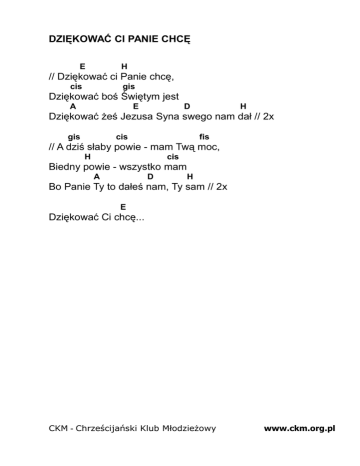 DZIĘKOWAĆ CI PANIE CHCĘ E H // Dziękować ci Panie chcę, cis gis Dziękować boś Świętym jest A E D H Dziękować żeś Jezusa Syna swego nam dał // 2x gis cis fis // A dziś słaby powie - mam Twą moc, H cis Biedny powie - wszystko mam A D H Bo Panie Ty to dałeś nam, Ty sam // 2x E Dziękować Ci chcę... CKM - Chrześcijański Klub Młodzieżowy www.ckm.org.pl