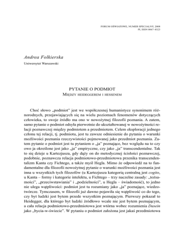 FORUM OŚWIATOWE, numer specjalny, 2008 PL ISSN 0867–0323 Andrea Folkierska Uniwersytet Warszawski Pytanie o podmiot Między heideggerem i hessenem Choć słowo „podmiot” jest we współczesnej humanistyce synonimem różnorodnych, przejawiających się na wielu poziomach fenomenów dotyczących człowieka, to swoje źródło ma ono w nowożytnej filozofii poznania. A zatem, samo pytanie o podmiot odsyła pierwotnie do ukształtowanej w nowożytności relacji poznawczej między podmiotem a przedmiotem. Celem eksploracji jednego członu tej relacji, tj. podmiotu, jest tu zawsze odniesienie do pytania o warunki możliwości poznania rzeczywistości pojmowanej jako przedmiot poznania. Zatem pytanie o podmiot jest tu pytaniem o „ja” poznające, bez względu na to czy owo ja określone jest jako „ja” empiryczne, czy jako „ja” transcendentalne. Tak to się dzieje u Kartezjusza, gdy dąży on do metodycznej ścisłości poznawczej, podobnie, poznawcza relacja podmiotowo-przedmiotowa przenika transcendentalizm Kanta czy Fichtego, a także myśl Hegla. Mimo że odpowiedź na to fundamentalne dla filozofii nowożytnej pytanie o warunki możliwości poznania jest inna u wszystkich tych filozofów (u Kartezjusza kategorią centralną jest cogito, u Kanta – formy i kategorie intelektu, u Fichtego – trzy naczelne zasady: „tożsamości”, „przeciwstawiania” i „podzielności”, u Hegla – świadomość), to jedno nie ulega wątpliwości: podmiot jest tu rozumiany jako „ja” poznające, wiedzotwórcze. Tymczasem, w filozofii już dawno pojawiła się wątpliwość co do tego, czy byt ludzki jest bytem przede wszystkim poznającym. Pierwszy pokazał to Heidegger, dla którego byt ludzki źródłowo wcale nie jest bytem poznającym, a cała relacja podmiotowo-przedmiotowa jest wtórna wobec rozumienia Dasein jako „bycia-w-świecie”. W pytaniu o podmiot założona jest jakaś przedmiotowa 142 Andrea Folkierska obecność bytu ludzkiego pośród innych bytów, której „istotę” dałoby się uchwycić w akcie poznawczym. Tymczasem Dasein „określa siebie jako byt zawsze na podstawie możliwości, którą ono j e s t i którą w swym byciu jakoś rozumie” (Heidegger 2004, s. 55). Można więc powiedzieć, że pytanie o podmiot, będąc pytaniem o b y t , jest pytaniem metafizycznym, pytaniem o jego „istotę”, gdy tymczasem pytanie o Dasein, które jest jednocześnie pytaniem samego Dasein, jest pytaniem o s e n s bycia bytu, przede wszystkim tego, którym jest istota ludzka. Dlatego też, jeśli uchwyci się to, co Heidegger nazwał różnicą ontologiczną (różnicą między bytem a byciem), to nie sposób zgodzić się z następującą konstatacją: „Biorąc pod uwagę rozważania sytuowane po stronie filozofii hermeneutycznej, wyzwania do odrodzenia «prawdziwej istoty człowieka» wyraźnie zaznaczają się w twórczości Martina Heideggera. Poprzedza je z jednej strony krytyka antropologii filozoficznej, akcentującej podmiotowo-przedmiotowy charakter związku między człowiekiem a światem, z drugiej zaś – zwrócenie uwagi ku egzystencjalnemu wymiarowi człowieczeństwa, wyrażanego za pośrednictwem kategorii «bycia-w-świecie» (Dasein)” (Męczkowska 2006, s. 146). Nie jest jednak tak, że Heidegger z j e d n e j s t r o n y krytykuje antropologię filozoficzną, a z d r u g i e j – zwraca uwagę na egzystencjalny wymiar bytu ludzkiego. Krytyka antropologii wraz z jej relacją podmiotowo-przedmiotową nie pojawia się o b o k egzystencjalnego wymiaru Dasein. Nie jest też dopełniana analityką Dasein; przeciwnie, istnieje między nimi ścisły związek, polegający na ujawnieniu wtórności całej relacji podmiotowo-przedmiotowej wobec bycia Dasein. Relacja ta, jako relacja poznawcza, jest pochodną rozumienia, będącego projektowaniem takiego czy innego sposobu bycia określonego bytu. Zaprojektowanie bytu jako bądź to podmiotu, bądź to przedmiotu jest jedną (wcale nie konieczną) z możliwości bycia Dasein, choć przenikającą całą nowożytną metafizykę. Nowożytną, gdyż sens Arystotelesowskiego słowa hypokeimenon nie pokrywał się z sensem pojęcia podmiotu w filozofii nowożytnej. Równie ważne jest to, że, jak pisze Heidegger, Grecy w ogóle nie znali także pojęcia „przedmiot”. Pojawienie się słowa „przedmiot” w myśli nowożytnej oznacza to, że byt zaczyna p r z e j a w i a ć się jako przedmiot, co w konsekwencji przekształca greckie pojęcie prawdy w nowożytne pojęcie pewności. „Uprzedmiotowienie bytu dokonuje się w przed-stawianiu (Vor-stellen), w którym zmierza się do tego, by wszelki byt ustawić przed sobą w taki sposób, aby rachujący człowiek mógł mieć pewność bytu, to znaczy być pewnym. Nauka jako badanie pojawia się dopiero wtedy i tylko wtedy, gdy prawda przekształciła się w pewność przedstawiania. Byt został po raz pierwszy określony jako przedmiotowość przedstawiania, a prawda jako jego pewność w metafizyce Descartes’a” (Heidegger 1977, s. 140). Człowiek nowo- Pytanie o podmiot 143 żytny, stając naprzeciw bytu usiłuje nim zawładnąć i rozporządzić. Tymczasem dawne pojecie subiectum jako odpowiednik Arystotelesowskiego hypokeimenon czyli „to, co leży-pierwsze [...] i co jako podłoże gromadzi na sobie wszystko” (tamże, s. 141), nie wskazywało na odniesienie tej metafizycznej „podstawy” do jakiegokolwiek „ja” czy w ogóle do człowieka (por. tamże). Nie można twierdzić, że Heidegger ukazuje „egzystencjalny wymiar człowieczeństwa jako jego «otwarcie się» ku światu[...]” (Męczykowska 2006, s. 146), gdyż Dasein j u ż j e s t w świecie, j u ż j e s t o t w a r t o ś c i ą , a nie dopiero otwiera się na świat. Wątpliwości budzi też stwierdzenie, że „[o] becność człowieka w świecie obejmuje cechy projektowania rzeczywistości, a jednocześnie własnej egzystencji; jest przesycona «troską» o świat, w kt