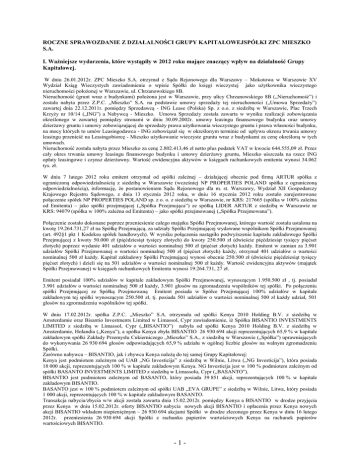 ROCZNE SPRAWOZDANIE Z DZIAŁALNOŚCI GRUPY KAPITAŁOWEJSPÓŁKI ZPC MIESZKO S.A. I. Ważniejsze wydarzenia, które wystąpiły w 2012 roku mające znaczący wpływ na działalność Grupy Kapitałowej. W dniu 26.01.2012r. ZPC Mieszko S.A. otrzymał z Sądu Rejonowego dla Warszawy – Mokotowa w Warszawie XV Wydział Ksiąg Wieczystych zawiadomienie o wpisie Spółki do księgi wieczystej jako użytkownika wieczystego nieruchomości położonej w Warszawie, ul. Chrzanowskiego 8B. Nieruchomość (grunt wraz z budynkami) położona jest w Warszawie, przy ulicy Chrzanowskiego 8B („Nieruchomość”) i została nabyta przez Z.P.C. „Mieszko” S.A. na podstawie umowy sprzedaży tej nieruchomości („Umowa Sprzedaży”) zawartej dnia 22.12.2011r. pomiędzy Sprzedawcą - ING Lease (Polska) Sp. z o.o. z siedzibą w Warszawie, Plac Trzech Krzyży nr 10/14 („ING”) a Nabywcą - Mieszko. Umowa Sprzedaży została zawarta w wyniku realizacji zobowiązania określonego w zawartej pomiędzy stronami w dniu 30.09.2002r. umowy leasingu finansowego budynku oraz umowy dzierżawy gruntu i umowy zobowiązującej do sprzedaży prawa użytkowania wieczystego gruntu i prawa własności budynku, na mocy których to umów Leasingodawca - ING zobowiązał się w określonym terminie od upływu okresu trwania umowy leasingu przenieść na Leasingobiorcę - Mieszko użytkowanie wieczyste gruntu wraz z budynkami za cenę określoną w tych umowach. Nieruchomość została nabyta przez Mieszko za cenę 2.802.413,46 zł netto plus podatek VAT w kwocie 644.555,09 zł. Przez cały okres trwania umowy leasingu finansowego budynku i umowy dzierżawy gruntu, Mieszko uiszczała na rzecz ING opłaty leasingowe i czynsz dzierżawny. Wartość ewidencyjna aktywów w księgach rachunkowych emitenta wynosi 34.062 tys. zł. W dniu 7 lutego 2012 roku emitent otrzymał od spółki zależnej – działającej obecnie pod firmą ARTUR spółka z ograniczoną odpowiedzialnością z siedzibą w Warszawie (wcześniej NP PROPERTIES POLAND spółka z ograniczoną odpowiedzialnością), informację, że postanowieniem Sądu Rejonowego dla m. st. Warszawy, Wydział XII Gospodarczy Krajowego Rejestru Sądowego, z dnia 13 stycznia 2012 roku, w dniu 16 stycznia 2012 roku zostało zarejestrowane połączenie spółek NP PROPERTIES POLAND sp. z o. o. z siedzibą w Warszawie, nr KRS: 217665 (spółka w 100% zależna od Emitenta) – jako spółki przejmującej („Spółka Przejmująca”) ze spółką LIDER ARTUR z siedzibą w Warszawie nr KRS: 94079 (spółka w 100% zależna od Emitenta) – jako spółki przejmowanej („Spółka Przejmowana”). Połączenie zostało dokonane poprzez przeniesienie całego majątku Spółki Przejmowanej, którego wartość została ustalona na kwotę 19.264.731,27 zł na Spółkę Przejmującą, za udziały Spółki Przejmującej wydawane wspólnikom Spółki Przejmowanej (art. 492§1 pkt 1 Kodeksu spółek handlowych). W wyniku połączenia nastąpiło podwyższenie kapitału zakładowego Spółki Przejmującej z kwoty 50.000 zł (pięćdziesiąt tysięcy złotych) do kwoty 250.500 zł (dwieście pięćdziesiąt tysięcy pięćset złotych) poprzez wydanie 401 udziałów o wartości nominalnej 500 zł (pięćset złotych) każdy. Emitent w zamian za 3.901 udziałów Spółki Przejmowanej o wartości nominalnej 500 zł (pięćset złotych) każdy, otrzymał 401 udziałów o wartości nominalnej 500 zł każdy. Kapitał zakładowy Spółki Przejmującej wynosi obecnie 250.500 zł (dwieście pięćdziesiąt tysięcy pięćset złotych) i dzieli się na 501 udziałów o wartości nominalnej 500 zł każdy. Wartość ewidencyjna aktywów (majątek Spółki Przejmowanej) w księgach rachunkowych Emitenta wynosi 19.264.731, 27 zł. Emitent posiadał 100% udziałów w kapitale zakładowym Spółki Przejmowanej, wynoszącym 1.950.500 zł , tj. posiadał 3.901 udziałów o wartości nominalnej 500 zł każdy, 3.901 głosów na zgromadzeniu wspólników tej spółki. Po połączeniu spółki Przejmującej ze Spółką Przejmowaną Emitent posiada w Spółce Przejmującej 100% udziałów w kapitale zakładowym tej spółki wynoszącym 250.500 zł, tj. posiada 501 udziałów o wartości nominalnej 500 zł każdy udział, 501 głosów na zgromadzeniu wspólników tej spółki. W dniu 17.02.2012r. spółka Z.P.C. „Mieszko” S.A. otrzymała od spółki Kenya 2010 Holding B.V. z siedzibą w Amsterdamie oraz Bisantio Investments Limited w Limassol, Cypr zawiadomienie, iż Spółka BISANTIO INVESTMENTS LIMITED z siedzibą w Limassol, Cypr („BISANTIO”) nabyła od spółki Kenya 2010 Holding B.V. z siedzibą w Amsterdamie, Holandia („Kenya”), a spółka Kenya zbyła BISANTIO 26 930 694 akcji reprezentujących 65,9 % w kapitale zakładowym spółki Zakłady Przemysłu Cukierniczego „Mieszko” S.A., z siedzibą w Warszawie („Spółka”) uprawniających do wykonywania 26 930 694 głosów odpowiadających 65,9 % udziału w ogólnej liczbie głosów na walnym zgromadzeniu Spółki. Zarówno nabywca – BISANTIO, jak i zbywca Kenya należą do tej samej Grupy Kapitałowej: Kenya jest podmiotem zależnym od UAB „NG Investicija” z siedzibą w Wilnie, Litwa („NG Investicija”), która posiada 18 000 akcji, reprezentujących 100 % w kapitale zakładowym Kenya. NG Investicija jest w 100 % podmiotem zależnym od spółki BASANTO INVESTMENTS LIMITED z siedzibą w Limassolu, Cypr („BASANTO”). BISANTIO jest podmiotem zależnym od BASANTO, który posiada 39 851 akcji, reprezentujących 100 % w kapitale zakładowym BISANTIO. BASANTO jest w 100 % podmiotem zależnym od spółki UAB „EVA GRUPE” z siedzibą w Wilnie, Litwa, który posiada 1 000 akcji, reprezentujących 100 % w kapitale zakładowym BASANTO. Transakcja nabycia/zbycia w/w akcji została zawarta dnia 15.02.2012r. pomiędzy Kenya a BISANTIO w drodze przyjęcia przez Kenya w dniu 15.02.2012r. oferty BISANTIO nabycia nowych akcji BISANTIO i opłaceni