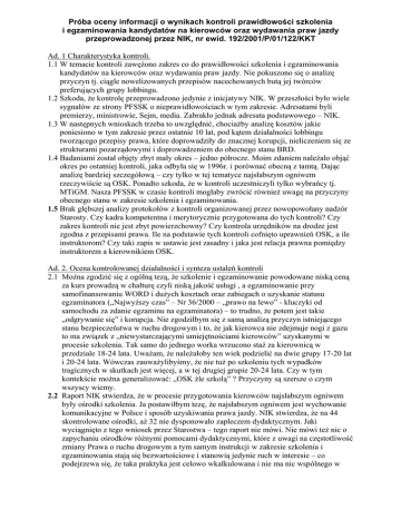 Próba oceny informacji o wynikach kontroli prawidłowości szkolenia i egzaminowania kandydatów na kierowców oraz wydawania praw jazdy przeprowadzonej przez NIK, nr ewid. 192/2001/P/01/122/KKT Ad. 1 Charakterystyka kontroli. 1.1 W temacie kontroli zawężono zakres co do prawidłowości szkolenia i egzaminowania kandydatów na kierowców oraz wydawania praw jazdy. Nie pokuszono się o analizę przyczyn tj. ciągle nowelizowanych przepisów nacechowanych butą jej twórców preferujących grupy lobbingu. 1.2 Szkoda, że kontrolę przeprowadzono jedynie z inicjatywy NIK. W przeszłości było wiele sygnałów ze strony PFSSK o nieprawidłowościach w tym zakresie. Adresatami byli premierzy, ministrowie, Sejm, media. Zabrakło jednak adresata podstawowego – NIK. 1.3 W następnych wnioskach trzeba to uwzględnić, chociażby analizę kosztów jakie poniesiono w tym zakresie przez ostatnie 10 lat, pod kątem działalności lobbingu tworzącego przepisy prawa, które doprowadziły do znacznej korupcji, nieliczeniem się ze strukturami pozarządowymi i doprowadzeniem do obecnego stanu BRD. 1.4 Badaniami został objęty zbyt mały okres – jedno półrocze. Moim zdaniem należało objąć okres po ostatniej kontroli, jaka odbyła się w 1996r. i porównać obecną z tamtą. Dając analizę bardziej szczegółową – czy tylko w tej tematyce najsłabszym ogniwem rzeczywiście są OSK. Ponadto szkoda, że w kontroli uczestniczyli tylko wybrańcy tj. MTiGM. Nasza PFSSK w czasie kontroli mogłaby zwrócić również uwagę na przyczyny obecnego stanu w zakresie szkolenia i egzaminowania. 1.5 Brak głębszej analizy protokołów z kontroli organizowanej przez nowopowołany nadzór Starosty. Czy kadra kompetentna i merytorycznie przygotowana do tych kontroli? Czy zakres kontroli nie jest zbyt powierzchowny? Czy kontrola urzędników na drodze jest zgodna z przepisami prawa. Ile na podstawie tych kontroli cofnięto uprawnień OSK, a ile instruktorom? Czy taki zapis w ustawie jest zasadny i jaka jest relacja prawna pomiędzy instruktorem a kierownikiem OSK. Ad. 2. Ocena kontrolowanej działalności i synteza ustaleń kontroli 2.1 Można zgodzić się z ogólną tezą, że szkolenie i egzaminowanie powodowane niską ceną za kurs prowadzą w chałturę czyli niską jakość usługi , a egzaminowanie przy samofinansowaniu WORD i dużych kosztach oraz zabiegach o uzyskanie statusu egzaminatora („Najwyższy czas” – Nr 36/2000 – „prawo na lewo” - kluczyki od samochodu za zdanie egzaminu na egzaminatora) – to trudno, że potem jest takie „odgrywanie się” i korupcja. Nie zgodziłbym się z samą analizą przyczyn istniejącego stanu bezpieczeństwa w ruchu drogowym i to, że jak kierowca nie zdejmuje nogi z gazu to ma związek z „niewystarczającymi umiejętnościami kierowców” uzyskanymi w procesie szkolenia. Tak samo do jednego worka wrzucono staż za kierownicą w przedziale 18-24 lata. Uważam, że należałoby ten wiek podzielić na dwie grupy 17-20 lat i 20-24 lata. Wówczas zauważylibyśmy, że nie tuż po szkoleniu tych wypadków tragicznych w skutkach jest więcej, a w tej drugiej grupie 20-24 lata. Czy w tym kontekście można generalizować: „OSK źle szkolą” ? Przyczyny są szersze o czym wszyscy wiemy. 2.2 Raport NIK stwierdza, że w procesie przygotowania kierowców najsłabszym ogniwem były ośrodki szkolenia. Ja postawiłbym tezę, że najsłabszym ogniwem jest wychowanie komunikacyjne w Polsce i sposób uzyskiwania prawa jazdy. NIK stwierdza, że na 44 skontrolowane ośrodki, aż 32 nie dysponowało zapleczem dydaktycznym. Jaki wyciągnięto z tego wniosek przez Starostwa – tego raport nie mówi. Nie mówi też nic o zapychaniu ośrodków różnymi pomocami dydaktycznymi, które z uwagi na częstotliwość zmiany Prawa o ruchu drogowym a tym samym instrukcji w zakresie szkolenia i egzaminowania stają się bezwartościowe i stanowią jedynie ruch w interesie – co podejrzewa się, że taka praktyka jest celowo wkalkulowana i nie ma nic wspólnego w 2 stabilizacji OSK, poprawę procesu szkolenia i egzaminowania, czy poprawę BRD. Oddzieliłbym niewłaściwy proces szkolenia na wpływ czynności administracyjnych w przedmiocie prowadzenia dokumentacji. Przez ostatnie 10 lat to ciągłe „mieszanie” w prawie przez DTS. Ciągle nowe druki, czy dodaje się „cos” po przecinku lub stawia kropkę nad „i”. Kto za to płaci? Ciągle nowe podręczniki, testy, programy, zmiany stanowisk na placu manewrowym, zmiany samochodów. Przecież tego Święty nie wytrzyma, nie mówiąc już o kosztach. To radosna twórczość. Chcąc utrzymać się w gospodarce rynkowej wzorem hipermarketów OSK szukają zysków w chałturze. Raport nie podaje jak temu zaradzić ani nie ustosunkowuje się czy prawo – instrukcje, w którym się obracamy jest prawidłowo skonstruowane i czy właściwie funkcjonuje. Właśnie po wychowaniu komunikacyjnym na drugim miejscu postawiłbym jako przyczyny wadliwego szkolenia i egzaminowania tworzone prawo, a na trzecim miejscu dopiero OSK. I tak, uzyskiwanie prawa jazdy w Polsce jest drogą ciernistą. Wiemy, że w niektórych krajach europejskich natychmiast po otrzymaniu zaświadczenia o zdaniu egzaminu można być już czynnym kierowcą. U nas kurs trwa stosunkowo krótko z uwagi na „wyścigi” OSK w pozyskiwaniu klienta. Tak uprzednio konieczna rejonizacja po wielu protestach RPO i innych została zniesiona i nic nikomu się nie stało. Choć wiemy, że są pełne autokary z kursantami wyjeżdżającymi do innego województwa bo tam „ma się” układy i łatwiej zdać – ale to inna sprawa. Raport przepisuje ustawę Prawo o ruchu drogowym i rozporządzenia nie analizując zaś czy rozpoczęcie jazd po 10-ciu godzinach jest słuszne z punktu edukacji kursanta czy nie. Bywa tak, że po 10 godzinach rozpoczynamy naukę jazdy ale nie kończymy jeszcze teorii, bo zanim kursant ukończy kurs i przystąpi do egzaminu to jeszcze dwa 