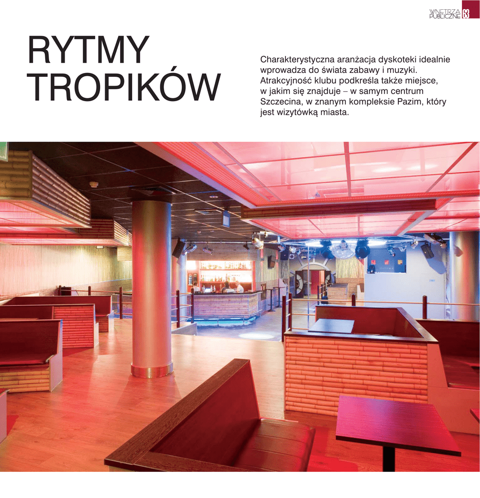 63 RYTMY TROPIKÓW Charakterystyczna aran˝acja dyskoteki idealnie wprowadza do Êwiata zabawy i muzyki. AtrakcyjnoÊç klubu podkreÊla tak˝e miejsce, w jakim si´ znajduje – w samym centrum Szczecina, w znanym kompleksie Pazim, który jest wizytówkà miasta. KULTURA 64 aila Club w ostatnim czasie przeszed∏ wielkà metamorfoz´: miejsce strzech i tropików zaj´∏a hipnotyczna przestrzeƒ i karmazynowa poÊwiata, a ciàgnàce si´ rz´dami tyczki bambusów – intensywne barwy i kszta∏ty. Odwiedzajàcy jednak nadal czuje si´ jak w tropikach, pomimo ˝e lokal uzyska∏ wiele wspó∏czesnego wyrazu. W aran˝acjach czuç r´k´ architekt Anny Buczny. W przestrzeni zamkni´tej Êcianami wyodr´bni∏a ona wiele zau∏ków i zaskakujàcych kszta∏tów. Ju˝ od momentu wejÊcia do klubu wspinamy si´ po schodach, w´drujàc tropikalnym gàszczem. Im wy˝ej, tym wi´cej karmazynu, wi´cej fantazji oraz goràcych rytmów. Wystrój lokalu to klimat goràcych mórz tropikalnych, co idealnie zach´ca do tanecznej zabawy przy egzotycznym drinku. Dyskoteka jest klimatyzowana, posiada te˝ wewn´trzny system monitoringu, co sprawia, ˝e goÊcie mogà czuç si´ bezpiecznie i swobodnie. B PROJEKT Zale˝a∏o na tym, aby stworzyç nie tylko nowà i estetycznà przestrzeƒ dla goÊci, ale tak˝e funkcjonalnà dla pracowników. Obecna aran˝acja lokalu nawiàzuje do wczeÊniejszej stylizacji. Stali bywalcy Baila Clubu byli bardzo przywiàzani do pierwotnego wystroju, którego g∏ównym motywem by∏y dekoracje bambu- sowe. Podobnie rzecz si´ mia∏a z logo Baila Clubu prezentujàcego charakterystyczne trzy palmy. Dzia∏ marketingu Spó∏ki Pazim wypracowywa∏ je przez wiele lat, dzi´ki czemu sta∏o si´ powszechnie rozpoznawalne. By∏y to zatem wa˝ne wytyczne, które ukierunkowa∏y charakter nowego designu klubu – wyjaÊnia architekt Anna Buczny. Uk∏ad funkcjonalny tej charakterystycznej szczeciƒskiej dyskoteki zosta∏ praktycznie zachowany w ca∏oÊci, gdy˝ bardzo dobrze si´ sprawdzi∏ w latach wczeÊniejszych. Wymaga∏ wi´c tylko drobnych korekt, które do projektu wnieÊli pracownicy dyskoteki. Dzi´ki temu obecnie dzia∏ajàcy lokal jest przyjazny dla obs∏ugi i bardzo komfortowy dla goÊci. Ca∏à koncepcj´ wn´trza lokalu dostosowa∏am do odbywajàcych si´ tu cyklicznie dyskotek i eventów. Ka˝da z tych funkcji mo˝e byç tu ∏atwo zaaran˝owana. PRZEBIEG PRAC Prace projektowe nad nowym obliczem Baila Clubu rozpocz´∏y si´ w sierpniu 2007 r., a zakoƒczy∏y w paêdzierniku 2007 r. Prace budowlane ruszy∏y pe∏nà parà w momencie zakoƒczenia budowy Baltica Wellnes & Spa, która równie˝ mieÊci si´ w tej cz´Êci kompleksu biznesowo-rozrywkowego Pazim. Baila Club zajmuje ok. 550 metrów kwadratowych powierzchni. Dyskoteka Baila Club od 2002 roku by∏a i jest cz´- d OÊwietlenie to bardzo wa˝ny element ka˝dego wn´trza. Umieszczone na metalowej konstrukcji reflektory pot´gujà nastrój s∏onecznych tropików. a Bambus to g∏ównym element wystroju lokalu. Zbudowano z niego wszystkie lo˝e oraz bar. f Motyw charakterystycznych roÊlin tropikalnych pojawia si´ w ka˝dym zakàtku klubu. 65 Êcià tego obszernego zespo∏u, który pomyÊlany zosta∏ tak, aby mo˝na by∏o po∏àczyç tu biznes z przyjemnoÊcià. Sprzyja temu lokalizacja hotelu Radisson SAS, mieszczàcego si´ w kompleksie Pazim. By∏o to wa˝nà wytycznà narzuconà przez inwestora. Podczas prac remontowych nie odnotowaliÊmy wi´kszych problemów wykonawczych. Sta∏e nadzory autorskie z mojej strony i wspó∏praca z pracownikami Clubu Baila wyeliminowa∏a wàtpliwoÊci, których cz´sto jest du˝o w trakcie tego typu robót budowlanych. Bambus sta∏ si´ wi´c g∏ównym elementem wystroju. Zbudowano z niego wszystkie lo˝e oraz bar. Motyw tej charakterystycznej roÊliny umieszczony zosta∏ równie˝ na fototapecie, która wype∏nia wi´kszà cz´Êç powierzchni Êcian dyskoteki. Toalety zosta∏y ca∏kowicie zmodernizowane. Ciekawym elementem dekoracyjnym sà tu wtràcenia nadrukowanego, kolorowego szk∏a, które bardzo o˝ywia monochromatycznà powierzchni´ kafli Êciennych. Dla optycznego powi´kszenia i uzyskania ciekawych efektów wprowadzi∏am te˝ wielkoformatowe lustra. NOWA JAKOÂå Âwiat∏o jest jednym z wa˝niejszych detali nowej aran˝acji. èród∏a Êwiat∏a LED zosta∏y umieszczone pod podestami, na których zbudowane sà lo˝e, akcentujà one równie˝ ciàgi komunikacyjne. Rozproszone czerwone oÊwietlenie, sàczàce si´ ze szklanych sufitów lo˝y, tworzy ciep∏y nastrój, sprzyjajàcy dobrej zabawie. Sercem klubu jest bar. Przyciàga on nie tylko ognistym kolorem Êciany, gdzie wyeksponowane zosta∏y alkohole, ale tak˝e ciekawymi, poszatkowanymi horyzontalnymi wn´kami, pi´knie oÊwietlonymi pó∏kami. Jest to miejsce ch´tnie odwiedzane podczas dyskotek, a jego funkcjonalnoÊç staje si´ niezwykle wa˝na dla obs∏ugi klubu. Forma lo˝y i baru ró˝ni si´ mocno od pierwotnej. Nowe kszta∏ty zosta∏y uproszczone, wyoblenia ustàpi∏y miejsca liniom i kàtom prostym. Mi´kkie linie ∏uków tworzà dekoracyjne przejÊcia. Formy te kojarzone sà ze s∏oƒcem, które jest symbolem radoÊci, ciep∏a i dobrej zabawy, a tej nigdy tu nie brakowa∏o. Wykoƒczenie powierzchni malarskich zosta∏o zabezpieczone przed ich uszkodzeniem. Dolne partie Êcian, czyli te cz´Êci b´dàce najbardziej nara˝one na zniszczenie, pokryte zosta∏y glazurà przypominajàcà rodzaj ska∏y, kamienia. Te i pozosta∏e materia∏y wykoƒczeniowe, zaplanowane w projekcie, tworzà charakterystyczny nastrój, który kojarzony jest z atmosferà ciep∏ych, oceanicznych pla˝ pe∏nych kolorowych barów i finezyjnych drinków, z których s∏ynie dyskoteka. Tekst: Szymon Martysz, zdj´cia: Bartosz Jarosz obiekt: Baila Club lokalizacja: Szczecin projektant: Anna Buczny, Studio Buczny Design powierzchnia: ok. 550 m2 inwestor: Spó∏ka Pazim czas realizacji 
