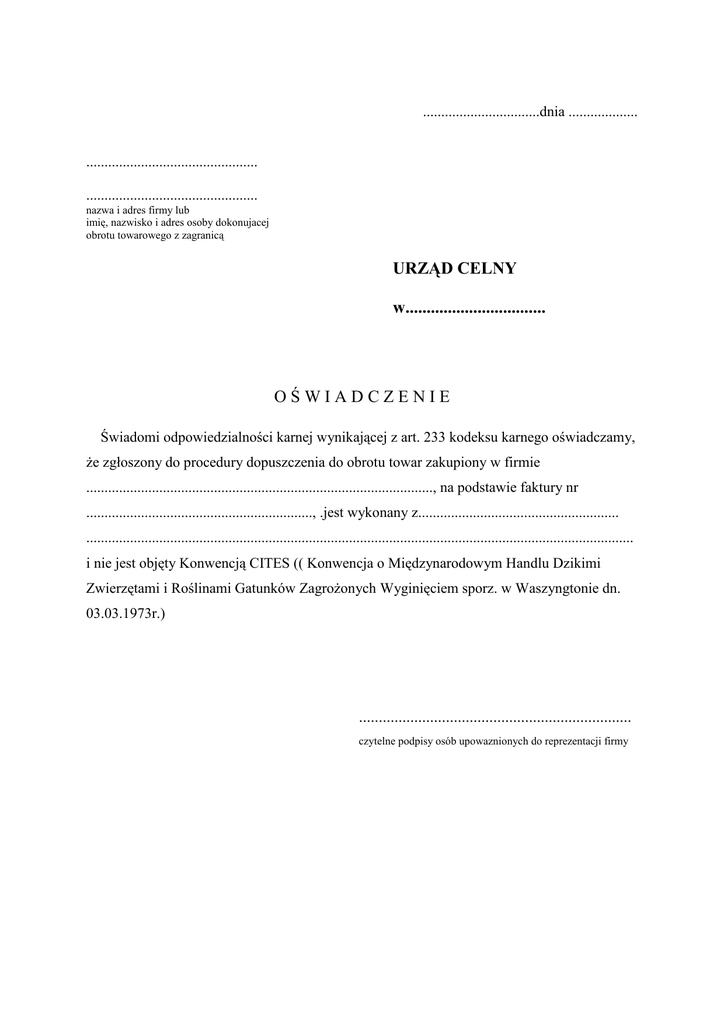 ................................dnia ................... ............................................... ............................................... nazwa i adres firmy lub imię, nazwisko i adres osoby dokonujacej obrotu towarowego z zagranicą URZĄD CELNY w................................. OŚWIADCZENIE Świadomi odpowiedzialności karnej wynikającej z art. 233 kodeksu karnego oświadczamy, Ŝe zgłoszony do procedury dopuszczenia do obrotu towar zakupiony w firmie ..............................................................................................., na podstawie faktury nr .............................................................., .jest wykonany z....................................................... ...................................................................................................................................................... i nie jest objęty Konwencją CITES (( Konwencja o Międzynarodowym Handlu Dzikimi Zwierzętami i Roślinami Gatunków ZagroŜonych Wyginięciem sporz. w Waszyngtonie dn. 03.03.1973r.) ..................................................................... czytelne podpisy osób upowaznionych do reprezentacji firmy