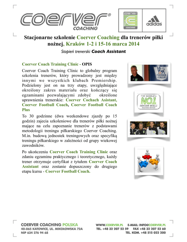 Stacjonarne szkolenie Coerver Coaching dla trenerów piłki nożnej, Kraków 1-2 i 15-16 marca 2014 Stopień trenerski Coach Assistant Coerver Coach Training Clinic - OPIS Coerver Coach Training Clinic to globalny program szkolenia trenerów, który prowadzony jest między innymi we wszystkich klubach Premiership. Podzielony jest on na trzy etapy, uwzględniające określony zakres materiału oraz kończący się egzaminami pozwalającymi zdobyć określone uprawnienia trenerskie: Coerver Cochach Asistant, Coerver Football Coach, Coerver Football Coach Plus To 30 godzinne (dwa weekendowe zjazdy po 15 godzin) zajecia szkoleniowe dla trenerów piłki nożnej mające na celu zapoznanie trenerów z podstawami metodologii treningu piłkarskiego Coerver Coaching. M.in. budową jednostek treningowych oraz specyfiką treningu piłkarskiego w zależności od grupy wiekowej zawodników. Po ukończeniu Coerver Coach Training Clinic oraz zdaniu egzaminu praktycznego i teoretycznego, każdy trener otrzymuje certyfikat z tytułem Coerver Coach Assistant oraz zostanie dopuszczony do drugiego etapu kursu - Coerver Football Coach. Coerver Coach Training Clinic - SPECYFIKA SZKOLENIA Specyfiką szkoleń piłkarskich Coerver Coaching jest to, iż w dużej mierze, stawiamy na umiejętności praktyczne szkolnych przez nas trenerów. We wszystkich zajęciach podczas kursu, trenerzy biorą czynny udział, aktywnie wykonujączaplanowane ćwiczenia i moduły treningowe. Coerver Coach Training Clinic - TERMINY I MIASTA Kolejna edycja - Coerver Coach Asistant - bedzie odbywała się w Krakowie - 1-2, 15-16 marca 2014 Coerver Coach Training Clinic - PROWADZĄCY Robert Radek i Mariusz Paszkowski - Coerver Master Coach, w strukturach Coerver Coaching od 2009 roku. Uczestnicy szkoleń trenerskich Coerver Coaching w Liverpoolu, Norymberdze, Barcelonie, Londynie, Genewie, Vejile. Uczestnicy szkoleń dla trenerów akademii piłkarskich klubów Premiership prowadzonych przez Coerver Coaching. Prowadzili zajęcia oraz szkolili trenerów na międzynarodowych obozach piłkarskich Coerver Coach Training Clinic - ZAKRES MERYTORYCZNY Moduł 1 Wizja treningowa Coerver Coaching. Budowa jednostki treningowej Coerver Coaching z podziałem na kategorie wiekowe. Ball mastery jako fundament techniki użytkowej zawodnika – Piramida Umiejętności Zawodnika Coerver Coaching. Moduł 2 Program szkolenia Coerver Coaching. Podstawy treningu motorycznego. Change of direction jako podstawa Piramidy Ruchów Coerver Coaching. Moduł 3 Planowanie sesji treningowych zgodnie ze strukturą treningu Coerver Coaching /Session Planner/. Metodyka nauczania zwodów. Mirror moves. Moduł 4 Zajęcia praktyczne zgodnie z piramidą rozwoju zawodnika /przykładowe sesje treningowe/ Funny Games, Ball mastery, Moves 1&1, Group play, SSG, HW/. Stopniowanie presji w szkoleniu dzieci i młodzieży – Most Umiejętności Coerver Coaching. Moduł 5 Sprawdzenie wiedzy teoretycznej. Tworzenie i prowadzenie sesji piłkarskich zgodnie ze strukturą treningową Coerver Coaching /przykładowe sesje treningowe/. Coerver Coach Training Clinic - MATERIAŁY TRENINGOWE Każdy z trenerów, kończacych z wynikiem pozytywnym, kurs Coerver Coach Assistant otrzyma 5 modułów treningowych wprowadzajacych do metodologii Coerver Coaching oraz filmy obrazujące podstawowe elementy jednostek treningowych. Coerver Coach Training Clinic - OFERTA CENOWA Koszt szkolenia wynosi 1500 pln brutto za jednego uczestnika. W przypadku zgłoszenia przez klub wiecej niż dwóch trenerów, 10% zniżki na każdego trenera. Cena zawiera: 1. 30 godzin szkolenia Coerver Coaching (teoria + praktyka), 2 weekendowe zjazdy po 15 godzin. 2. Materiały treningowe - 5 modułów treningowych + 5 filmów. 3. Koszulkę treningową marki adidas. Coerver Coach Training Clinic - ZGŁOSZENIA I KONTAKT Warunkiem zgłoszenia jest przesłanie na adres l u k a s z . b u d z y n s k i @ c o e r v e r. p l w y p e ł n i o n e g o formularza zgłoszeniowego oraz dokonanie wpłaty na konto podane w formularzu. Formularz można pobrać ze strony www.coerver.pl, znajduje sie on w zakładce szkolenia w informacji o klinice. Dodatkowe informacje: 515-022-200, [email protected]