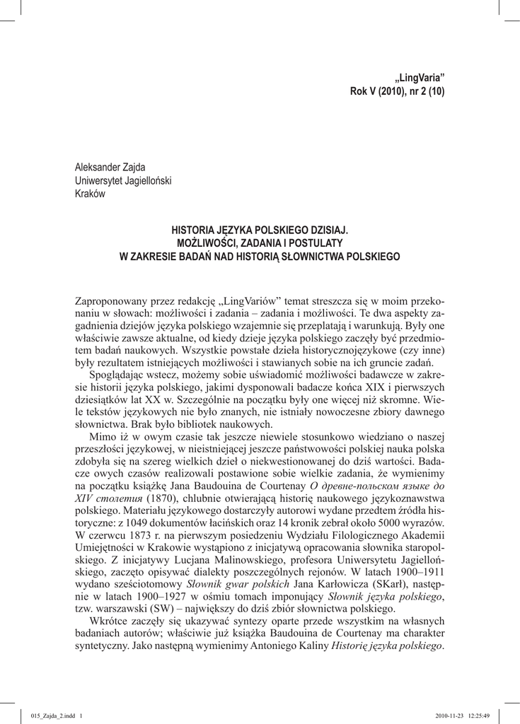 „LingVaria” Rok V (2010), nr 2 (10) Aleksander Zajda Uniwersytet Jagielloński Kraków Historia języka polskiego dzisiaj. MOŻLIWOŚCI, ZADANIA I POSTULATY W ZAKRESIE BADAŃ NAD HISTORIĄ SŁOWNICTWA POLSKIEGO Zaproponowany przez redakcję „LingVariów” temat streszcza się w moim przekonaniu w słowach: możliwości i zadania – zadania i możliwości. Te dwa aspekty zagadnienia dziejów języka polskiego wzajemnie się przeplatają i warunkują. Były one właściwie zawsze aktualne, od kiedy dzieje języka polskiego zaczęły być przedmiotem badań naukowych. Wszystkie powstałe dzieła historycznojęzykowe (czy inne) były rezultatem istniejących możliwości i stawianych sobie na ich gruncie zadań. Spoglądając wstecz, możemy sobie uświadomić możliwości badawcze w zakresie historii języka polskiego, jakimi dysponowali badacze końca XIX i pierwszych dziesiątków lat XX w. Szczególnie na początku były one więcej niż skromne. Wiele tekstów językowych nie było znanych, nie istniały nowoczesne zbiory dawnego słownictwa. Brak było bibliotek naukowych. Mimo iż w owym czasie tak jeszcze niewiele stosunkowo wiedziano o naszej przeszłości językowej, w nieistniejącej jeszcze państwowości polskiej nauka polska zdobyła się na szereg wielkich dzieł o niekwestionowanej do dziś wartości. Badacze owych czasów realizowali postawione sobie wielkie zadania, że wymienimy na początku książkę Jana Baudouina de Courtenay О древне-польском языке до XIV столетия (1870), chlubnie otwierającą historię naukowego językoznawstwa polskiego. Materiału językowego dostarczyły autorowi wydane przedtem źródła his toryczne: z 1049 dokumentów łacińskich oraz 14 kronik zebrał około 5000 wyrazów. W czerwcu 1873 r. na pierwszym posiedzeniu Wydziału Filologicznego Akademii Umiejętności w Krakowie wystąpiono z inicjatywą opracowania słownika staropolskiego. Z inicjatywy Lucjana Malinowskiego, profesora Uniwersytetu Jagiellońskiego, zaczęto opisywać dialekty poszczególnych rejonów. W latach 1900–1911 wydano sześciotomowy Słownik gwar polskich Jana Karłowicza (SKarł), następnie w latach 1900–1927 w ośmiu tomach imponujący Słownik języka polskiego, tzw. warszawski (SW) – największy do dziś zbiór słownictwa polskiego. Wkrótce zaczęły się ukazywać syntezy oparte przede wszystkim na własnych badaniach autorów; właściwie już książka Baudouina de Courtenay ma charakter syntetyczny. Jako następną wymienimy Antoniego Kaliny Historię języka polskiego. 015_Zajda_2.indd 1 20101123 12:25:49 76 ALEKSANDER ZAJDA I. Formy gramatyczne języka polskiego do końca XVIII w. (Kalina 1883) – pierwszą właściwie gramatykę historyczną języka polskiego, dalej Dzieje języka polskiego Aleksandra Brücknera (Brückner 1906), Dialekty języka polskiego Kazimierza Nitscha (Nitsch 1915), Jana Łosia Przegląd językowych zabytków staropolskich do 1543 r. (Łoś 1915), praca, która według Stanisława Borawskiego (Borawski 2000) zamyka okres filologiczno-dokumentacyjny w historii językoznawstwa polskiego, następnie imponujące do dziś zespołowe dzieło: dwutomowe kompendium Język polski i jego historia z uwzględnieniem innych języków na ziemiach polskich (Łoś i in. 1915) – w sumie prawie 1000 stron, J. Łosia Gramatykę polską w trzech tomach (Łoś 1922–1927), Gramatykę języka polskiego pięciu autorów (Gramatyka 1923). Swoją wytrwałą pracą w dziedzinie dialektologii K. Nitsch stał się twórcą naukowych badań w tej dziedzinie. W tym czasie powstał też jedyny do niedawna kompletny Słownik etymologiczny języka polskiego A. Brücknera (SEBr). Następni badacze czerpali z tych opracowań pełnymi garściami. W 1924 r. ukazała się niewielka książeczka Witolda Taszyckiego Polskie nazwy osobowe (Taszycki 1924), a w rok później tegoż autora Najdawniejsze polskie imiona osobowe (Taszycki 1925) – zwiastuny bogatej twórczości naukowej W. Taszyckiego w dziedzinie onomastyki, uwieńczonej Słownikiem staropolskich nazw osobowych (SSNO), opracowanym i zredagowanym pod jego kierunkiem. W tym też czasie postawiony został problem pochodzenia polskiego języka literackiego i wysunięto dwie tezy: wielkopolską (Kalina 1883: 21; Nitsch 1913) i małopolską (Brückner 1911); dążność do uzasadnienia tych tez stała się najbardziej płodną w prace dyskusją w historii językoznawstwa polskiego. To jest świadectwo możliwości ówczesnej nauki polskiej. Wszyscy ci autorzy położyli fundamenty pod rozwój językoznawstwa polskiego. Badacze zawsze korzystali z istniejących możliwości i wypełniali stawiane sobie zadania. A. Brückner w słowie wstępnym do swojego Słownika etymologicznego pisze: Wdzięczny wszelkim poprzednikom, zaznaczę gołosłownie, że oni mi tę pracę – nie ułatwili, lecz umożliwili, że bez nich wcale by jej nie było (SEBr: 2). Podobnie W. Taszycki we wstępie do SSNO wymienia swoich poprzedników w zbieraniu nazw – Zygmunta Glogera i J. Łosia. Opublikowane wydawnictwa źród łowe umożliwiły zebranie materiałów do Słownika staropolskiego (SStp) i wspomnianego już SSNO, słowniki te zaś stały się podstawą wielu prac szczegółowych z historii słownictwa polskiego; z onomastyki umożliwiły powstanie wielotomowego Słownika etymologiczno-motywacyjnego staropolskich nazw osobowych pod redakcją Aleksandry Cieślikowej, Marii Malec i Kazimierza Rymuta (SE-MSNO). Jeśli chodzi o stan obecny, a więc o problem sformułowany w tytule, to śmiem mniemać, że zamknięte subsystemy języka polskiego, takie jak subsystem fonologiczny, morfologiczny (fleksyjny), syntaktyczny, badane i opisywane od początku naukowego językoznawstwa polskiego, są już w swoim rozwoju historycznym dobrze znane i niewiele można tu już dodać (wyjątek to subsystem syntaktyczny), chyba jakieś fakty szczegółowe. Natomiast największe możliwości i zadania is