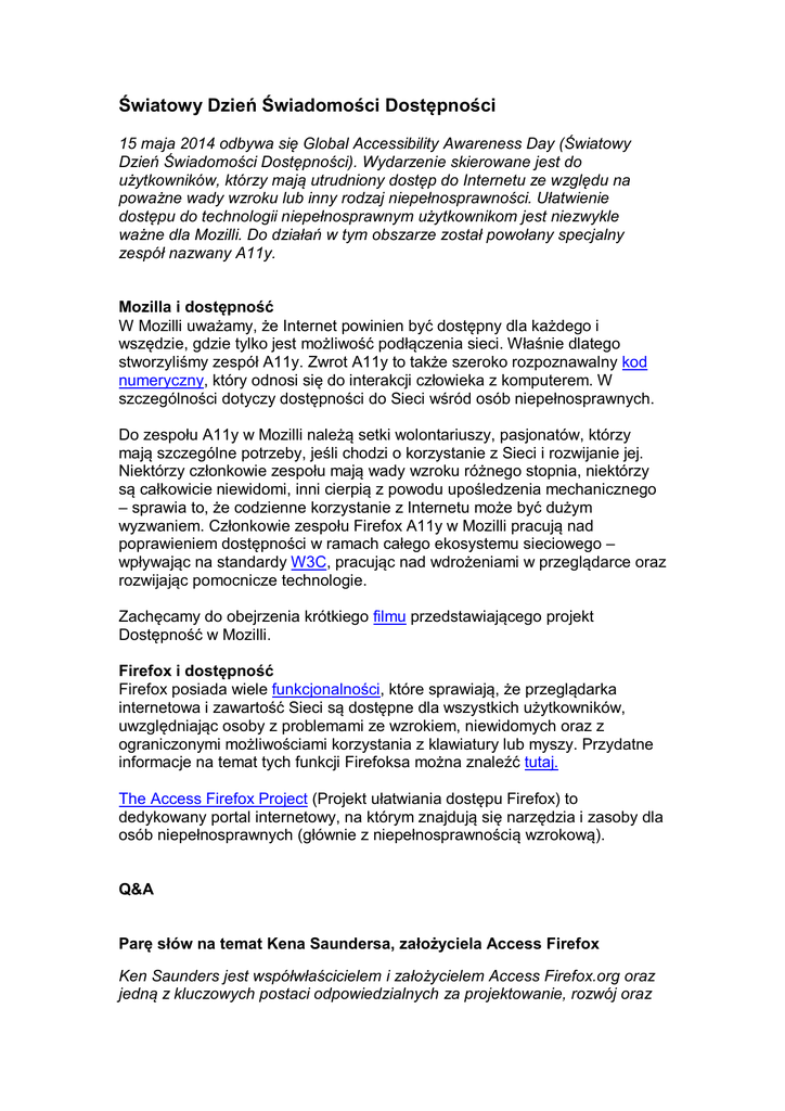 Światowy Dzień Świadomości Dostępności 15 maja 2014 odbywa się Global Accessibility Awareness Day (Światowy Dzień Świadomości Dostępności). Wydarzenie skierowane jest do użytkowników, którzy mają utrudniony dostęp do Internetu ze względu na poważne wady wzroku lub inny rodzaj niepełnosprawności. Ułatwienie dostępu do technologii niepełnosprawnym użytkownikom jest niezwykle ważne dla Mozilli. Do działań w tym obszarze został powołany specjalny zespół nazwany A11y. Mozilla i dostępność W Mozilli uważamy, że Internet powinien być dostępny dla każdego i wszędzie, gdzie tylko jest możliwość podłączenia sieci. Właśnie dlatego stworzyliśmy zespół A11y. Zwrot A11y to także szeroko rozpoznawalny kod numeryczny, który odnosi się do interakcji człowieka z komputerem. W szczególności dotyczy dostępności do Sieci wśród osób niepełnosprawnych. Do zespołu A11y w Mozilli należą setki wolontariuszy, pasjonatów, którzy mają szczególne potrzeby, jeśli chodzi o korzystanie z Sieci i rozwijanie jej. Niektórzy członkowie zespołu mają wady wzroku różnego stopnia, niektórzy są całkowicie niewidomi, inni cierpią z powodu upośledzenia mechanicznego – sprawia to, że codzienne korzystanie z Internetu może być dużym wyzwaniem. Członkowie zespołu Firefox A11y w Mozilli pracują nad poprawieniem dostępności w ramach całego ekosystemu sieciowego – wpływając na standardy W3C, pracując nad wdrożeniami w przeglądarce oraz rozwijając pomocnicze technologie. Zachęcamy do obejrzenia krótkiego filmu przedstawiającego projekt Dostępność w Mozilli. Firefox i dostępność Firefox posiada wiele funkcjonalności, które sprawiają, że przeglądarka internetowa i zawartość Sieci są dostępne dla wszystkich użytkowników, uwzględniając osoby z problemami ze wzrokiem, niewidomych oraz z ograniczonymi możliwościami korzystania z klawiatury lub myszy. Przydatne informacje na temat tych funkcji Firefoksa można znaleźć tutaj. The Access Firefox Project (Projekt ułatwiania dostępu Firefox) to dedykowany portal internetowy, na którym znajdują się narzędzia i zasoby dla osób niepełnosprawnych (głównie z niepełnosprawnością wzrokową). Q&A Parę słów na temat Kena Saundersa, założyciela Access Firefox Ken Saunders jest współwłaścicielem i założycielem Access Firefox.org oraz jedną z kluczowych postaci odpowiedzialnych za projektowanie, rozwój oraz dostosowywanie technologii internetowej dla osób ze szczególnymi potrzebami. Ken jest wolontariuszem Mozilli, co znaczy, że współtworzy projekt Mozilla nie uzyskując z tego żadnych korzyści finansowych. Ken pochodzi z Bostonu, w stanie Massachusetts w Stanach Zjednoczonych i jest zarejestrowany jako niewidomy ze względu na wrodzoną chorobę wzroku – bielactwo oraz oczopląs. Zadaliśmy Kenowi 10 pytań związanych z jego rolą w Mozilli: 1. W jaki sposób wrodzone wady wpływają na Twoją pracę i jakie narzędzia stosujesz, żeby ją ułatwić? Jestem niewidomy z powodu dwóch wrodzonych wad jakimi są: bielactwo oraz oczopląs. Moja ostrość widzenia jest udokumentowana na 20/200 w prawym oku oraz 20/400 w lewym. Oznacza to, że mam problem z rozróżnianiem obiektów zarówno bliskich, jak i dalekich. Moja ostrość wzroku nie może być dokładnie określona ze względu na oczopląs, czyli mimowolne ruchy gałek ocznych w kierunku poziomym. Trudność polega na tym, że mogę skoncentrować się na jednym obiekcie tylko przez kilka sekund zanim moje oczy zaczną się poruszać. W zakresie narzędzi, których używam, dużą pomocą są dla mnie dodatki Firefoksa, które pomogłem rozwinąć, np. zwiększające przyciski Big Buttons, Page Zoom Button, umożliwiający powiększanie strony oraz Theme Font & Size Changer, zmieniający rozmiar i rodzaj czcionki w interfejsie. Sam Firefox jest świetny, ponieważ jest tak konfigurowalny, że mogę dopasować go do swoich indywidualnych potrzeb. Znacznie ułatwia mi to pracę. Korzystam z wielu darmowych narzędzi ułatwiających dostęp do sieci, takich jak aplikacji zamiany tekstu na mowę czy programu służącego do powiększania obrazu. Są też inne, bardziej zaawansowane narzędzia, ale kiedy zaczynamy szukać rozwiązania przekraczającego domyślne funkcje ułatwień dostępu, narzędzia stają się kosztowne. Chciałbym doprowadzić do tego, żeby wszystkie narzędzia były bezpłatne. Robimy co w naszej mocy, żeby tak się stało. 2. Kiedy zacząłeś zajmować się kodowaniem? Swoją przygodę z kodowaniem zacząłem w 2004 roku. Znam podstawy HTML, CSS oraz XUL. Chciałbym nauczyć się jeszcze JavaScript, w zasadzie już zacząłem to robić, ale niestety wady wzroku utrudniają mi naukę. Wiele z tego co wiem, nauczyłem się powoli, eksperymentując samodzielnie oraz edytując pracę innych. 3. Jak dowiedziałeś się o Mozilli i kiedy zaangażowałeś się w projekt? Wracając do 2005 roku, pewnego dnia pobrałem przeglądarkę Firefox i kliknąłem przycisk „Dołącz do nas”, który pojawiał się jako domyślna zakładka w Firefoksie w tamtym czasie. Następnie szybko rozpocząłem pracę jako wolontariusz dla Spread Firefox i zostałem administratorem tej strony. Od 2011 kiedy skończyliśmy pracę nad tą stroną, zostałem zaangażowany w testowanie i badania jako członek społeczności Mozilli, która czuwa nad zapewnieniem odpowiedniej jakości (QMO). Zajmowałem się tam testowaniem Firefoksa na wszystkich platformach (Windows, Mac, Linux i Android). Starałem się pomagać gdziekolwiek mogłem, testując i dzieląc się moimi spostrzeżeniami także odnośnie nowych projektów. Jednym z przykładów jest wczesna faza projektu Mozilla WebMaker, znanego jako Mozilla Drumbeat w tamtym czasie. Webmaker to świeże podejście do nauki technologii oraz umiejętności informatycznych. Celem było stworzenie nowego pokolenia cyfrowych twórców i projektantów stron inte
