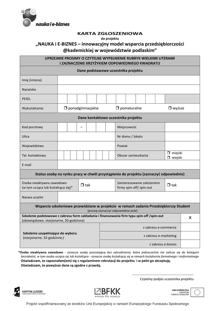 KARTA ZGŁOSZENIOWA do projektu „NAUKA i E-BIZNES – innowacyjny model wsparcia przedsiębiorczości @kademickiej w województwie podlaskim” UPRZEJMIE PROSIMY O CZYTELNE WYPEŁNIENIE RUBRYK WIELKIMI LITERAMI I ZAZNACZENIE KRZYŻYKIEM ODPOWIEDNIEGO KWADRATU Dane podstawowe uczestnika projektu Imię (imiona) Nazwisko PESEL Wykształcenie ponadgimnazjalne pomaturalne wyższe Dane kontaktowe uczestnika projektu Kod pocztowy – Miejscowość Ulica Nr domu / lokalu Województwo Powiat Tel. kontaktowy Obszar zamieszkania miejski wiejski E-mail Status osoby na rynku pracy w chwili przystąpienia do projektu (zaznaczyć odpowiednie) Osoba nieaktywna zawodowo (w tym ucząca lub kształcąca się)* tak Zainteresowanie założeniem firmy spin-off/ spin-out tak Nazwa uczelni Wsparcie szkoleniowe przewidziane w projekcie w ramach zadania Przedsiębiorczy Student (proszę zaznaczyć odpowiednie pole) Szkolenie podstawowe z zakresu form zakładania i finansowania firm typu spin-off /spin-out (obowiązkowe, stacjonarne, 20-godzinne) x z zakresu e-commerce Szkolenia uzupełniające do wyboru (stacjonarne, 32-godzinne,) z zakresu e-marketing z zakresu e-biznes *Osoba nieaktywna zawodowo - oznacza osobę pozostającą bez zatrudnienia, która jednocześnie nie zalicza się do kategorii bezrobotni, w tym osoba ucząca się lub kształcąca - oznacza osobę kształcącą się w ramach kształcenia formalnego i nieformalnego Oświadczam, że zapoznałam(em) się z regulaminem rekrutacji do projektu i w pełni go akceptuję. Oświadczam, że powyższe dane są zgodne z prawdą. …….…………….…………………………………………. Czytelny podpis uczestnika projektu OŚWIADCZENIE UCZESTNIKA PROJEKTU W związku z przystąpieniem do projektu p.n. „NAUKA i E-BIZNES – innowacyjny model wsparcia przedsiębiorczości @kademickiej w województwie podlaskim” oświadczam, że przyjmuję do wiadomości, iż: 1. Administratorem moich danych osobowych jest Minister Rozwoju Regionalnego pełniący funkcję Instytucji Zarządzającej dla Programu Operacyjnego Kapitał Ludzki, mający siedzibę przy ul. Wspólnej 2/4, 00-926 Warszawa; 2. Podstawę prawną przetwarzania moich danych osobowych stanowi art. 23 ust. 1 pkt 2 lub art. 27 ust. 2 pkt 2 ustawy z dnia 29 sierpnia 1997 r. o ochronie danych osobowych (tekst jednolity: Dz.U. z 2002 r. Nr 101 poz. 926, ze zm.) – dane osobowe są niezbędne dla realizacji Programu Operacyjnego Kapitał Ludzki; 3. Moje dane osobowe będą przetwarzane wyłącznie w celu udzielenia wsparcia, realizacji projektu „NAUKA i E-BIZNES – innowacyjny model wsparcia przedsiębiorczości @kademickiej w województwie podlaskim”, ewaluacji, kontroli, monitoring i sprawozdawczości w ramach Programu Operacyjnego Kapitał Ludzki (POKL); 4. Moje dane osobowe zostały powierzone do przetwarzania Instytucji Wdrażającej/Instytucji Pośredniczącej – Urząd Marszałkowski Województwa Podlaskiego Departament Europejskiego Funduszu Społecznego; ul. Poleska 89; 15-874 Białystok, beneficjentowi realizującemu projekt Białostockiej Fundacji Kształcenia Kadr, ul. Spółdzielcza 8, 15-441 Białystok. Moje dane osobowe mogą zostać udostępnione firmom badawczym realizującym na zlecenie Instytucji Zarządzającej POKL, Instytucji Wdrażającej/Instytucji Pośredniczącej lub beneficjenta badania ewaluacyjne w ramach POKL oraz specjalistycznym firmom realizującym na zlecenie Instytucji Zarządzającej POKL lub Instytucji Wdrażającej/Instytucji Pośredniczącej kontrole w ramach POKL; 5. Podanie danych jest dobrowolne, aczkolwiek odmowa ich podania jest równoznaczna z brakiem możliwości udzielenia wsparcia w ramach Projektu; 6. Mam prawo dostępu do treści swoich danych i ich poprawiania. …..………………………………………………..… Miejscowość i data …………………………………………………………………………………. Czytelny podpis uczestnika projektu