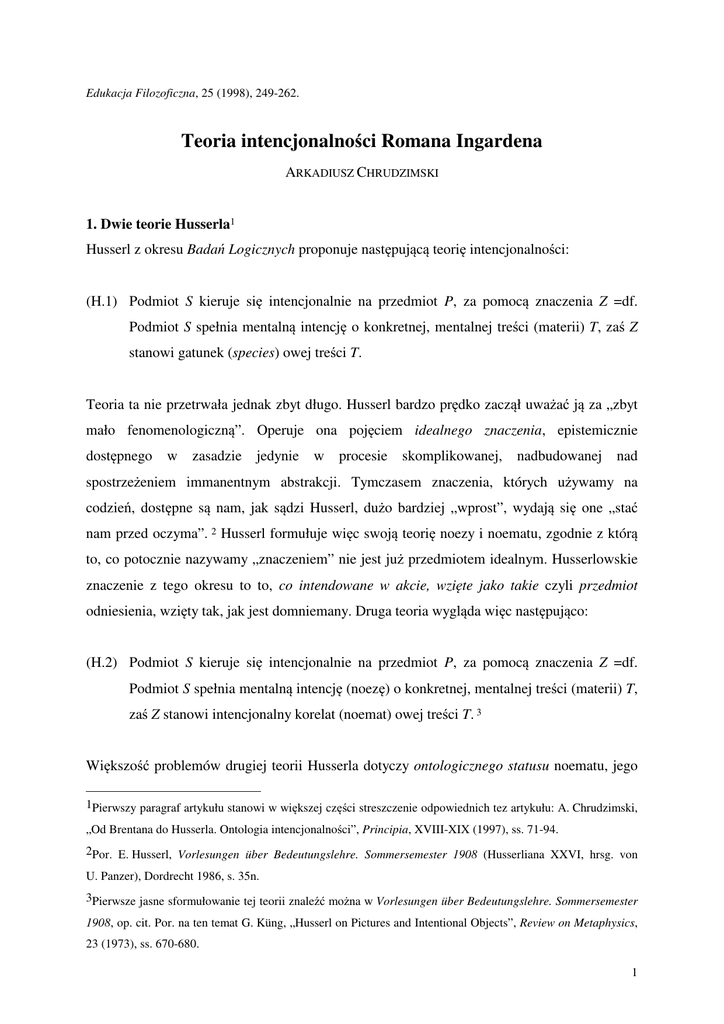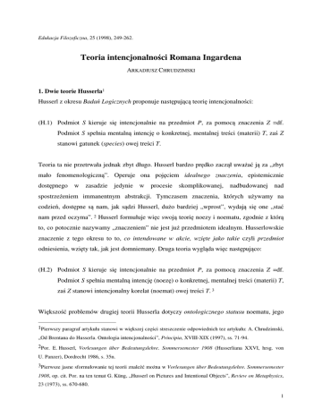 Edukacja Filozoficzna, 25 (1998), 249-262. Teoria intencjonalności Romana Ingardena ARKADIUSZ CHRUDZIMSKI 1. Dwie teorie Husserla1 Husserl z okresu Badań Logicznych proponuje następującą teorię intencjonalności: (H.1) Podmiot S kieruje się intencjonalnie na przedmiot P, za pomocą znaczenia Z =df. Podmiot S spełnia mentalną intencję o konkretnej, mentalnej treści (materii) T, zaś Z stanowi gatunek (species) owej treści T. Teoria ta nie przetrwała jednak zbyt długo. Husserl bardzo prędko zaczął uważać ją za „zbyt mało fenomenologiczną”. Operuje ona pojęciem idealnego znaczenia, epistemicznie dostępnego w zasadzie jedynie w procesie skomplikowanej, nadbudowanej nad spostrzeżeniem immanentnym abstrakcji. Tymczasem znaczenia, których używamy na codzień, dostępne są nam, jak sądzi Husserl, dużo bardziej „wprost”, wydają się one „stać nam przed oczyma”. 2 Husserl formułuje więc swoją teorię noezy i noematu, zgodnie z którą to, co potocznie nazywamy „znaczeniem” nie jest już przedmiotem idealnym. Husserlowskie znaczenie z tego okresu to to, co intendowane w akcie, wzięte jako takie czyli przedmiot odniesienia, wzięty tak, jak jest domniemany. Druga teoria wygląda więc następująco: (H.2) Podmiot S kieruje się intencjonalnie na przedmiot P, za pomocą znaczenia Z =df. Podmiot S spełnia mentalną intencję (noezę) o konkretnej, mentalnej treści (materii) T, zaś Z stanowi intencjonalny korelat (noemat) owej treści T. 3 Większość problemów drugiej teorii Husserla dotyczy ontologicznego statusu noematu, jego 1Pierwszy paragraf artykułu stanowi w większej części streszczenie odpowiednich tez artykułu: A. Chrudzimski, „Od Brentana do Husserla. Ontologia intencjonalności”, Principia, XVIII-XIX (1997), ss. 71-94. 2Por. E. Husserl, Vorlesungen über Bedeutungslehre. Sommersemester 1908 (Husserliana XXVI, hrsg. von U. Panzer), Dordrecht 1986, s. 35n. 3Pierwsze jasne sformułowanie tej teorii znaleźć można w Vorlesungen über Bedeutungslehre. Sommersemester 1908, op. cit. Por. na ten temat G. Küng, „Husserl on Pictures and Intentional Objects”, Review on Metaphysics, 23 (1973), ss. 670-680. 1 miejsca w strukturze odniesienia intencjonalnego oraz stosunku, w jakim stać miałby do noematu ewentualny „transcendentny” przedmiot odniesienia. (1) Noemat, rozumiany jako intencjonalny korelat możliwej intencji4 może być traktowany jako przedmiot Meinongowski.5 Byłby on w tym ujęciu czymś, co musiałoby istnieć (czy zachodzić) w świecie, jeśli dana intencja miałaby być „trafna” czy „prawdziwa”. W takim wypadku noemat stanowi cel intencji. (2) Zgodnie z wieloma oświadczeniami Husserla wydaje się jednak, że noemat może być w równie uprawniony sposób traktowany raczej jako „zapośredniczenie”, a nie cel intencji.6 (3) Ważne fragmenty sugerują wreszcie, że noemat jest przedmiotem wytworzonym w jakiś sposób przez akt świadomy, że mówienie o korelacji nie ma charakteru czysto logicznego, lecz oznaczać ma jakąś relację quasi-przyczynową. 2. Ingardenowska teoria przedmiotu czysto intencjonalnego Ingarden widział te niejasności i starał się je rozwiązać przez pewne przeformułowanie drugiej teorii Husserla, przy jednoczesnym zachowaniu podstawowych rysów odziedziczonej koncepcji. Swój odpowiednik Husserlowskiego noematu nazywa Ingarden przedmiotem czysto intencjonalnym, zaś za punkt wyjścia dla swej teorii przyjmuje ideę, że przedmiot ten, który pełni u niego zasadniczo, choć nie wyłącznie, rolę pośrednika, jest w swym istnieniu zależny od immanentnej treści intencji.7 U Ingardena jest zatem całkiem jasne, że istnieją wyłącznie te przedmioty intencjonalne, które odpowiadają aktualnym aktom. Nie są więc to przedmioty Meinongowskie, które są (w sensie Meinonga), niezależnie od tego, czy jakaś aktualna intencja „używa” ich, czy też nie. Z tego wynika jednak następny ważny punkt. Ingardenowski przedmiot intencjonalny ma być, jak powiedziano, dosłownie wytworzony przez akt. W takim jednak razie nie może on być rozumiany jako przedmiot aktu wzięty tak, jak jest on w akcie domniemany, nikt bowiem, być może z wyjątkiem fenomenologów, nie domniemuje tego rodzaju, mówiąc językiem 4Por. „Spostrzeżenie na przykład ma swój noemat, a u samego jego podłoża swój sens spostrzeżeniowy, tzn. to, co spostrzeżone, jako takie.”, E. Husserl, Idee czystej fenomenologii i fenomenologicznej filozofii, przeł. D. Gierulanka, Warszawa 1967, s. 182 (wg. paginacji wydania niemieckiego z 1913 roku). 5Por. w tej kwestii, A. Meinong, „Über Gegenstandstheorie”, in Gesamtausgabe, Bd. II, Graz 1971, ss. 481-535. 6Por.: „Każdy noemat ma `treść`, mianowicie swój `sens`, i odnosi się przezeń do `swego` przedmiotu.”, E. Husserl, Idee..., op. cit., s. 267. 7 Por. O dziele literackim, Warszawa 1960, s. 179; Spór o istnienie świata, wyd. D. Gierulanka, Warszawa 1985, tom II, część 1, s. 186. 2 Ingardena bytowo heteronomicznych,8 przedmiotów. Poza tym jednak przedmiot czysto intencjonalny musi, jeśli w ogóle ma spełnić swe zadanie, oddać sprawiedliwość również i tym intuicjom, które mówią o przedmiocie intencji wziętym tak, jak jest domniemany. Te właśnie intuicje są bowiem jedyną fenomenologiczną legitymacją dla wprowadzenia tego rodzaju bytów. W związku z tym dylematem formułuje Ingarden teorię dwóch szeregów własności przedmiotu czysto intencjonalnego. 9 Własności jednego rodzaju dotyczą przedmiotu intencjonalnego jako takiego. Do nich należy np. bycie wytworzonym przez akt, bycie epistemicznie dostępnym jedynie w pewnym specjalnym nastawieniu fenomenologicznym, a także pewna niezwykła, a zarazem kluczowa dla teorii intencjonalności cecha, polegająca na posiadaniu zawartości. To zawartość przedmiotu czysto intencjonalnego jest tym, co fenomenologicznie „stoi nam przed oczyma”, gdy pozostajemy w na