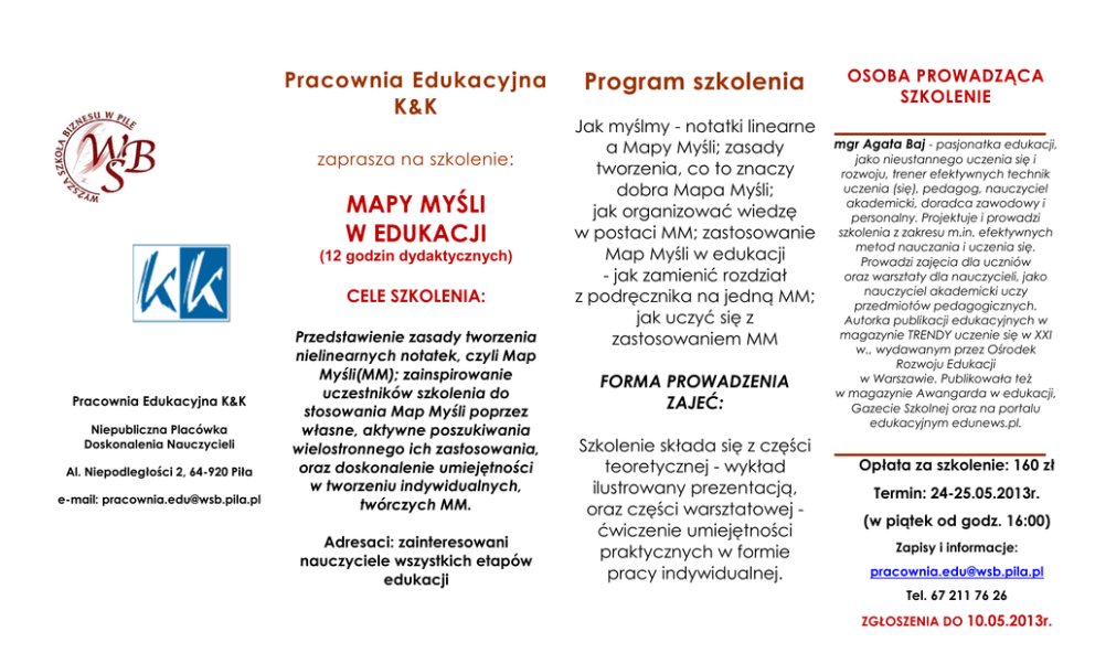 Pracownia Edukacyjna K&K zaprasza na szkolenie: MAPY MYŚLI W EDUKACJI (12 godzin dydaktycznych) CELE SZKOLENIA: Pracownia Edukacyjna K&K Niepubliczna Placówka Doskonalenia Nauczycieli Al. Niepodległości 2, 64-920 Piła e-mail: [email protected] Przedstawienie zasady tworzenia nielinearnych notatek, czyli Map Myśli(MM); zainspirowanie uczestników szkolenia do stosowania Map Myśli poprzez własne, aktywne poszukiwania wielostronnego ich zastosowania, oraz doskonalenie umiejętności w tworzeniu indywidualnych, twórczych MM. Adresaci: zainteresowani nauczyciele wszystkich etapów edukacji Program szkolenia Jak myślmy - notatki linearne a Mapy Myśli; zasady tworzenia, co to znaczy dobra Mapa Myśli; jak organizować wiedzę w postaci MM; zastosowanie Map Myśli w edukacji - jak zamienić rozdział z podręcznika na jedną MM; jak uczyć się z zastosowaniem MM FORMA PROWADZENIA ZAJEĆ: Szkolenie składa się z części teoretycznej - wykład ilustrowany prezentacją, oraz części warsztatowej ćwiczenie umiejętności praktycznych w formie pracy indywidualnej. OSOBA PROWADZĄCA SZKOLENIE mgr Agata Baj - pasjonatka edukacji, jako nieustannego uczenia się i rozwoju, trener efektywnych technik uczenia (się), pedagog, nauczyciel akademicki, doradca zawodowy i personalny. Projektuje i prowadzi szkolenia z zakresu m.in. efektywnych metod nauczania i uczenia się. Prowadzi zajęcia dla uczniów oraz warsztaty dla nauczycieli, jako nauczyciel akademicki uczy przedmiotów pedagogicznych. Autorka publikacji edukacyjnych w magazynie TRENDY uczenie się w XXI w., wydawanym przez Ośrodek Rozwoju Edukacji w Warszawie. Publikowała też w magazynie Awangarda w edukacji, Gazecie Szkolnej oraz na portalu edukacyjnym edunews.pl. Opłata za szkolenie: 160 zł Termin: 24-25.05.2013r. (w piątek od godz. 16:00) Zapisy i informacje: [email protected] Tel. 67 211 76 26 ZGŁOSZENIA DO 10.05.2013r.