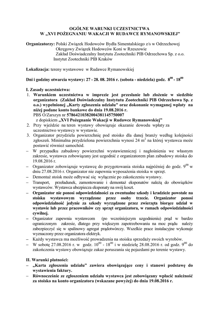 OGÓLNE WARUNKI UCZESTNICTWA W „XVI POŻEGNANIU WAKACJI W RUDAWCE RYMANOWSKIEJ” Organizatorzy: Polski Związek Hodowców Bydła Simentalskiego z/s w Odrzechowej Okręgowy Związek Hodowców Koni w Rzeszowie Zakład Doświadczalny Instytutu Zootechniki PIB Odrzechowa Sp. z o.o. Instytut Zootechniki PIB Kraków Lokalizacja: tereny wystawowe w Rudawce Rymanowskiej Dni i godziny otwarcia wystawy: 27 - 28. 08. 2016 r. (sobota - niedziela) godz. 800 - 1800 I. Zasady uczestnictwa: 1. Warunkiem uczestnictwa w imprezie jest przesłanie lub złożenie w siedzibie organizatora (Zakład Doświadczalny Instytutu Zootechniki PIB Odrzechowa Sp. z o.o.) wypełnionej „Karty zgłoszenia udziału" oraz dokonanie wymaganej wpłaty na niżej podane konto bankowe do dnia 19.08.2016 r. PBS O/Zarszyn nr 57864210382004381145750007 z dopiskiem „XVI Pożegnanie Wakacji w Rudawce Rymanowskiej” 2. Przy wjeździe na teren wystawy obowiązuje okazanie dowodu wpłaty za uczestnictwo wystawcy w wystawie. 3. Organizator przydziela powierzchnię pod stoisko dla danej branży według kolejności zgłoszeń. Minimalna przydzielona powierzchnia wynosi 24 m2 na której wystawca może postawić również samochód. W przypadku zabudowy powierzchni wystawienniczej i nagłośnienia we własnym zakresie, wystawca zobowiązany jest uzgodnić z organizatorem plan zabudowy stoiska do 19.08.2016 r. Organizator zobowiązuje wystawcę do przygotowania stoiska najpóźniej do godz. 900 w dniu 27.08.2016 r. Organizator nie zapewnia wyposażenia stoiska w sprzęt. Demontaż stoisk może odbywać się wyłącznie po zakończeniu wystawy. Transport, przeładunek, zamontowanie i demontaż eksponatów należą do obowiązków wystawców. Wystawca ubezpiecza eksponaty na swój koszt. Organizator nie ponosi odpowiedzialności za ewentualne szkody i kradzieże powstałe na stoisku wystawowym wyrządzone przez osoby trzecie. Organizator ponosi odpowiedzialność jedynie za szkody wyrządzone przez zwierzęta biorące udział w wystawie lub przez pracowników czy sprzęt organizatora, w ramach odpowiedzialności cywilnej. Organizator zapewnia wystawcom (po wcześniejszym uzgodnieniu) prąd w bardzo ograniczonym zakresie, dlatego przy większym zapotrzebowaniu na moc prądu należy zabezpieczyć się w spalinowy agregat prądotwórczy. Wszelkie prace instalacyjne wykonuje wyznaczony przez organizatora elektryk. Każdy wystawca ma możliwość prowadzenia na stoisku sprzedaży swoich wyrobów. W sobotę 27.08.2016 r. w godz. 1000 - 1800 i w niedzielę 28.08.2016 r. od godz. 900 do zakończenia wystawy obowiązuje zakaz poruszania się pojazdami po terenie wystawy. II. Warunki płatności: „Karta zgłoszenia udziału” zawiera obowiązujące ceny i stanowi podstawę do wystawienia faktury. Równocześnie ze zgłoszeniem udziału wystawca jest zobowiązany wpłacić należność za stoisko na konto organizatora (wskazane powyżej) do dnia 19.08.2016 r. W przypadku zaistnienia okoliczności uniemożliwiających przeprowadzenie Wystawy w podanym terminie, z przyczyn niezależnych od organizatora, wystawcy otrzymają zwrot dokonanych wpłat w pełnej wysokość. O rezygnacji z uczestnictwa wystawca jest zobowiązany powiadomić organizatora najpóźniej na 10 dni przed rozpoczęciem Wystawy. W przypadku późniejszej rezygnacji, wystawca ponosi koszt opłaty manipulacyjnej w wysokości 25 % wartości wszystkich zamówionych usług. III. Postanowienia końcowe: 1. Wszelkie reklamacje wystawców uczestniczących w wystawie wobec organizatora powinny być zgłaszane w formie pisemnej i będą rozpatrywane przez organizatora pod warunkiem ich zgłoszenia najpóźniej w dniu trwania wystawy (przed demontażem stoiska). 2. Organizator nie zapewnia wystawcom noclegów i posiłków. 3. Wystawca zobowiązuje się do przyjęcia warunków zawartych w Regulaminie z chwilą złożenia „Karty zgłoszenia udziału". Zgłoszenie jest ważne jeżeli widnieje na nim data i podpis lub pieczęć zgłaszającego. 4. Organizator zastrzega sobie prawo odwołania wystawy z przyczyn od niego niezależnych. IV. Wystawca zobowiązany jest do utrzymania czystości na stoisku oraz przestrzegania przepisów porządkowych, bhp i p.poż. na terenach wystawowych, a także do stosowania się do Regulaminu uczestnictwa w wystawie, który jest dostępny na stronie www.odrzechowa.izoo.krakow.pl oraz w siedzibie organizatora.